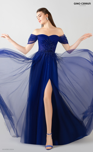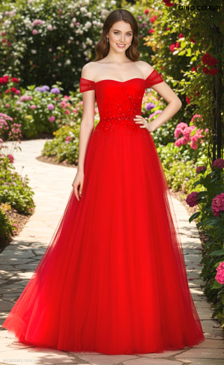 Hver piges drøm! Denne kjole er lige ud af et prinsesseeventyr med en fyldig nederdel, benudskæring og åbne skuldre. Perlearbejdet fremhæver taljen og skaber en fantastisk silhuet. Se, hvor smuk den ser ud, når du snurrer på dansegulvet – det er virkelig spektakulært! * Off-shoulder * Rynkede stropper og buste * Perlebesat talje * A-line nederdel * Benudskæring