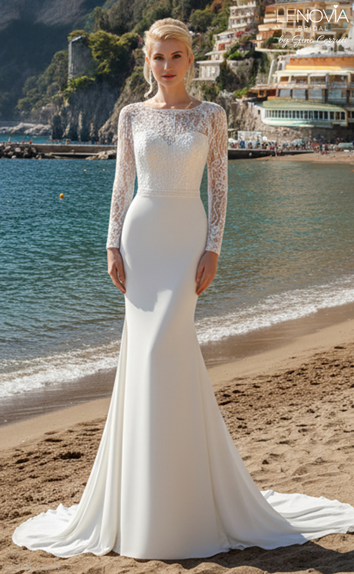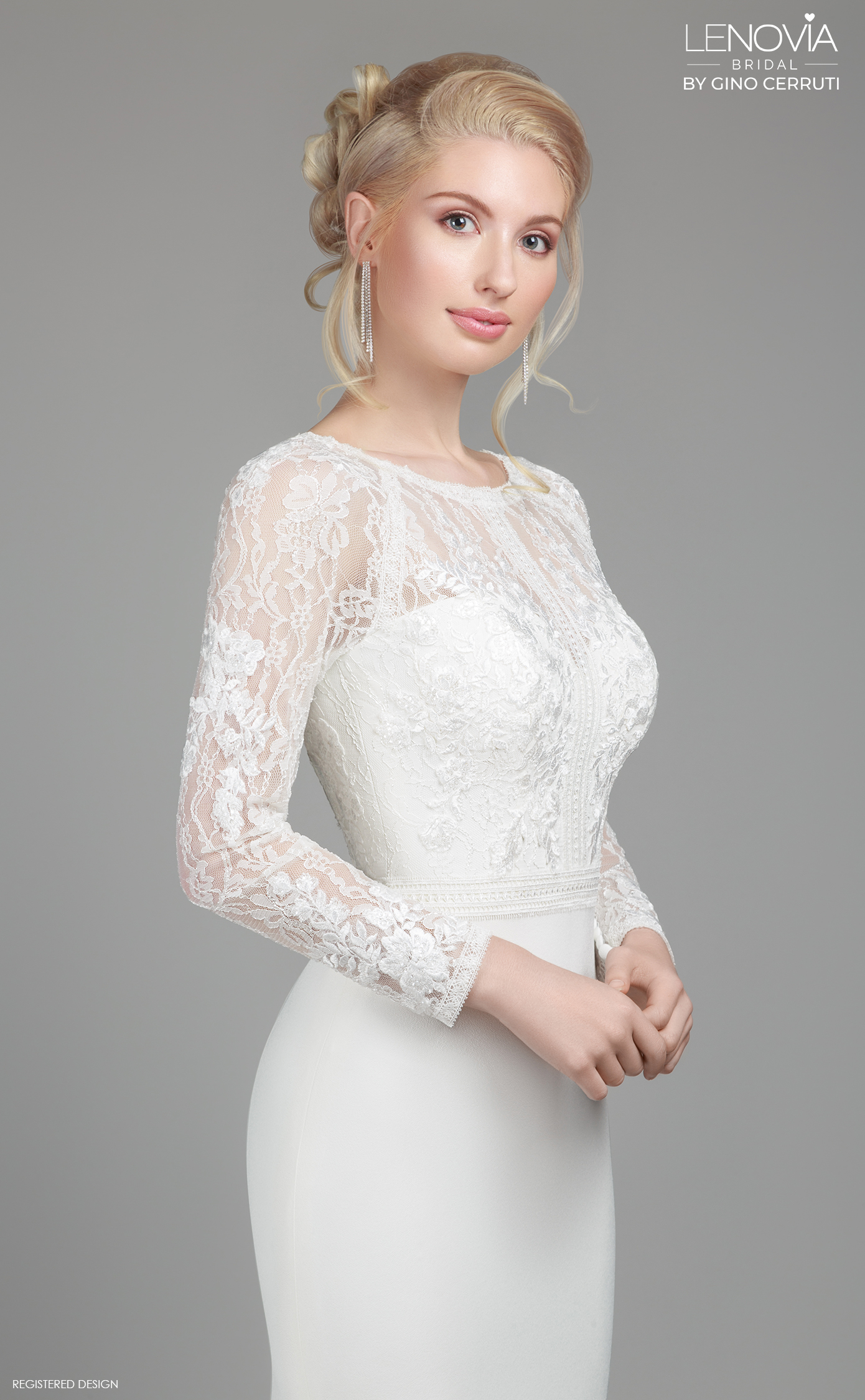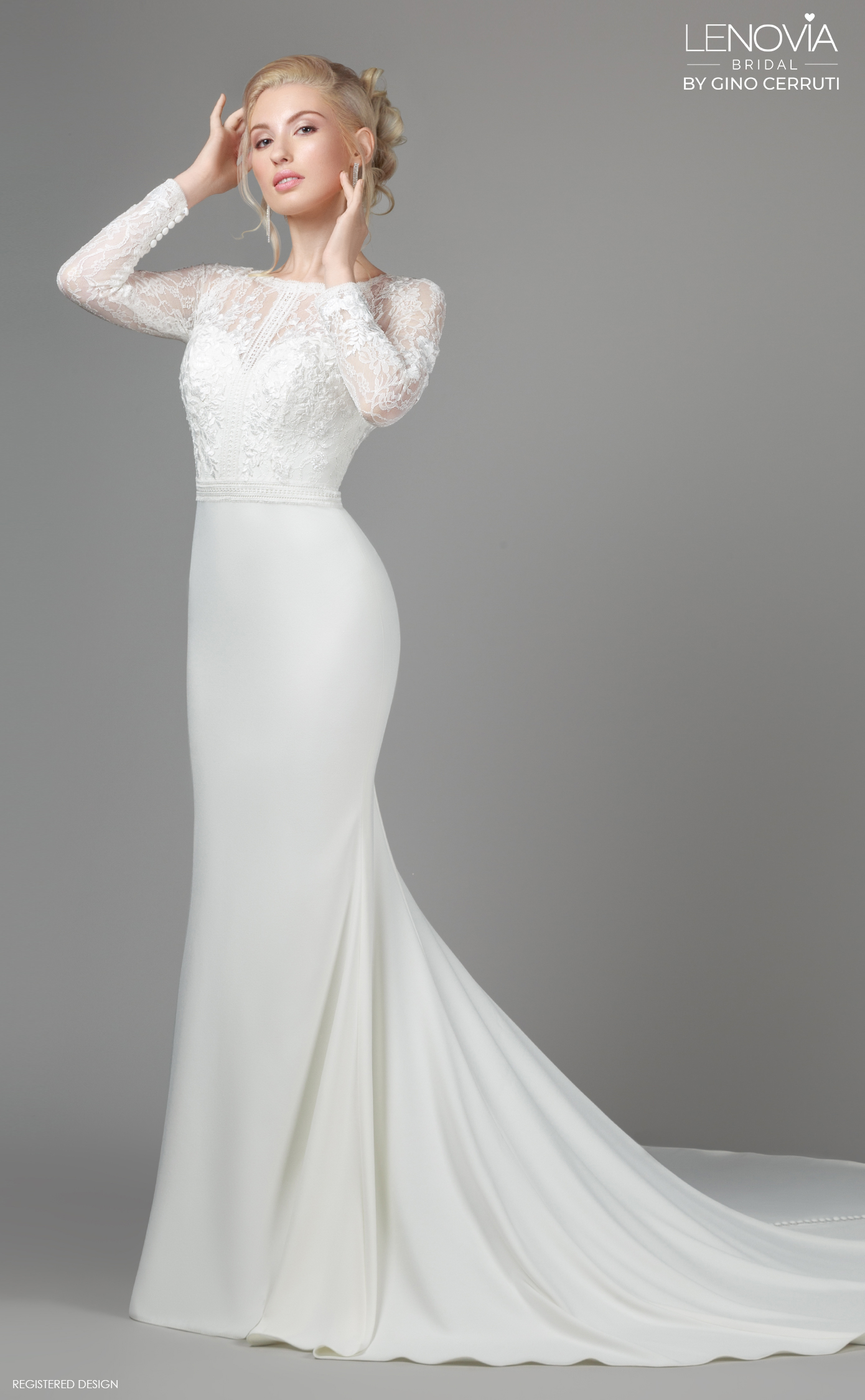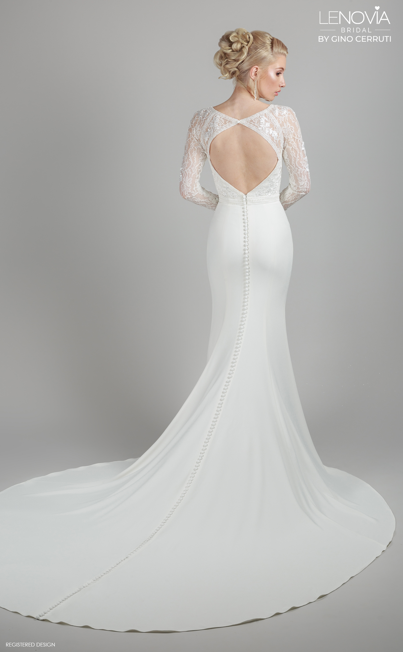 A stunning, sophisticated style with a high, boat neck and full length sleeves. The dramatic open back is the showstopper of this dress, completed with a 1m long train with button detailing to the hem. * High neck * Full length sleeves * Open, large keyhole back * Fit & flare silhouette * Centre back buttons * 1m train