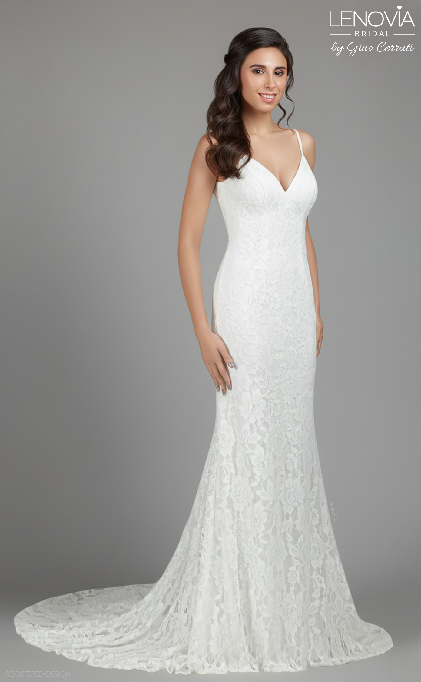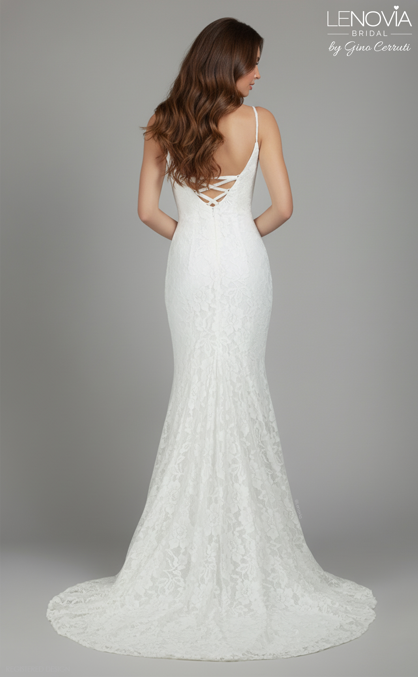 This fully lace dress is beautifully elegant. With a simple silhouette and a beautiful lace up back, this is the perfect dress for a destination wedding, both delicate and extraordinary. * Full lace overlay * Lace up back * Fishtail skirt * V neck bodice