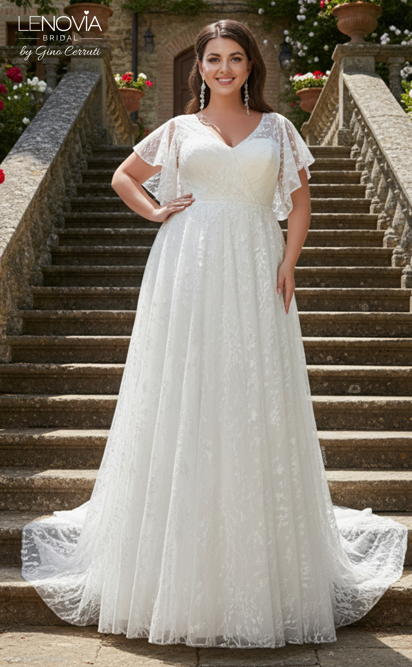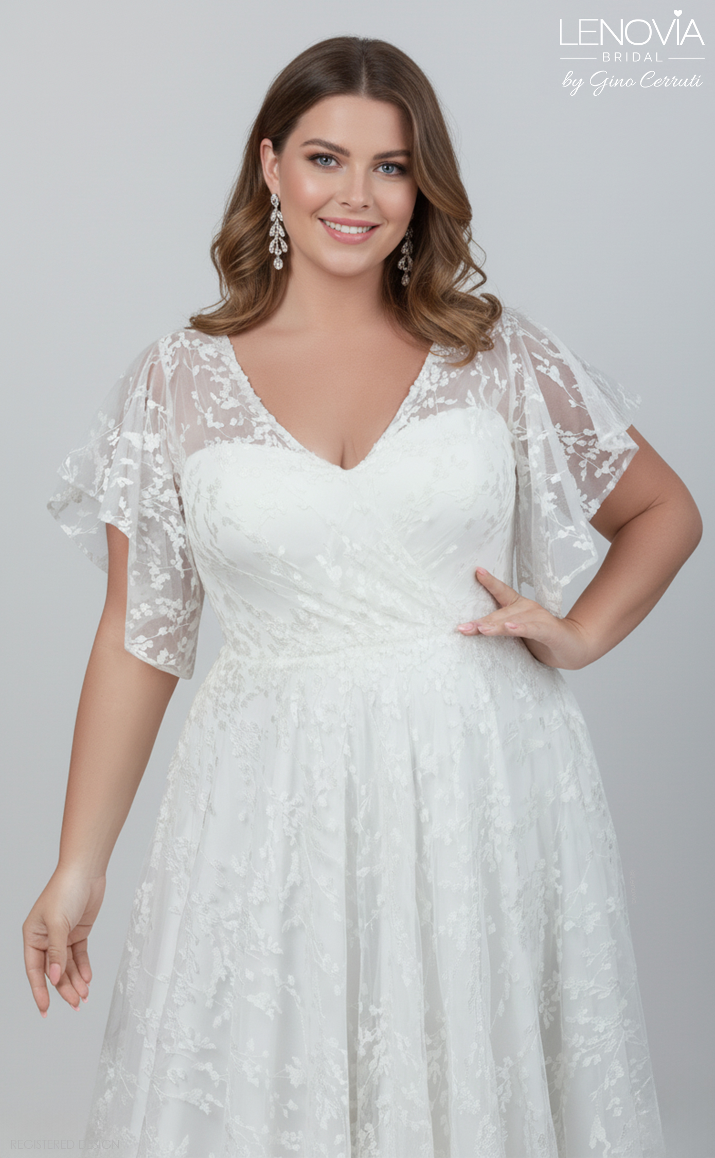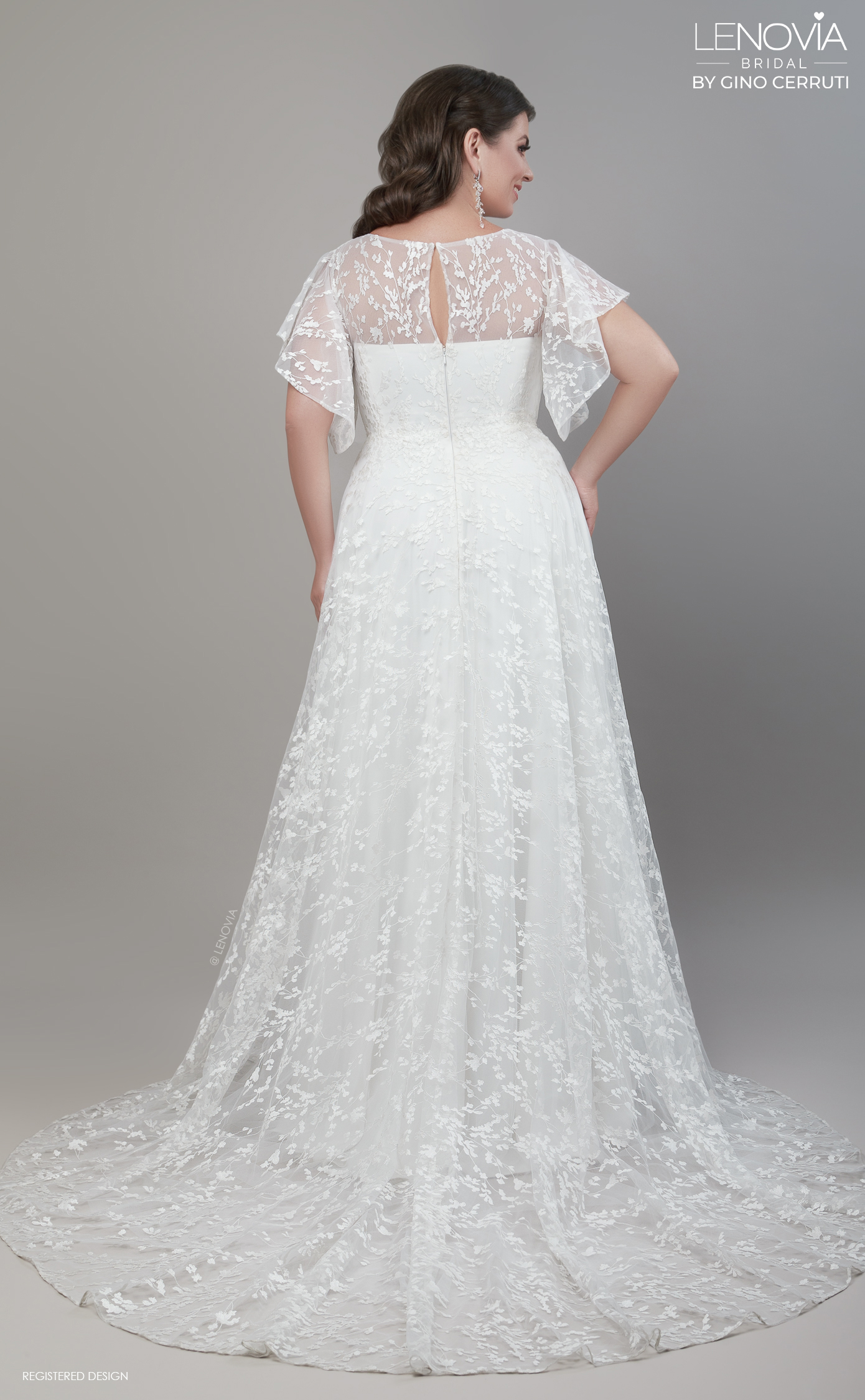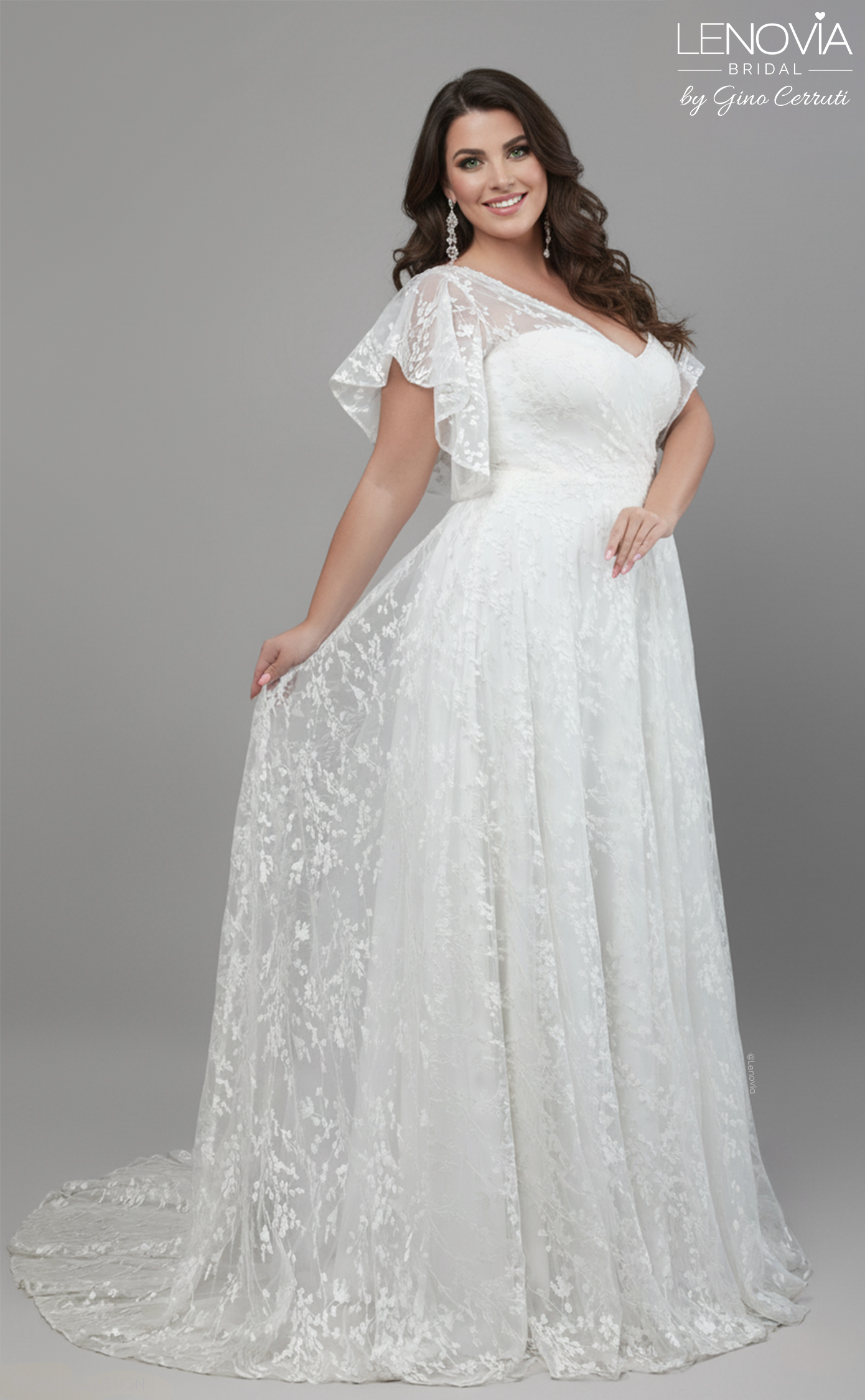 Dazzle your guests in this beautiful, butterfly-sleeved bridal gown. Cut from delicate lace this dress features a wrap front bodice and floaty a-line skirt designed to perfectly complement the figure. * A-line silhouette * V neck * Butterfly sleeves * Keyhole back * 50cm train