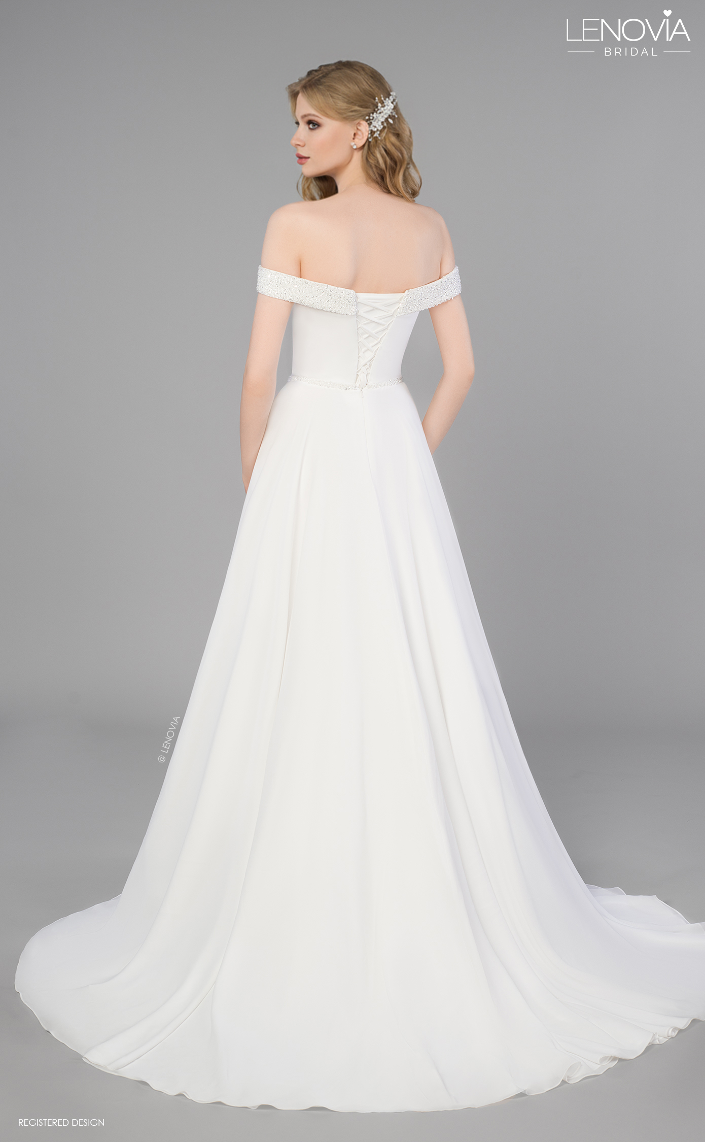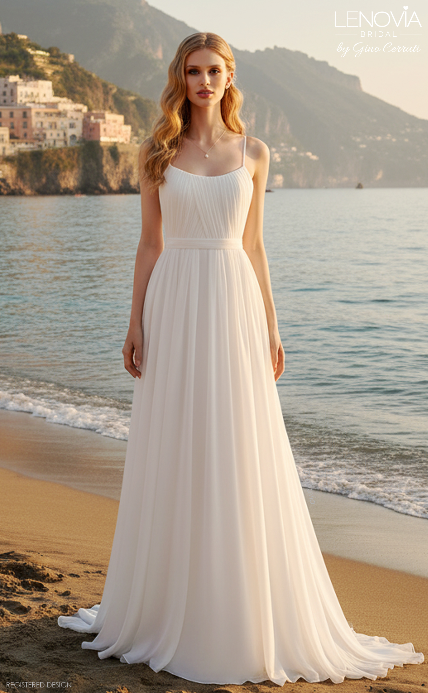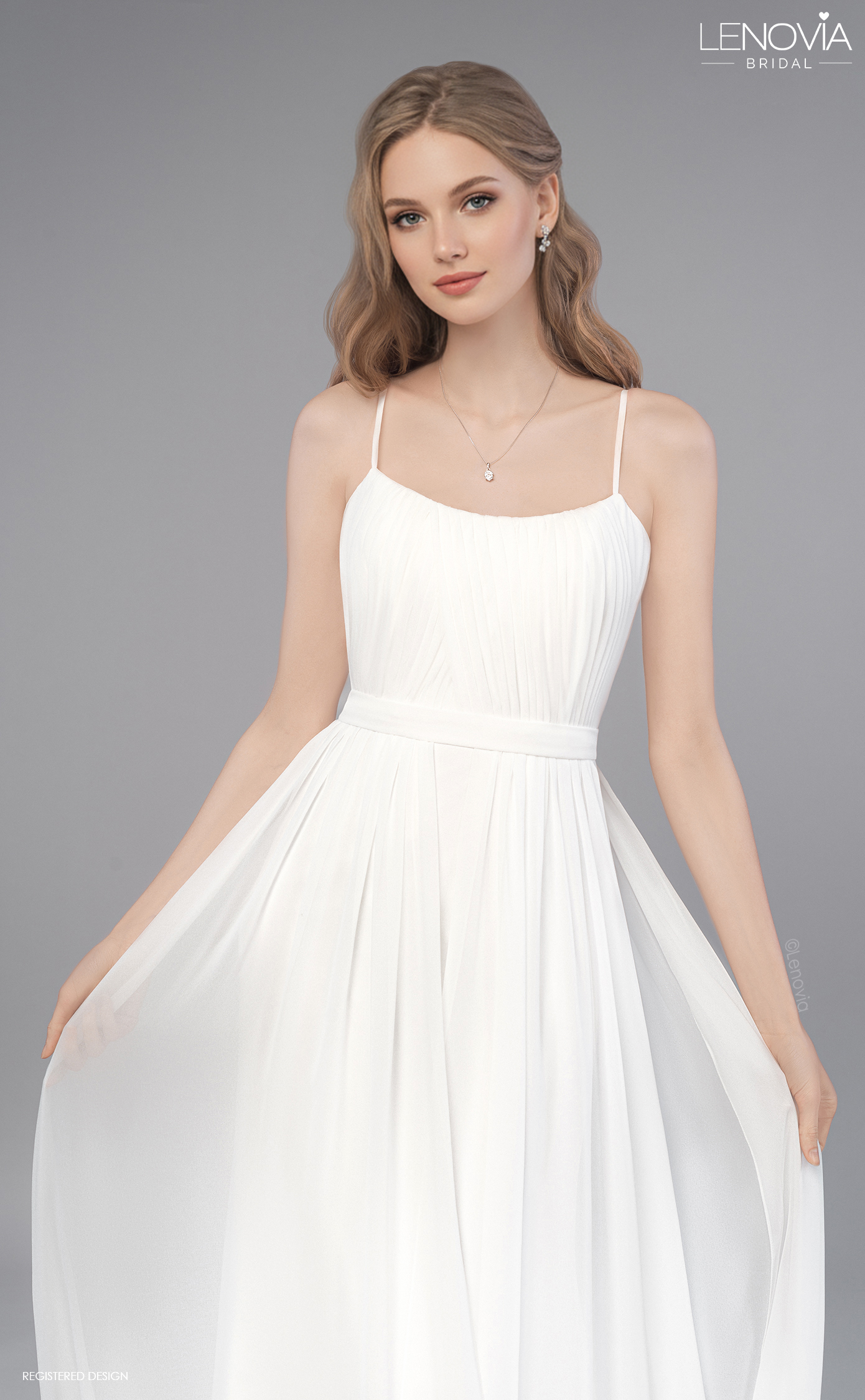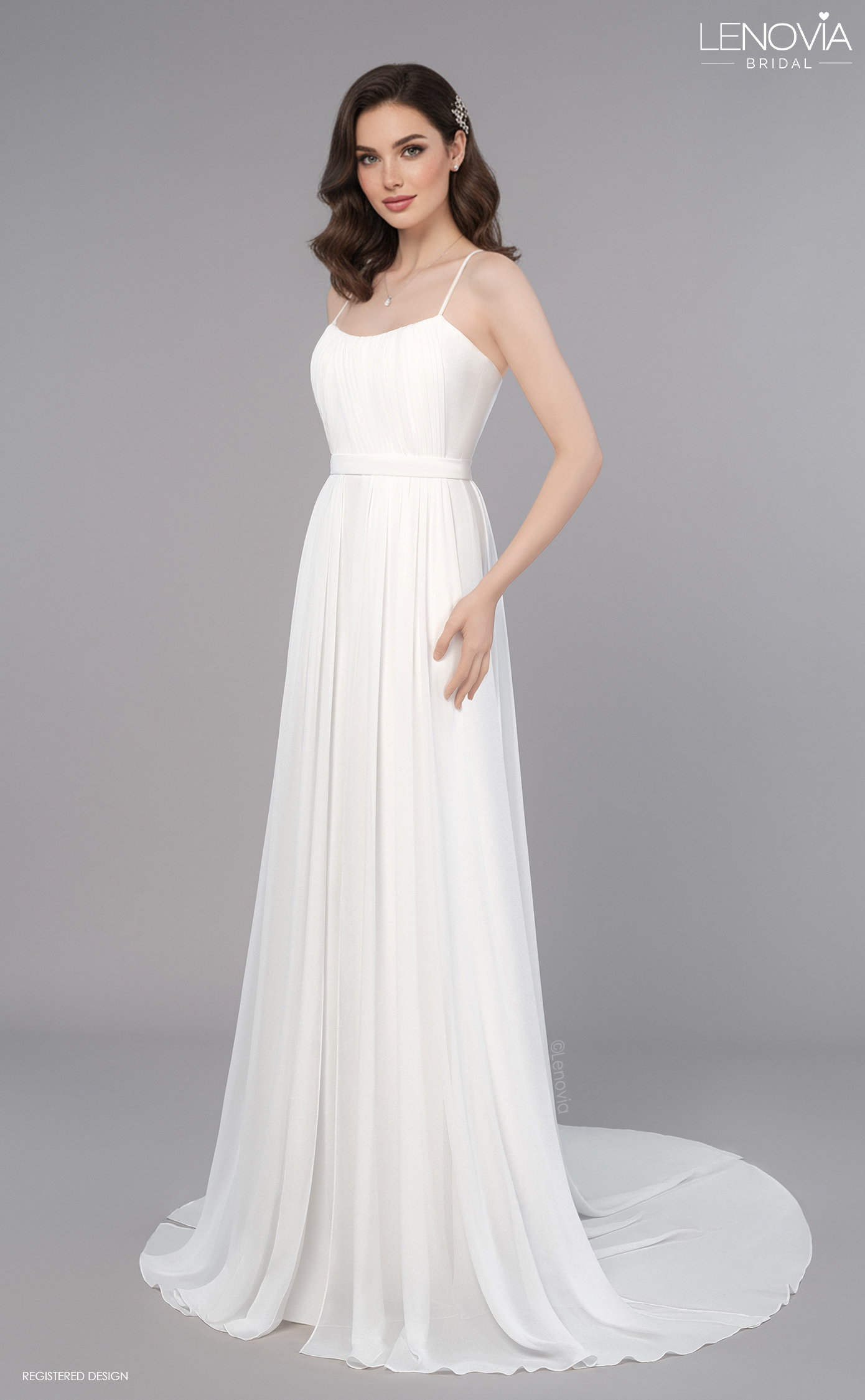 This intricate pleated bodice wraps around the bust in the most flattering way, before fading into a chiffon skirt and back into a double honors train. Slim strap accentuates the waist. Refined classic design! * A-line silhouette * Pleated chiffon layers * High neckline * Accented waistline * Long flow train"