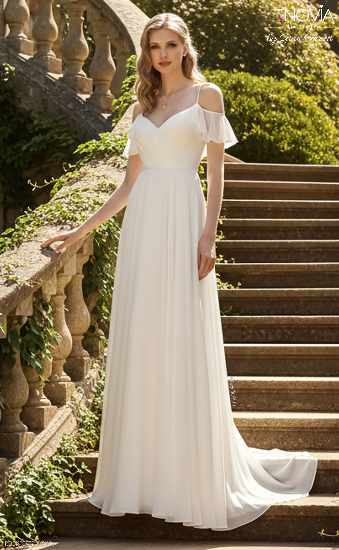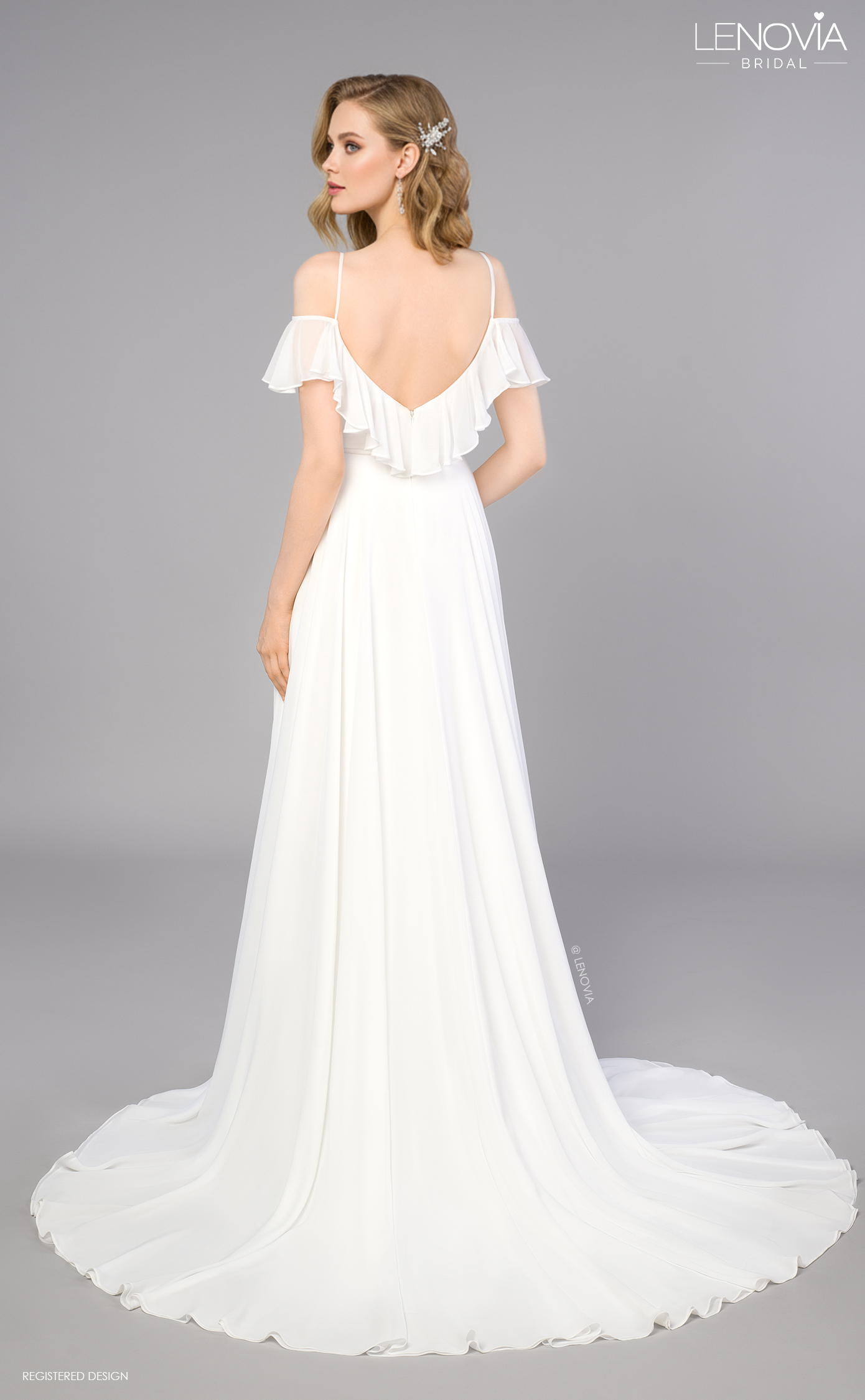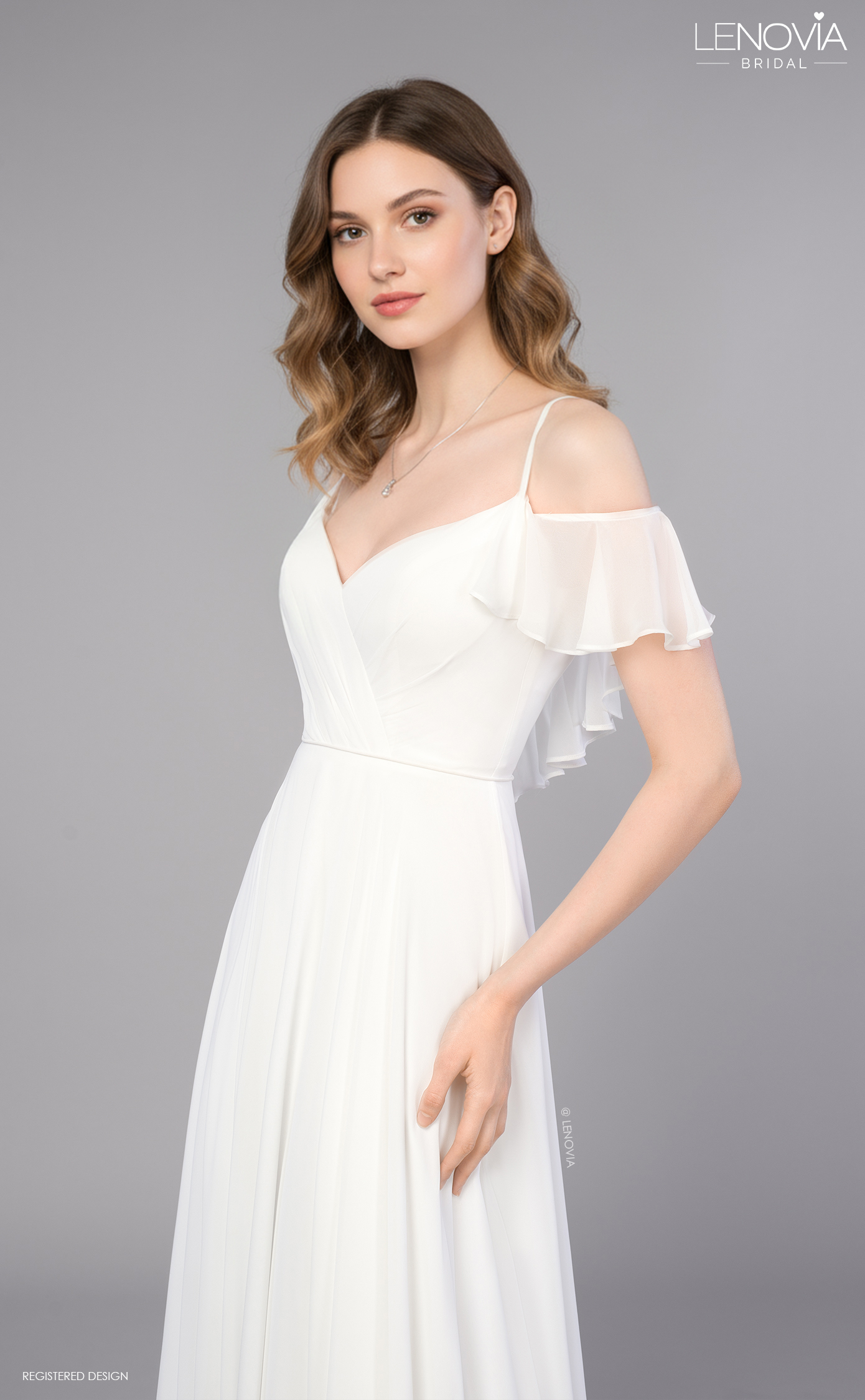 Adorable and enticing sums up this beautiful design. It's delicate straps are featured with a flutter frill and it's flowing skirt ties in well with the pleated bodice.It makes for the charming bride. ching elements * Thigh-high slit * Accented waist * V-shaped back