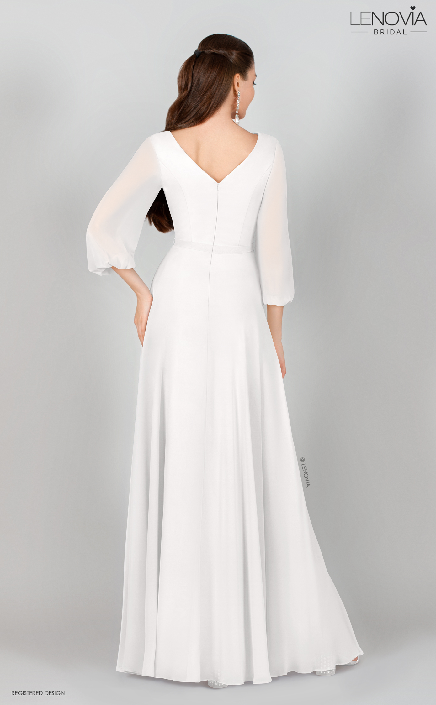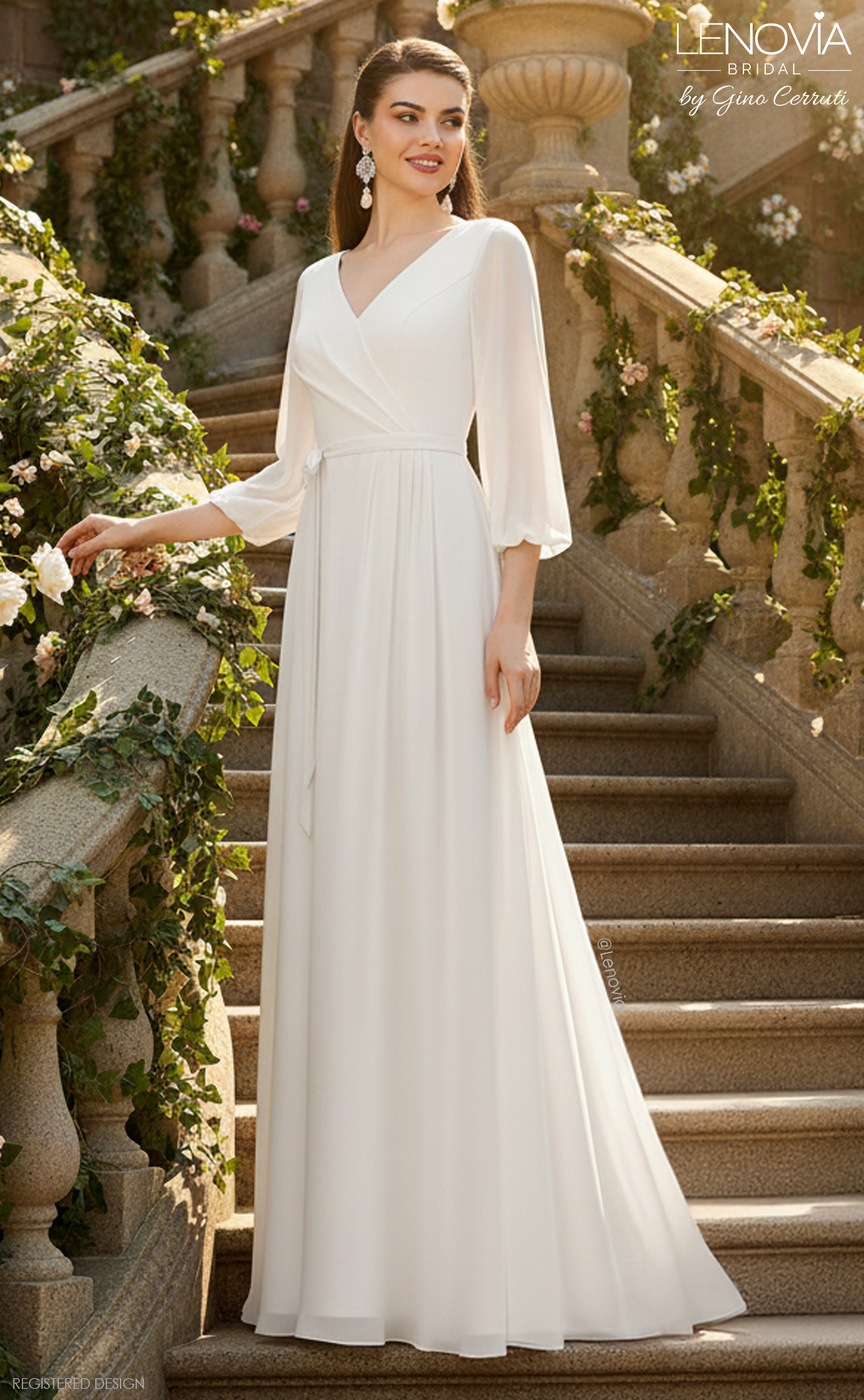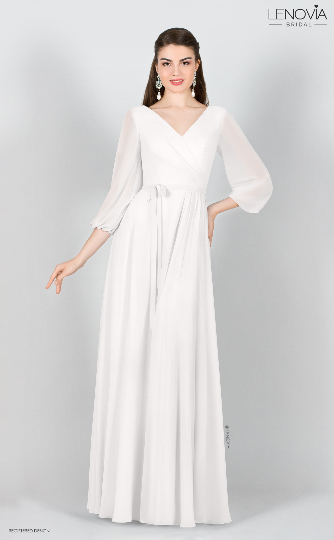 This ivory chiffon gown is elegant and sophisticated, with long floaty bishop sleeves and fitted bodice, detailed with subtle pleats that accentuate your waist. Tied with a charming bow, the skirt flows down to the floor in the most graceful way! A truly beautiful dress for a big day! • Pleated bodice • V-Neckline • Zip up back • A-line silhouette • Floor length • Bishop sleeve • pleated skirt