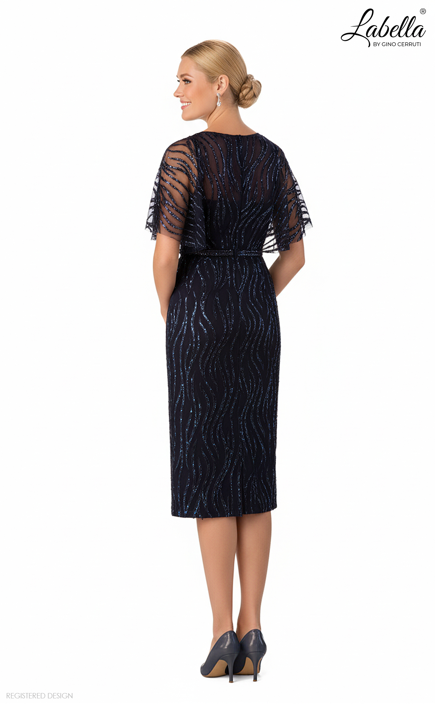 A beautiful shimmering dress, with elbow length, sheer butterfly sleeves that cinch into the waist, creating a beautiful hourglass silhouette. Paired with sheer detailing on the back, this is an elegant but eyecatching dress. * Form-fitting silhouette. * Metallic shimmer strip patterns. * cinched waist. * Sheer lace.. * Knee-length.