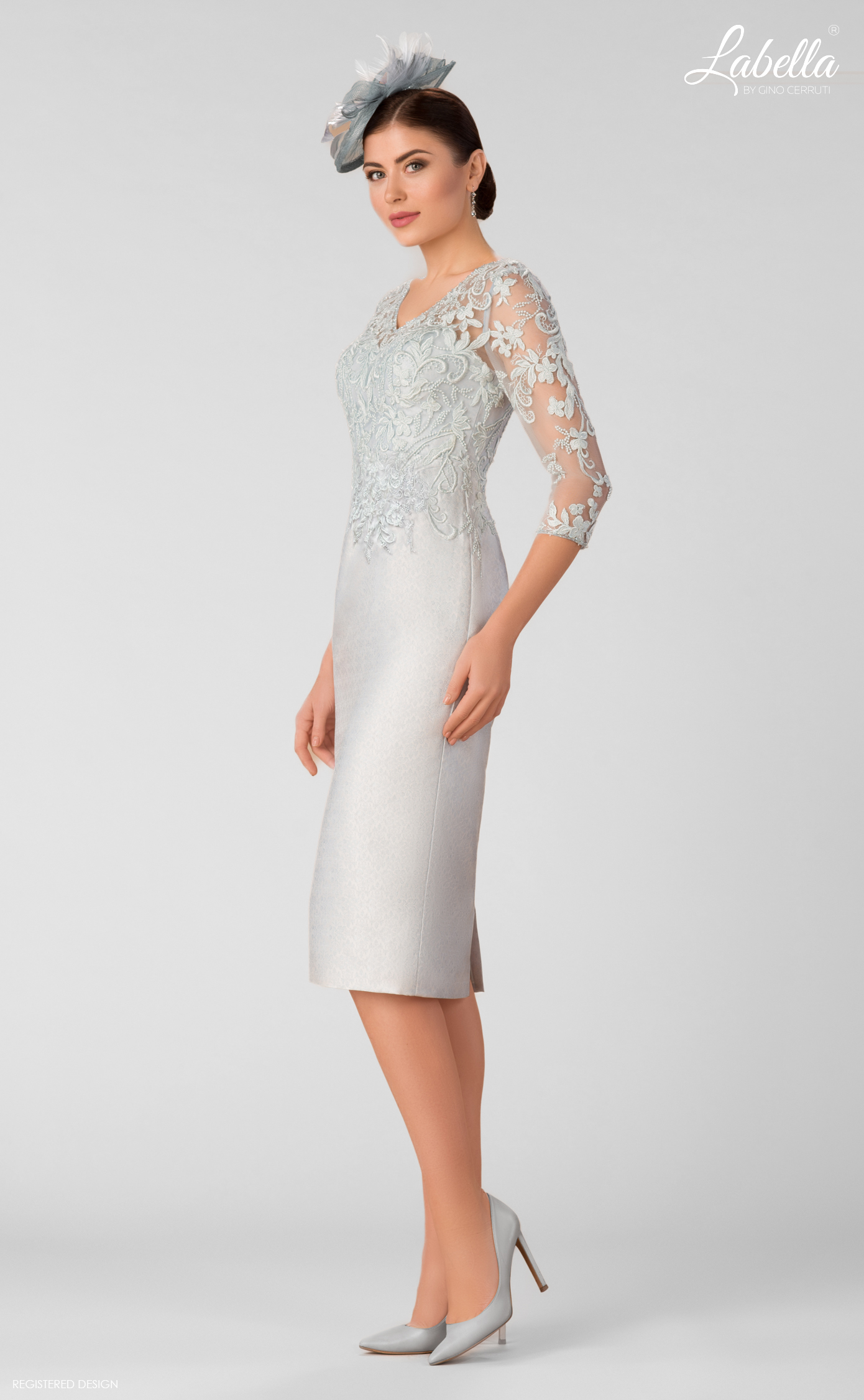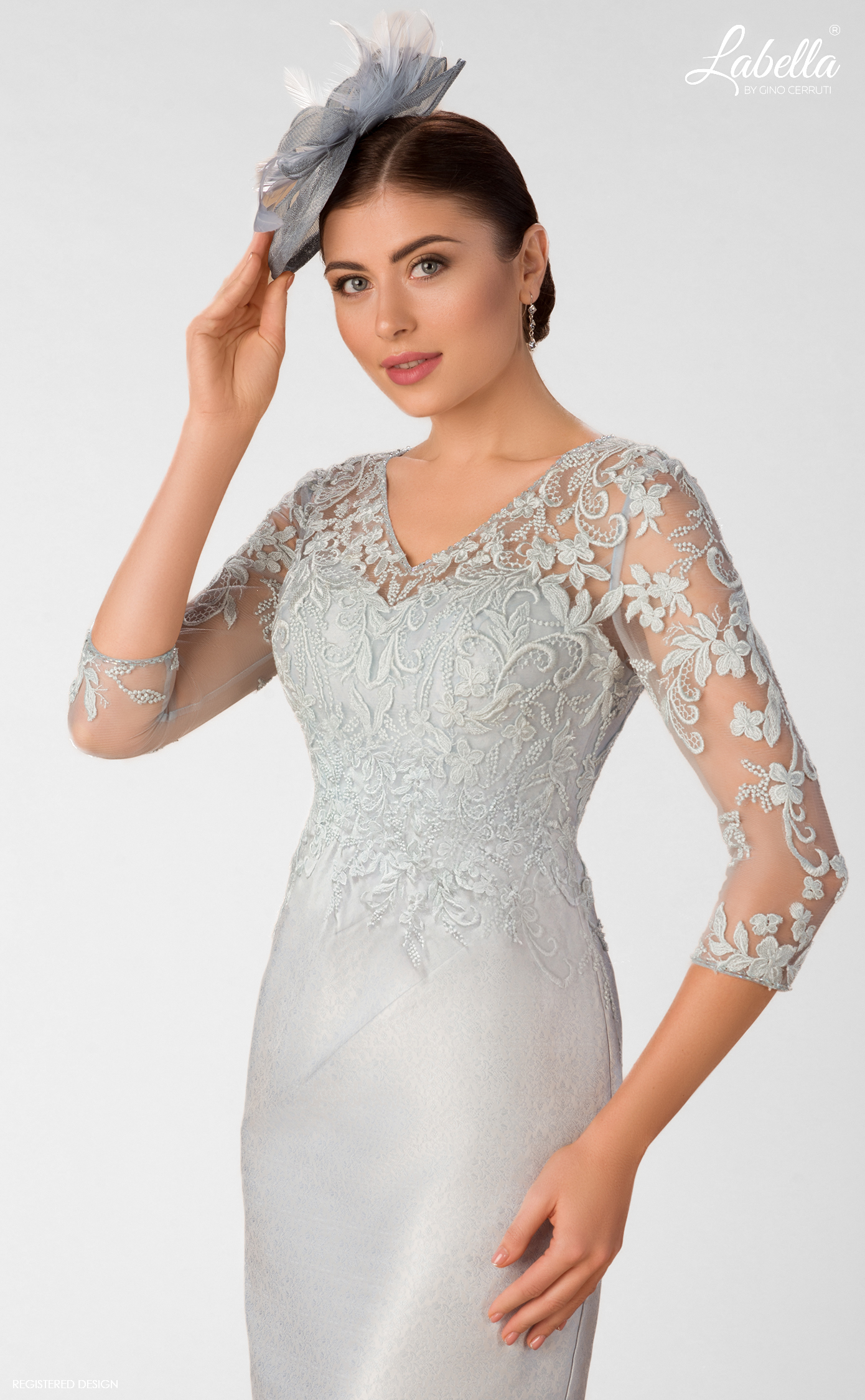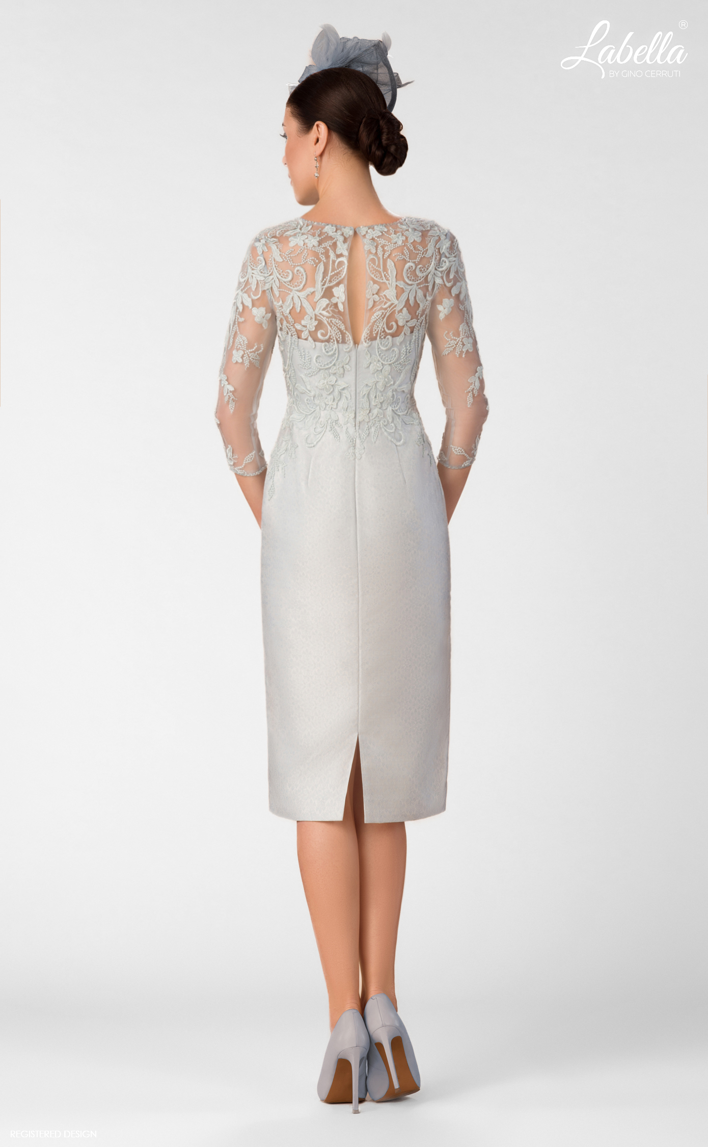 A stunning V-neck lace dress combined with a sophiscated jaquard base. Paired with a stunning sheer embroidered detailling on the uppper body. This sophiscated look allows comfort and movement through the key hole detail and the slit on the back of the dress. * Form-fitting silhouette * 3/4 length sleeves * Key hole * Embroidered * Knee-length