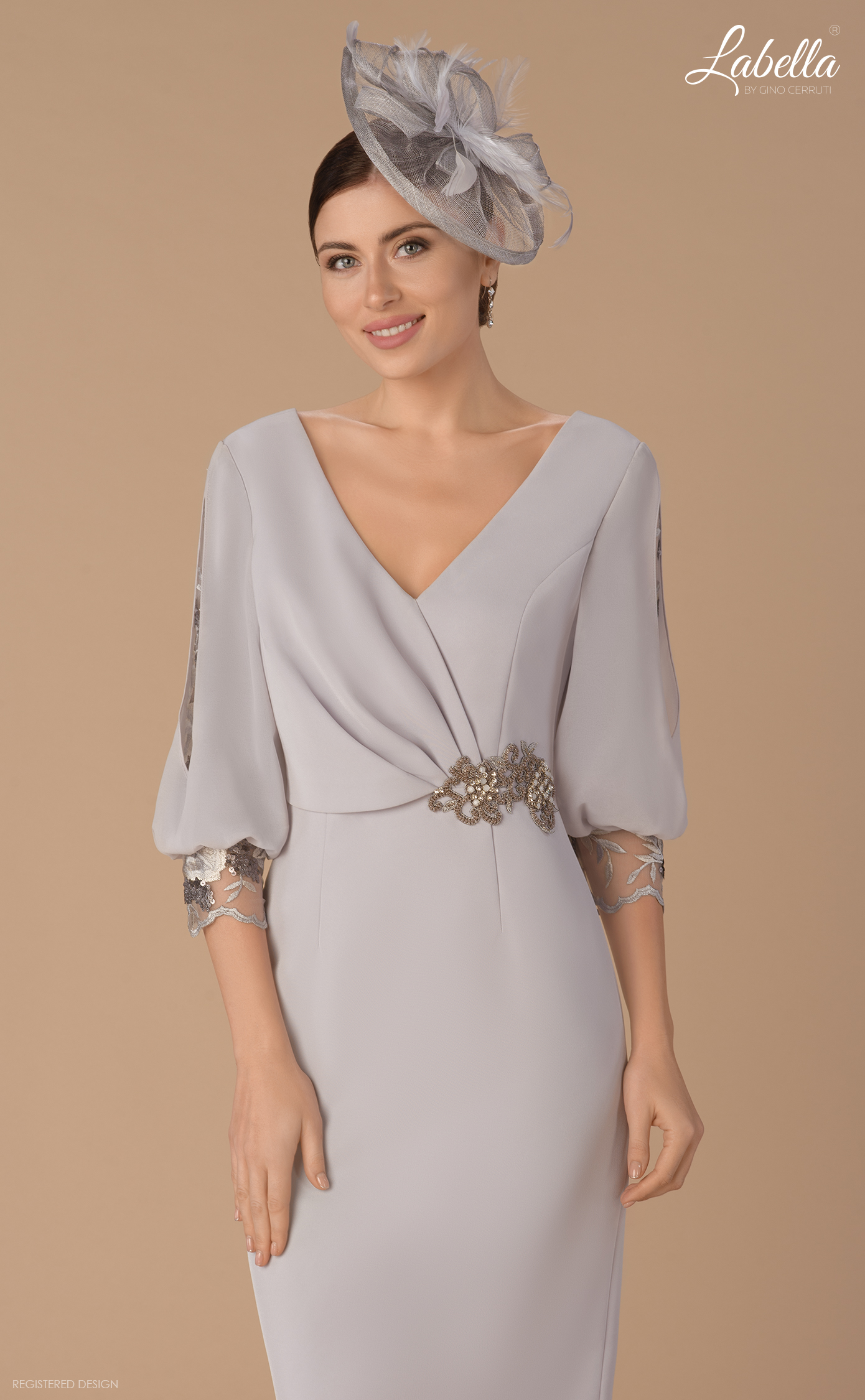 This beautiful feminine dress has a gathered crossover bodice to create a delicate V neck. With 3/4 sleeves that have slits to show lace underneath and a lace hem to the sleeves you will notice something new every time you look at it. Floral beading on the waist emphasises the flattering silhouette of this style. A V back reflects this shape on the front for an extra show of skin. * Crossover gathered front * Chiffon sleeves with slits to show lace underneath * Beading detail on waist * Knee-length crepe skirt