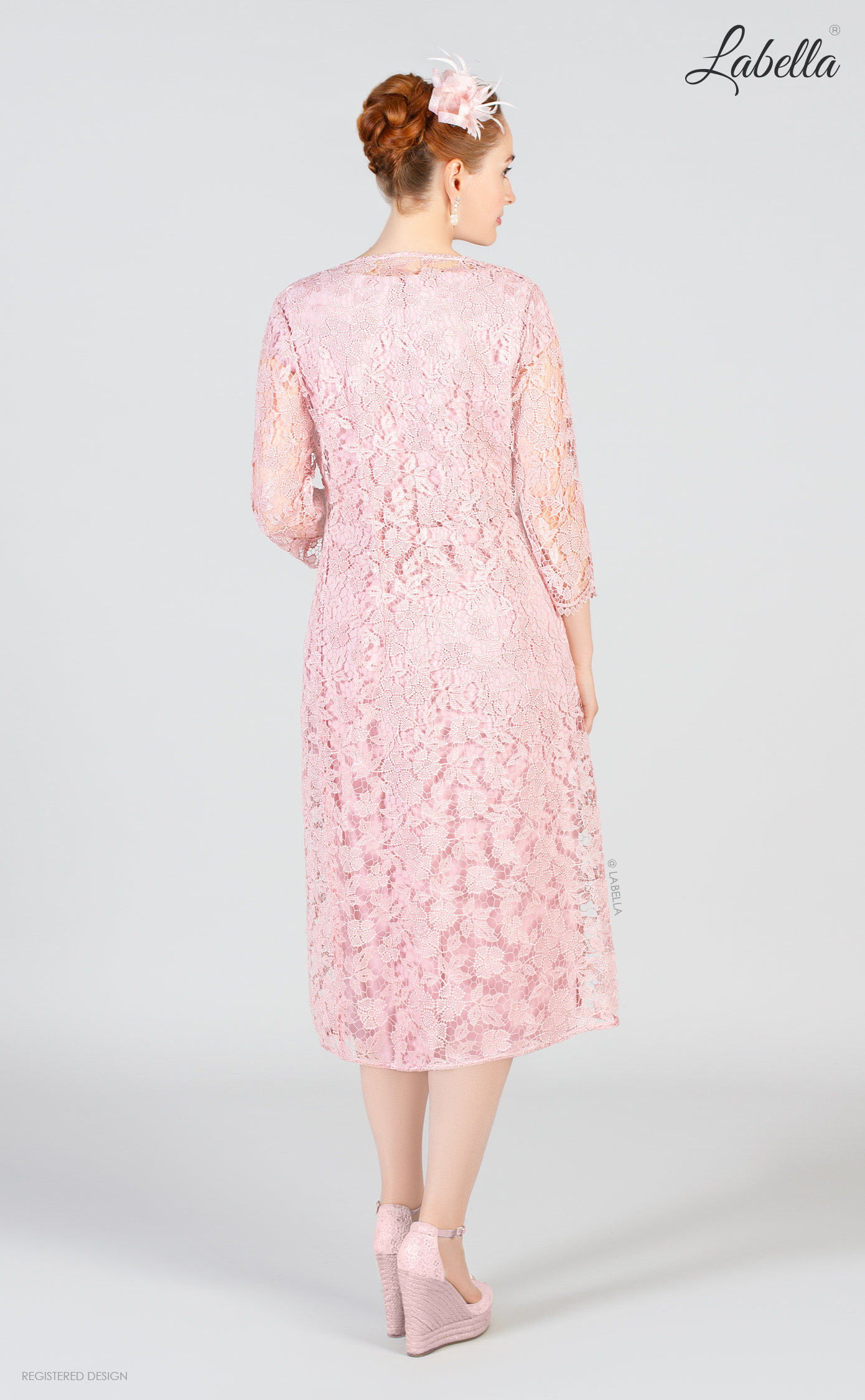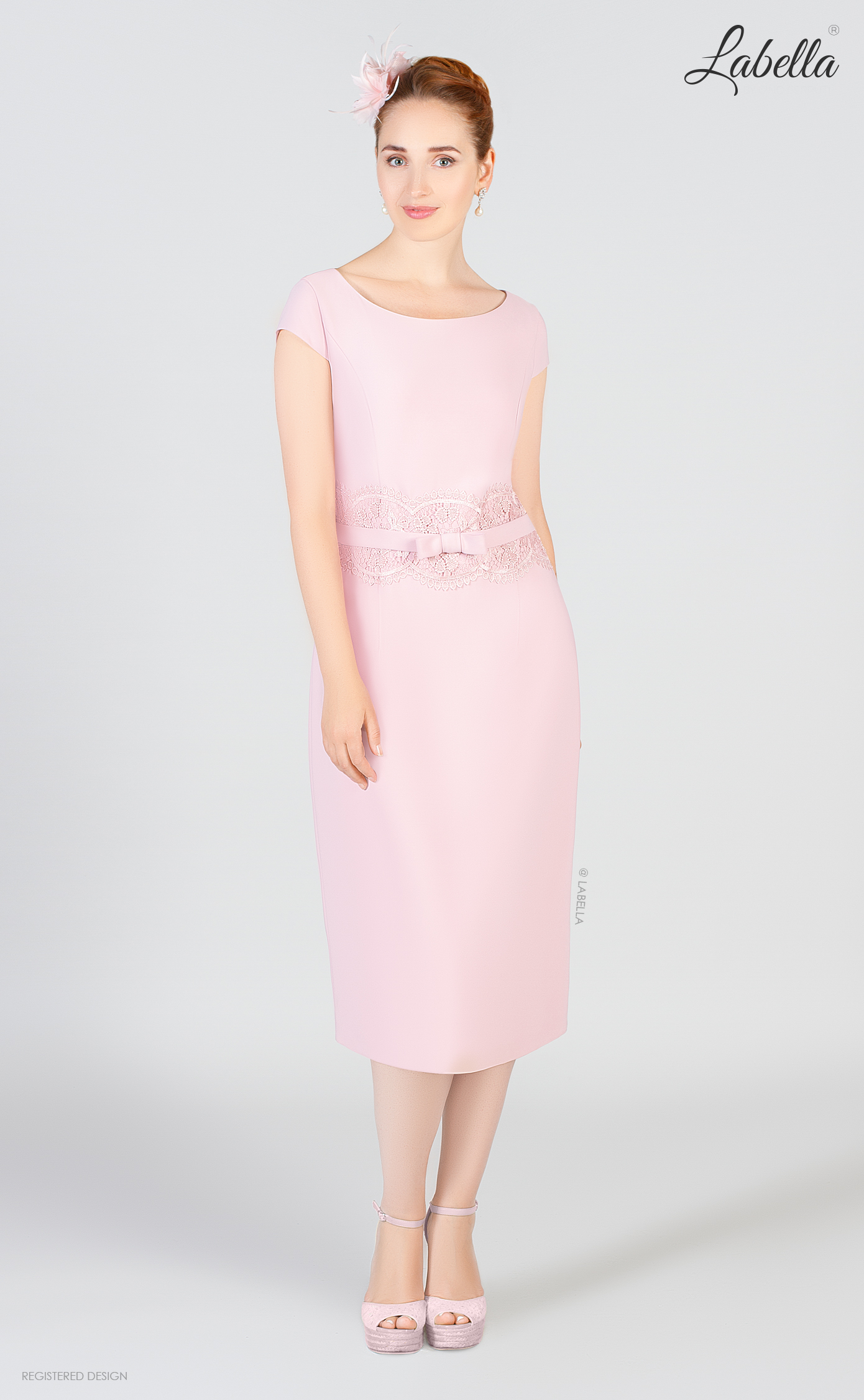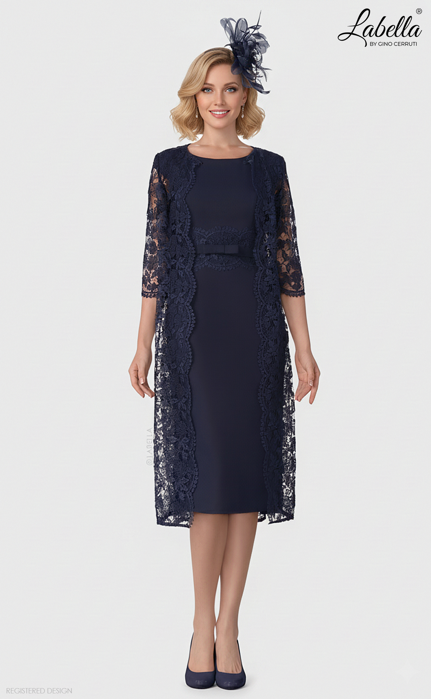 In need of a classic dress? Look no further! This dress features a cinched waist layered with lace and a ribbon belt, creating a flattering silhouette. The modest design is complemented by a lightweight lace jacket, while the beautiful crepe fabric contrasts elegantly with the lace, resulting in a fabulously sophisticated look. * Bow ribbon on waist * Knee-length * Form-fitting silhouette * Matching lace jacket