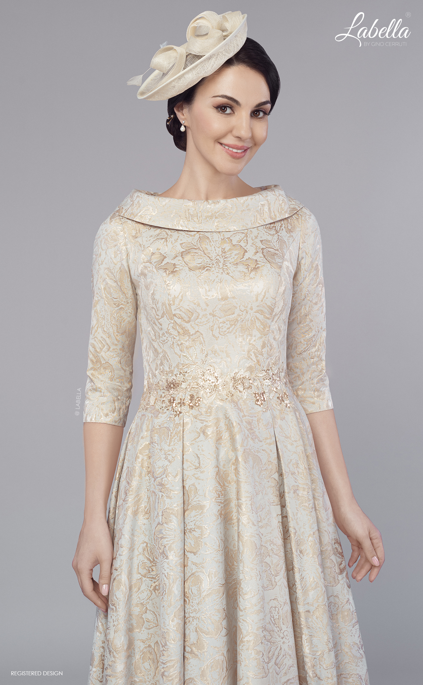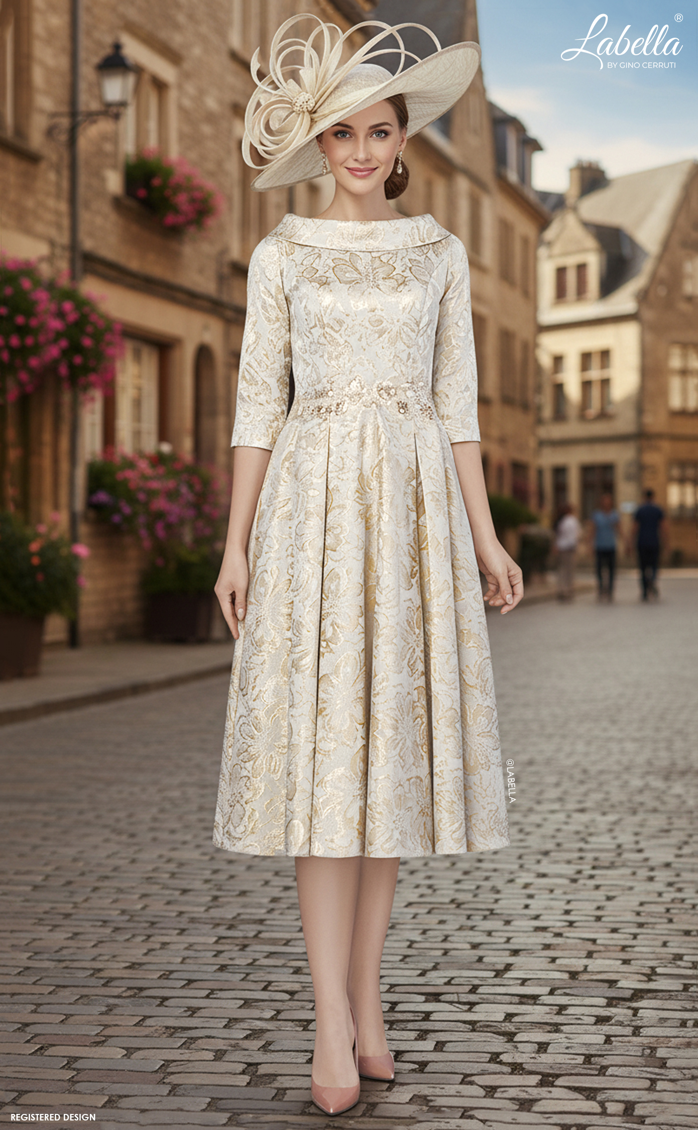 Going all out jacquard! This stunning metallic jacquard catches the eye and allows for a beautifully structured, pleated knee length skirt. A wide boat neck collar flatters the neckline, with 3/4 length sleeves that are perfect for summer evenings. With lace detailing to accentuate the waist, it's the perfect combination of sophistication and statement. * Wide boat neck collar * Lace waist detailing * 3/4 length sleeves * Box pleat knee length skirt