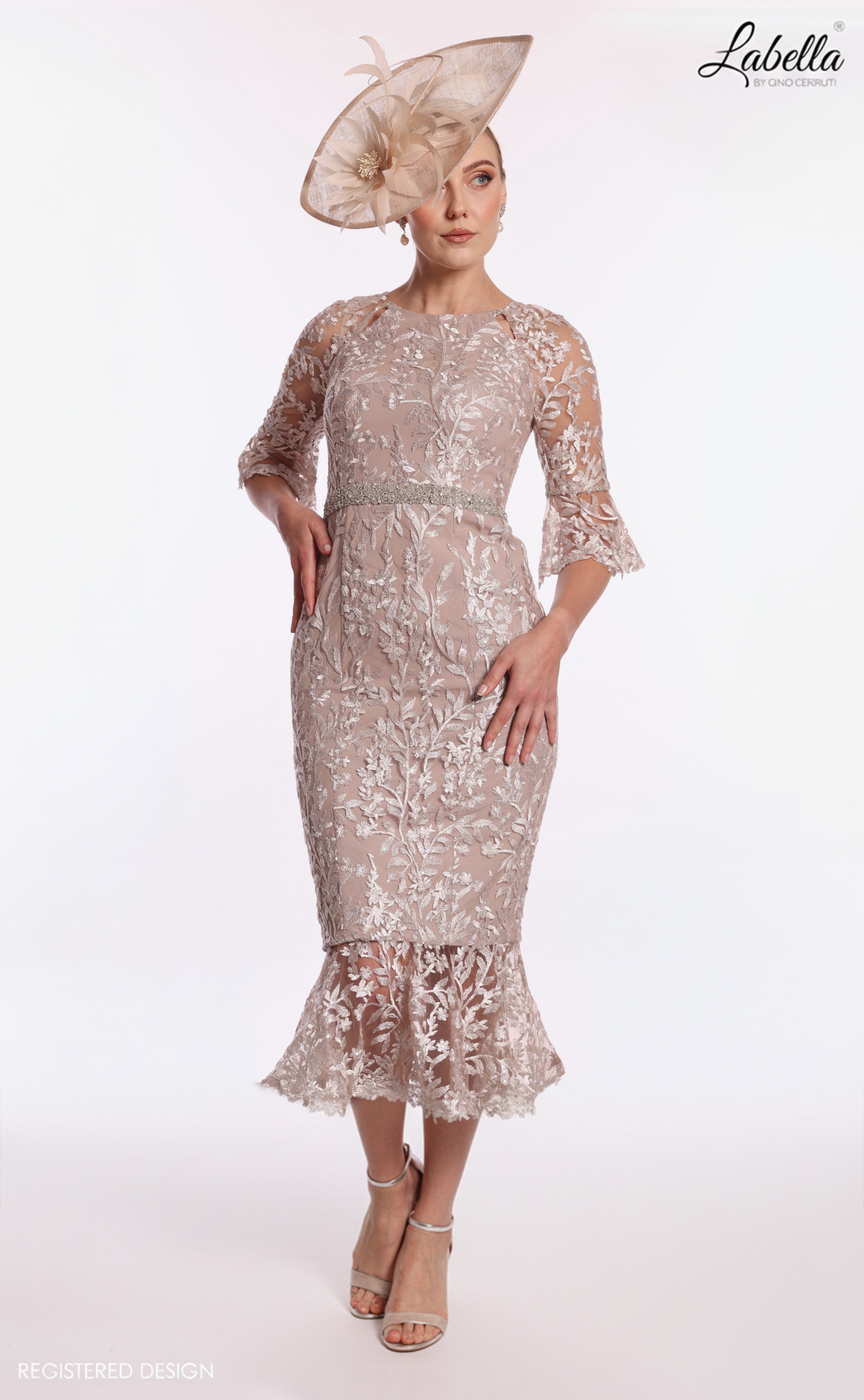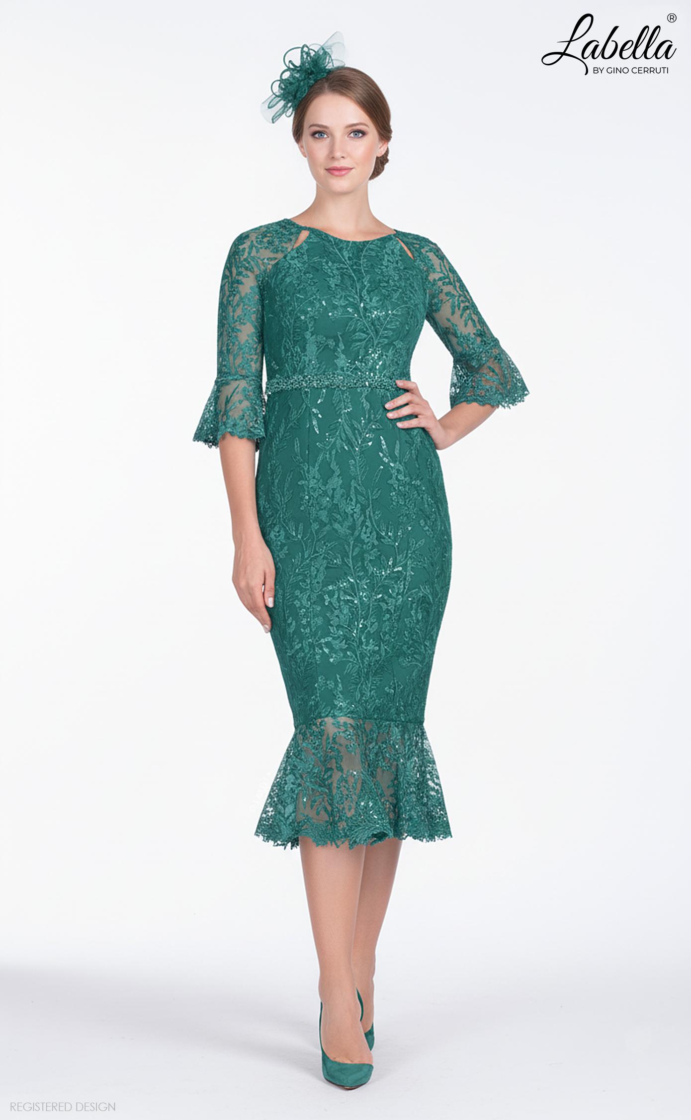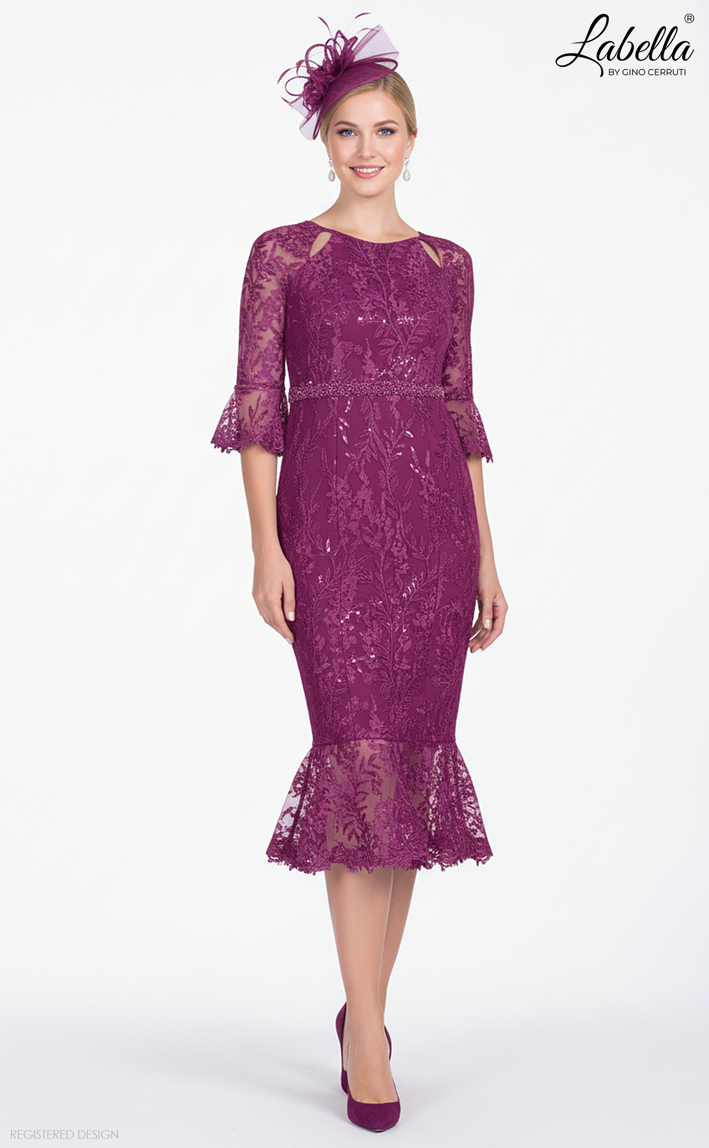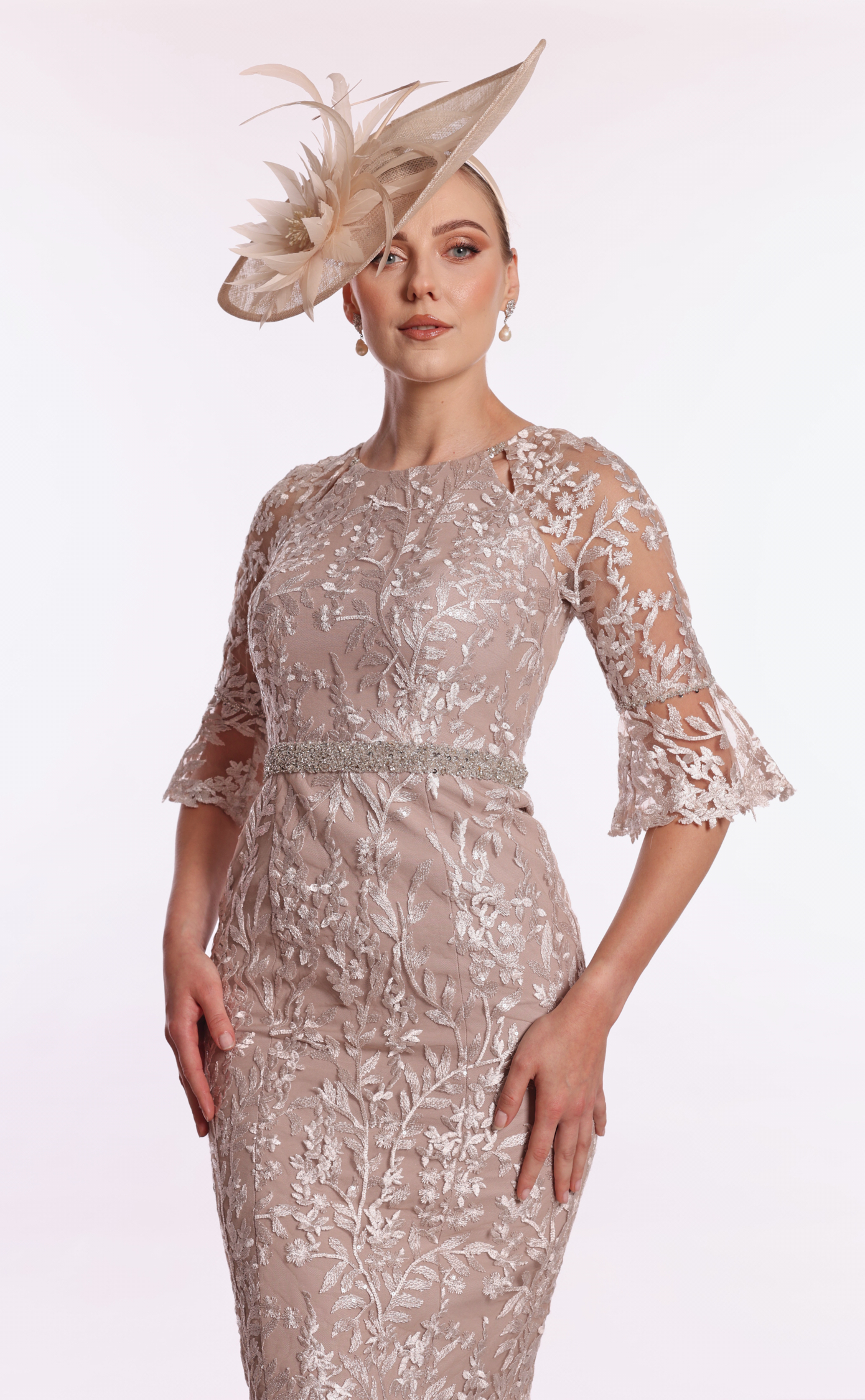 Lace all over! This stunning fluted pencil skirt flatters every shape, featuring an embellished belt to accentuate the waist and a high, round neckline. Delicate keyhole cutouts in the neck and back add a touch of skin, while bell sleeves elongate your arms. * Full lace * High neck * Keyhole cutouts * Bell sleeves * Embellished waist * Fluted pencil skirt