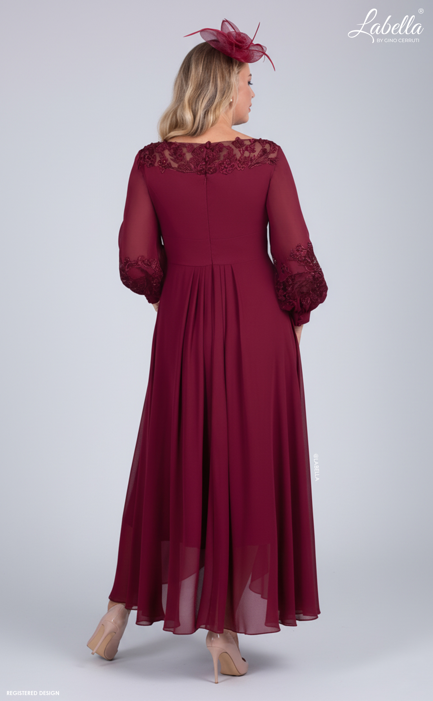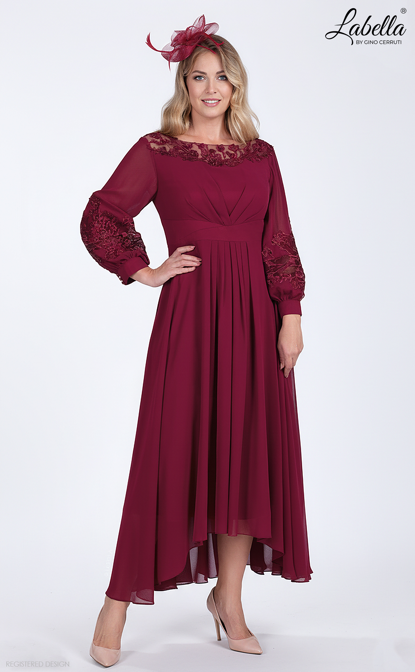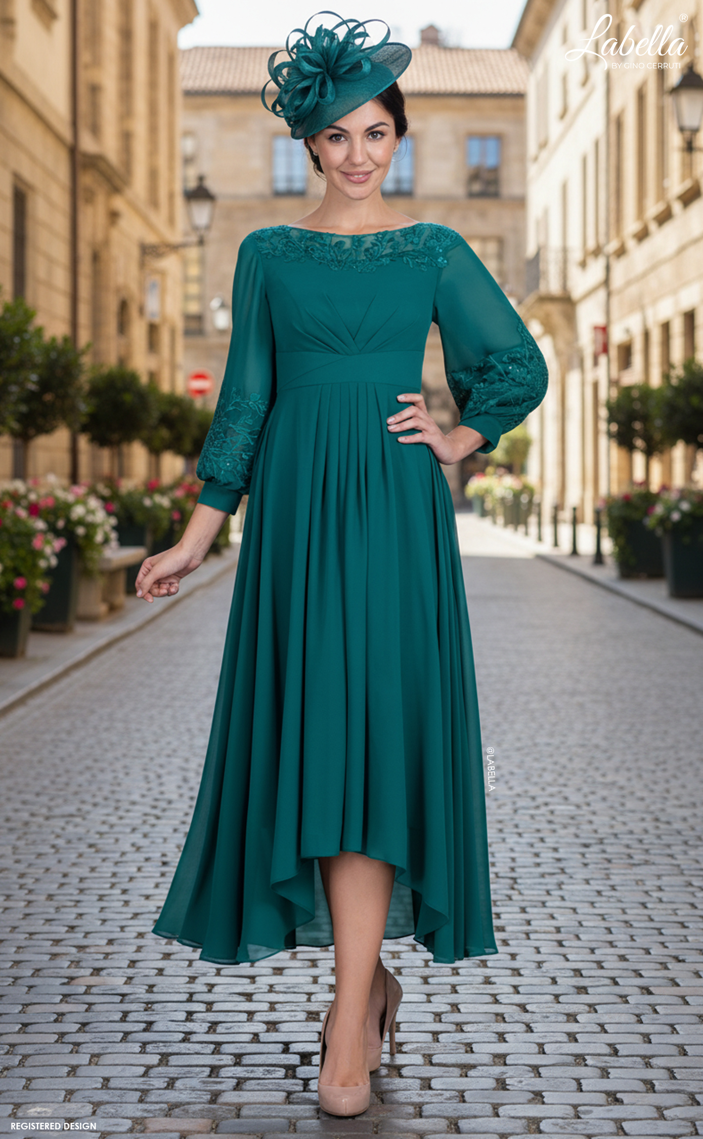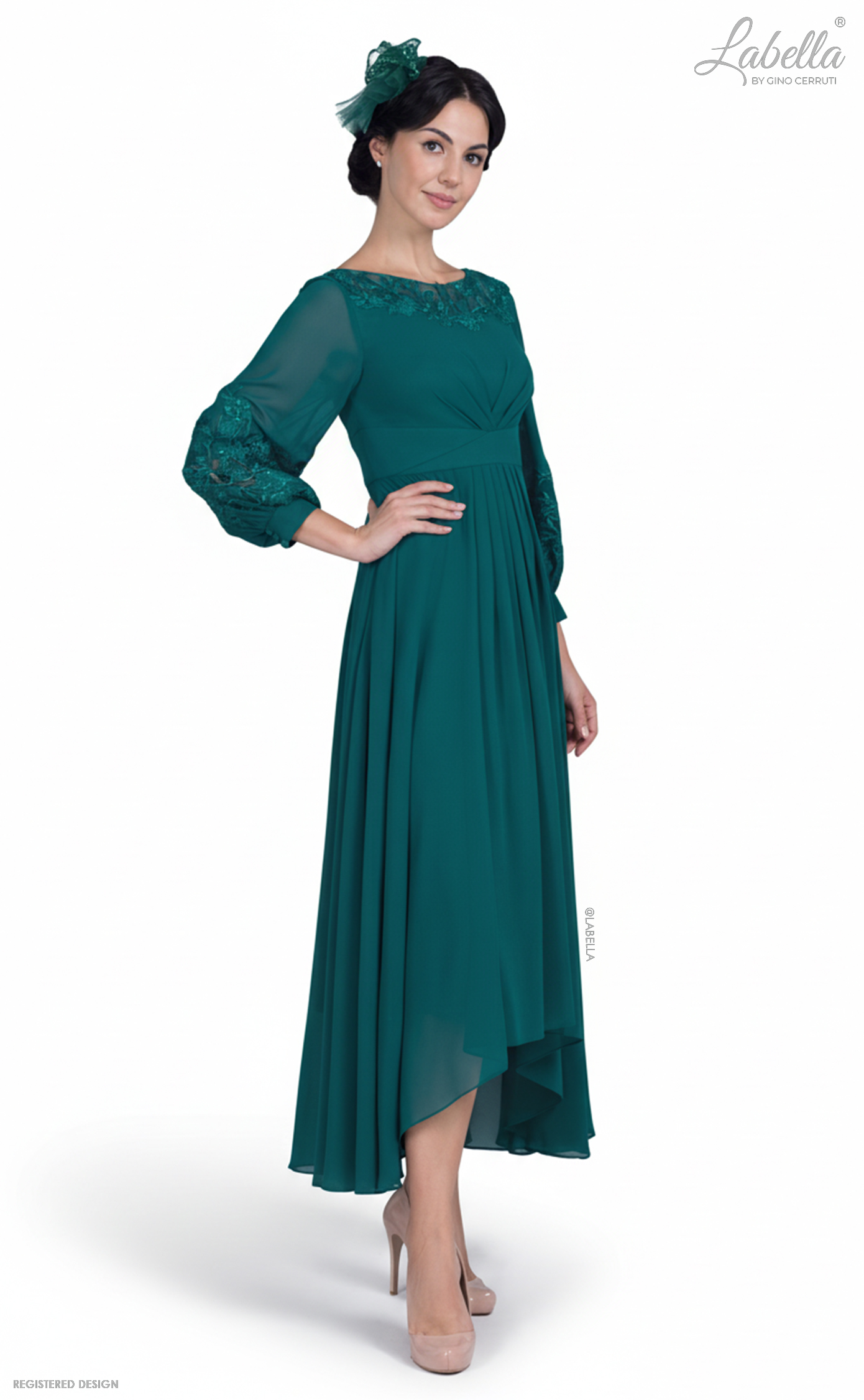 Do you love a dip hem as much as we do? This flowing chiffon skirt is perfect for dancing, with delicate pleats from the waist and bust and a wide waistband - it's the perfect dress to flatter your silhouette. A wide V neck is adourned with lace applique which is matched in the illusion panels of the stunning balloon sleeves. * Lace applique detailing * Balloon sleeves * Wide waistband * Pleated bust and waist * A-line dip hem skirt