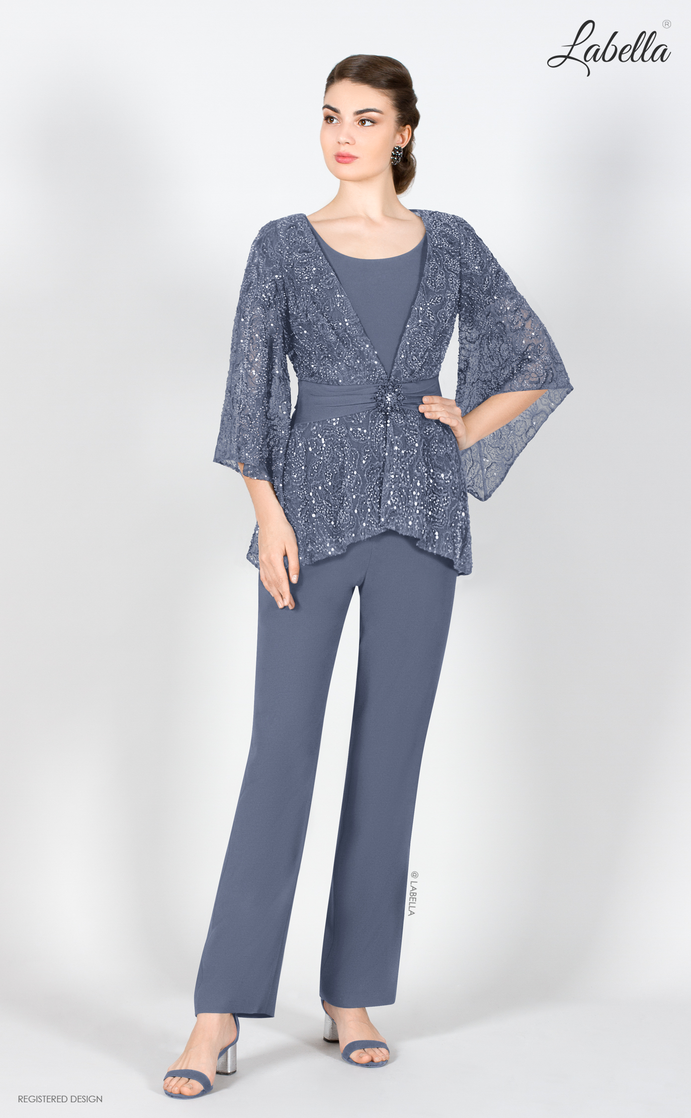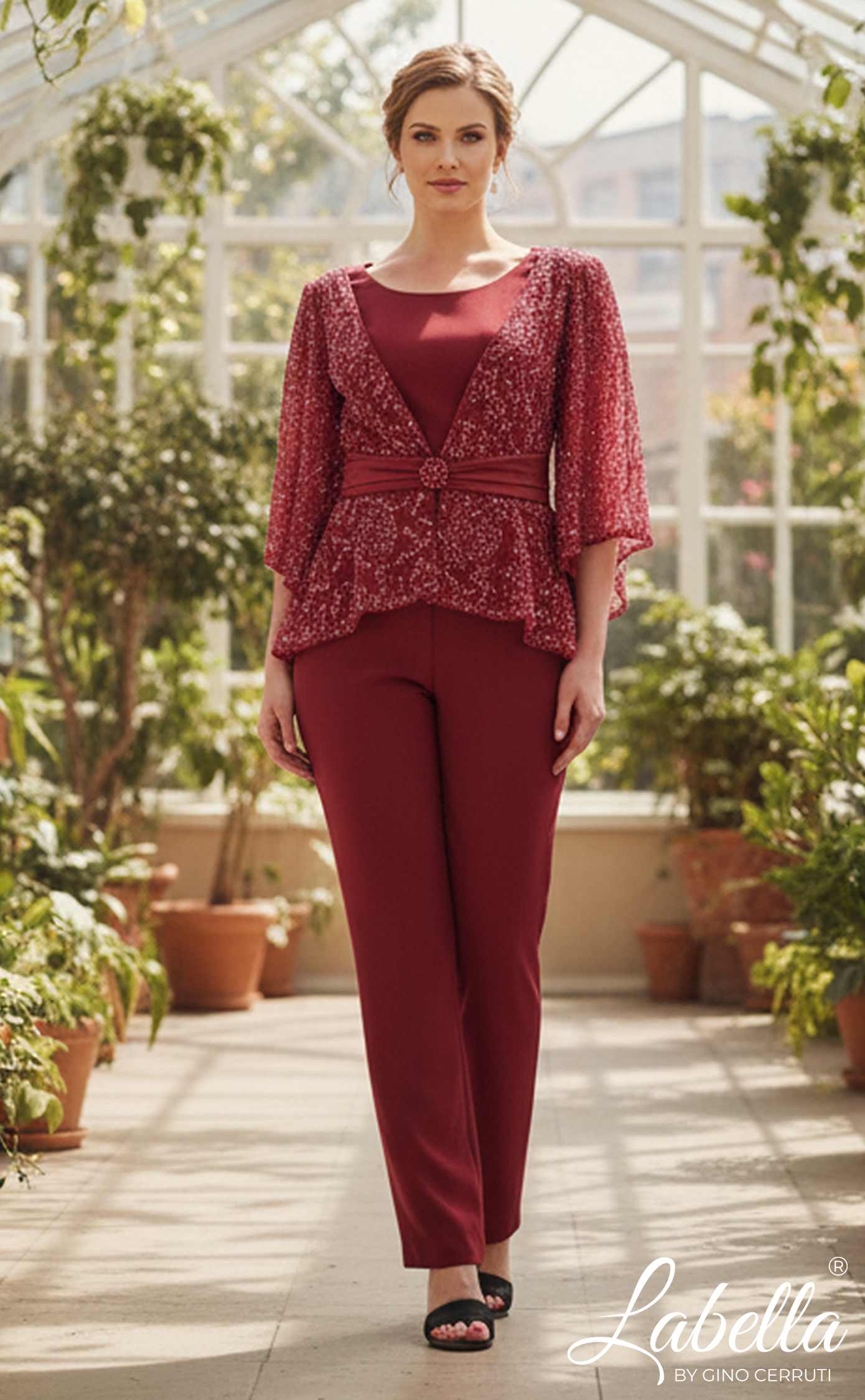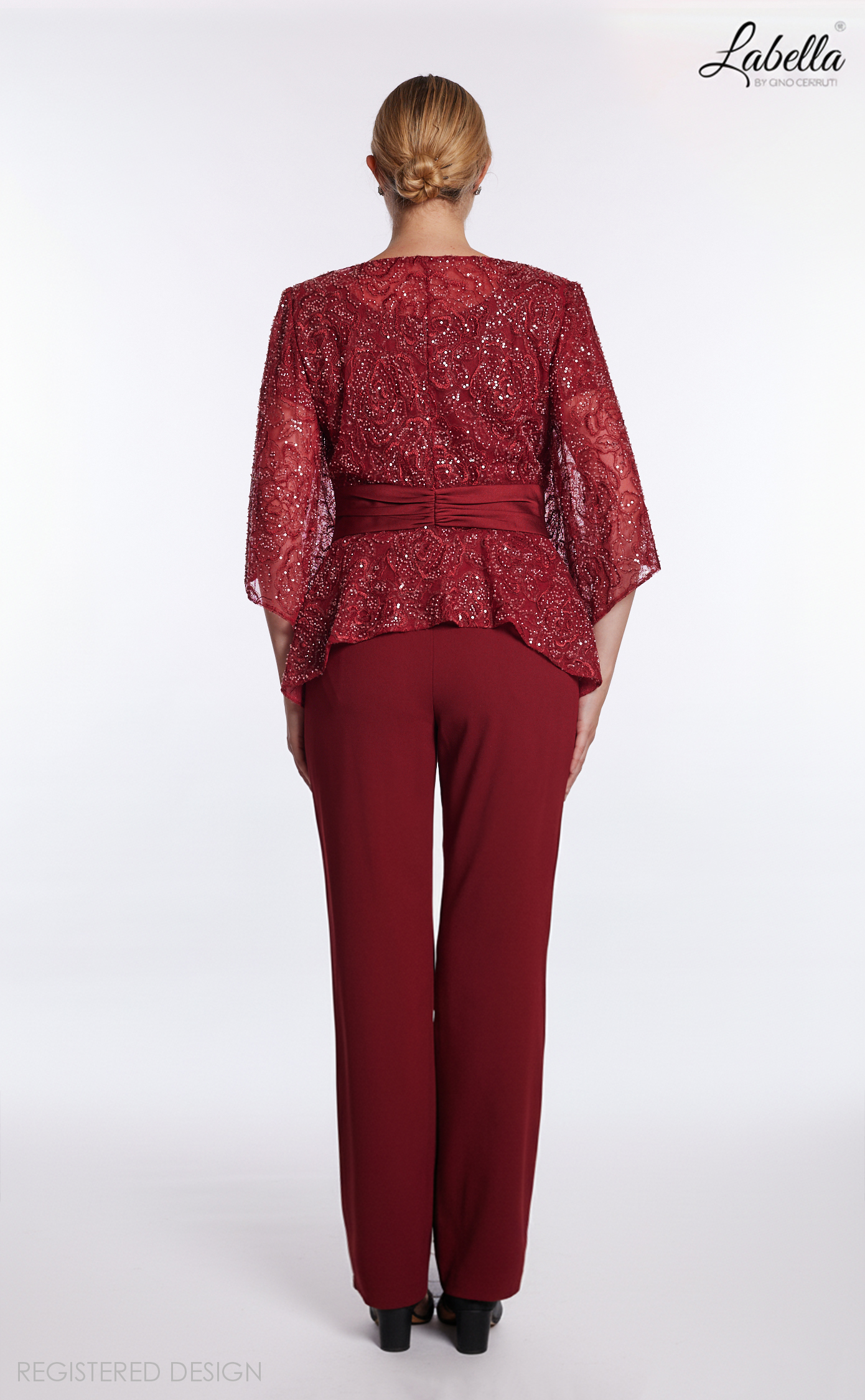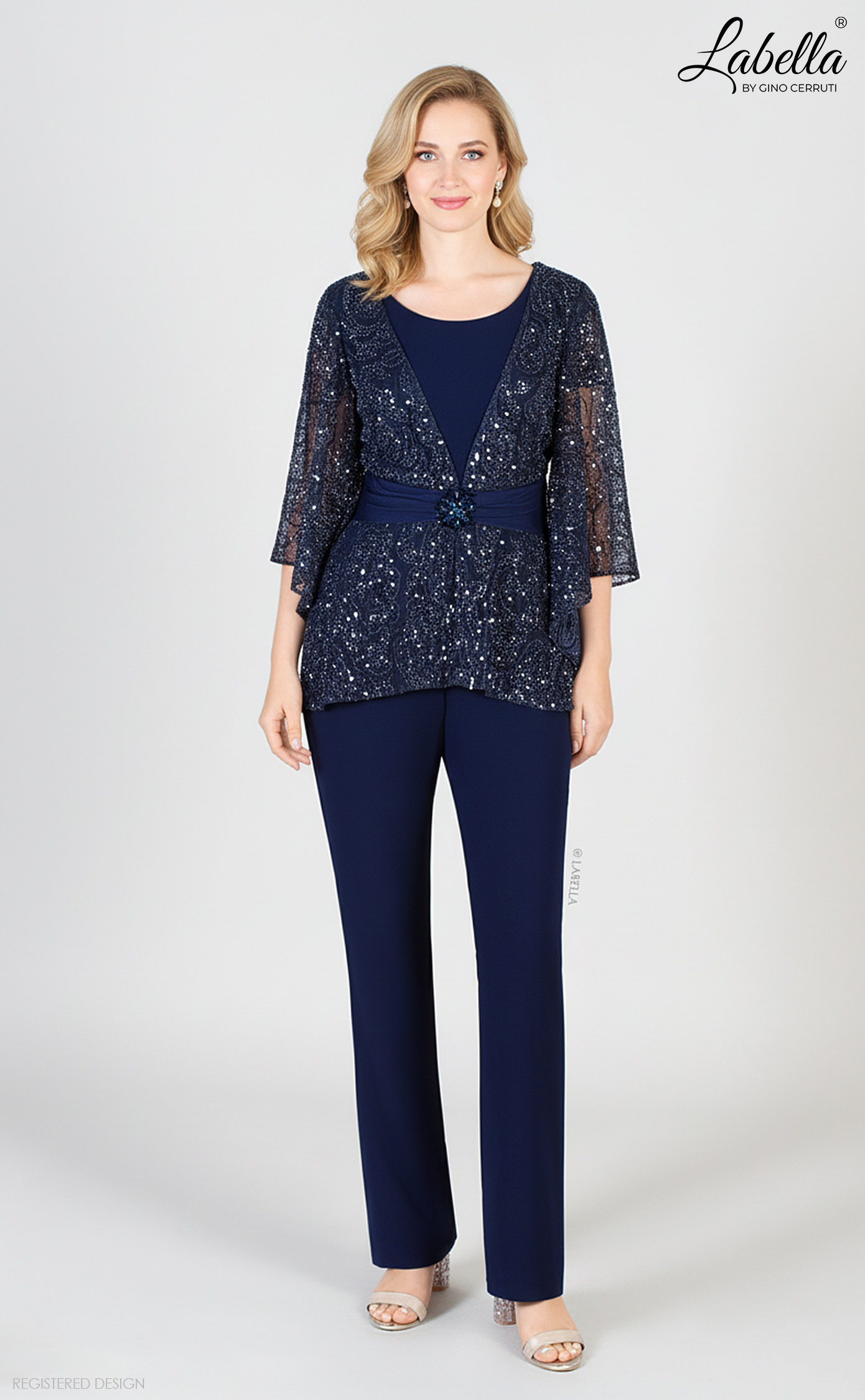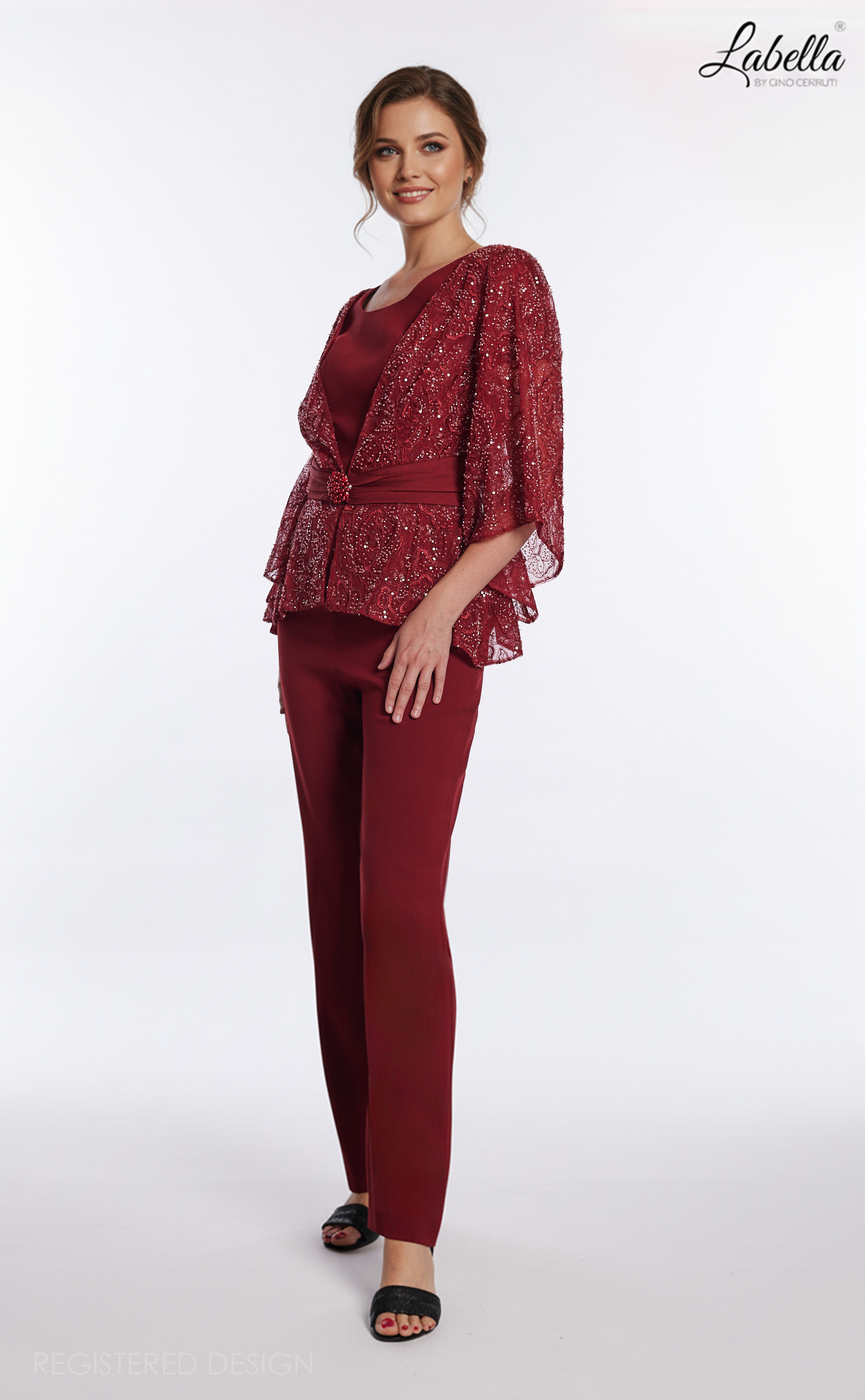 This lovely 3-piece outfit combines rigor, elegance, and sophistication. The sparkling cape features an airy cut and is cinched at the waist with a belt adorned with a gorgeous brooch. The blouse has short sleeves made of sparkling lace, complemented by side lace inserts. * Short sleeve blouse * Brooch detail * Straight trousers * Matching sparkling lace jacket