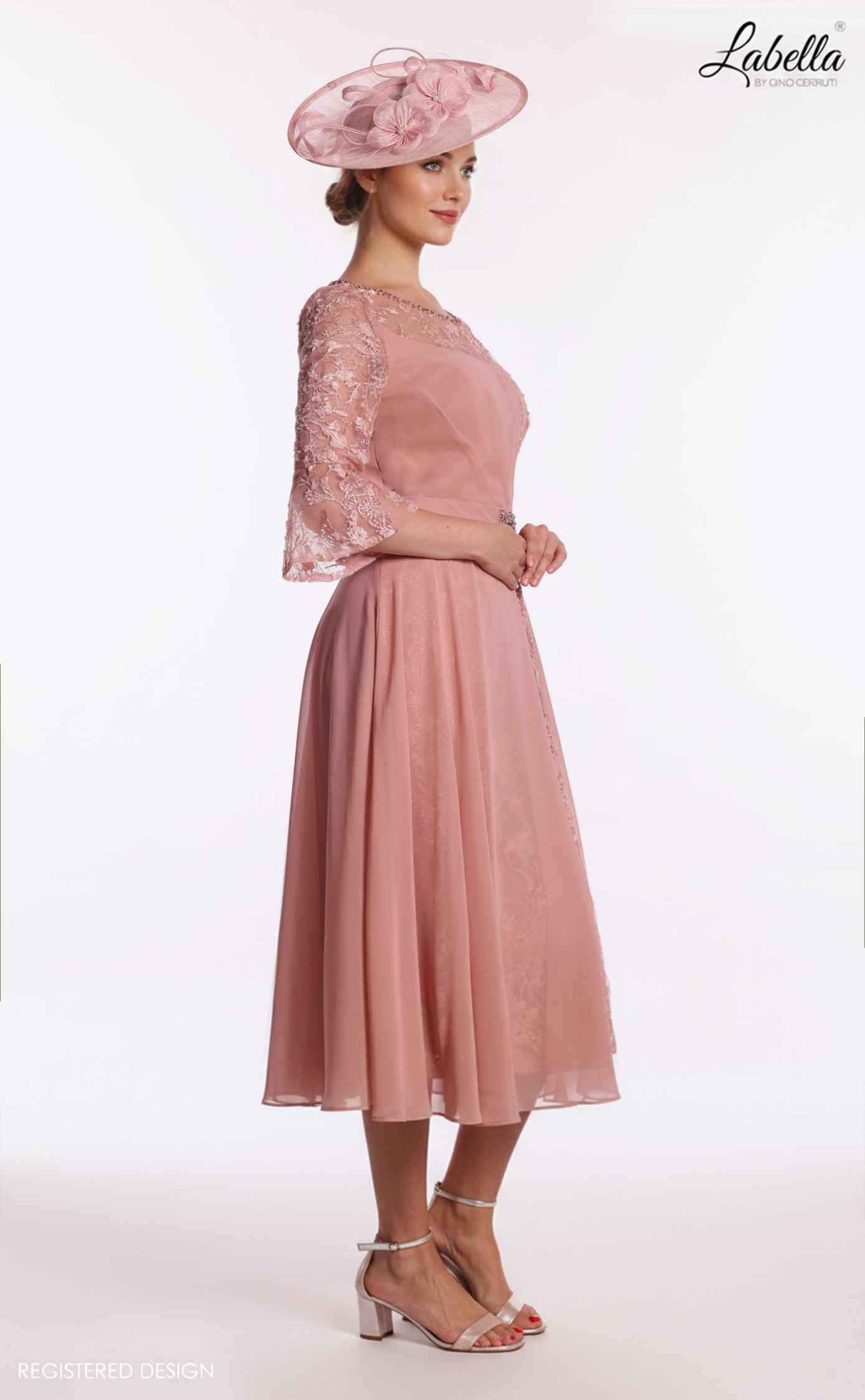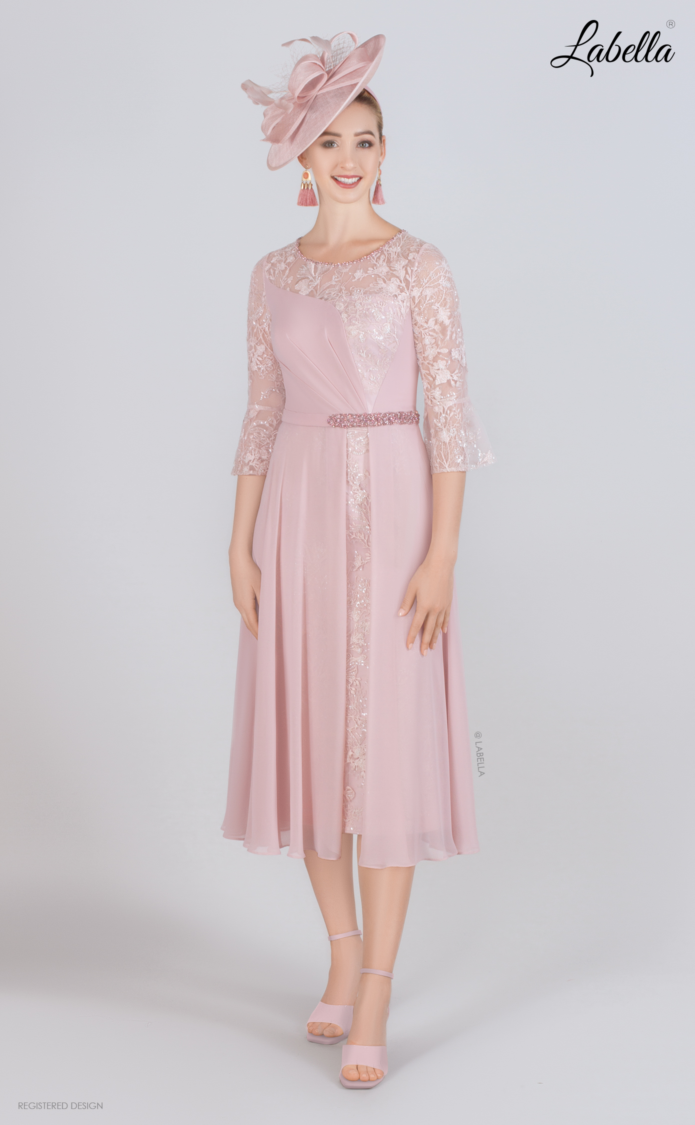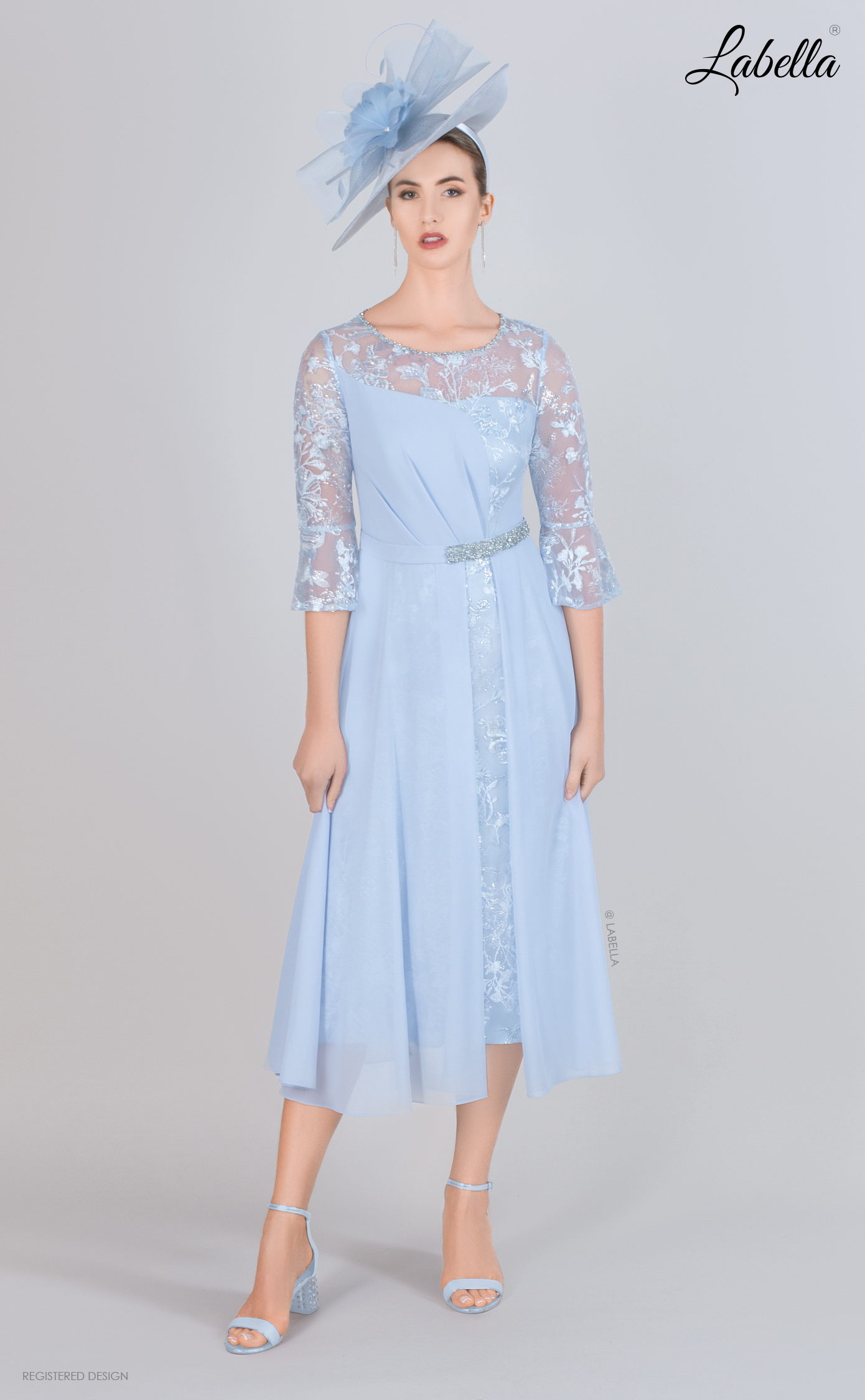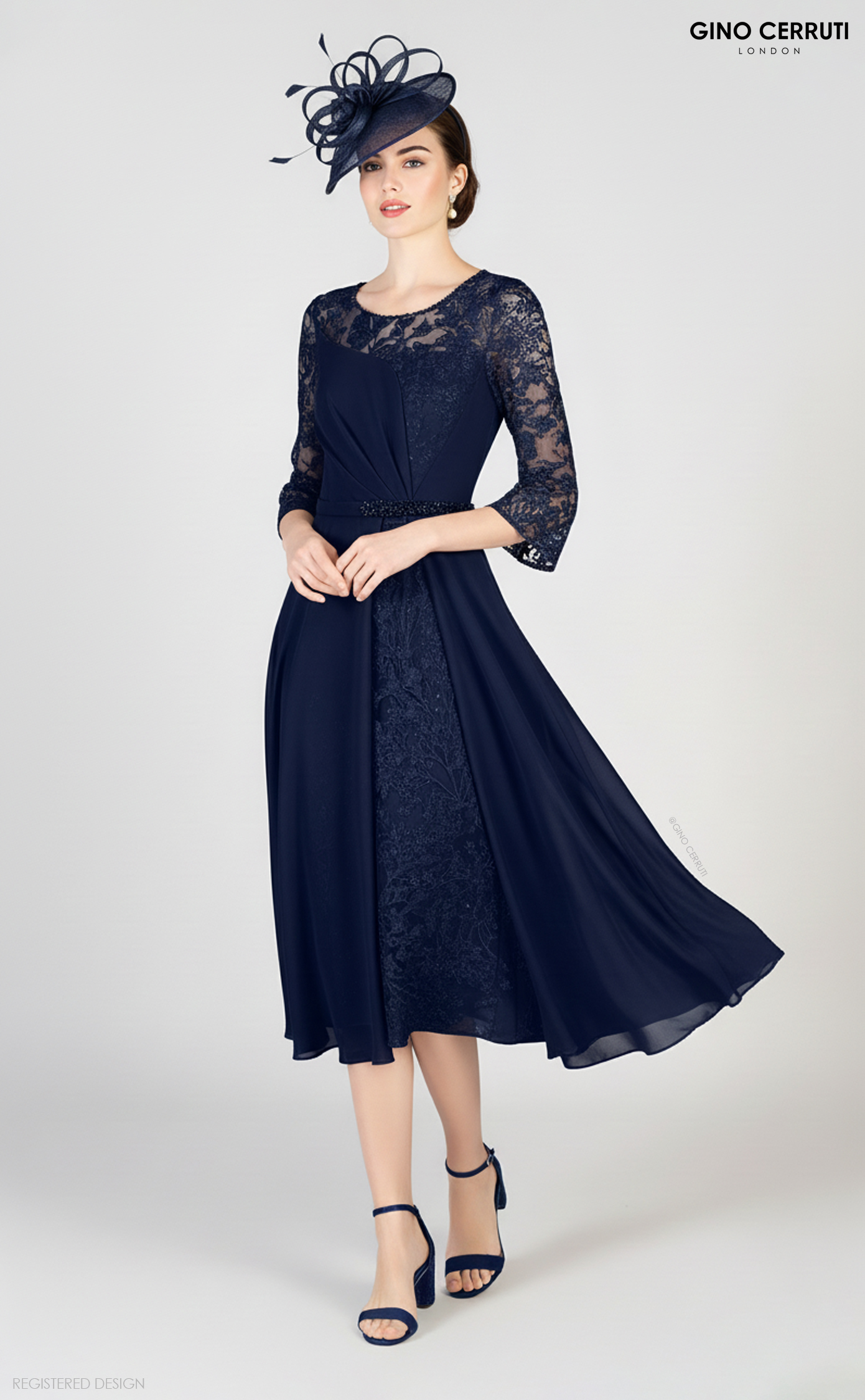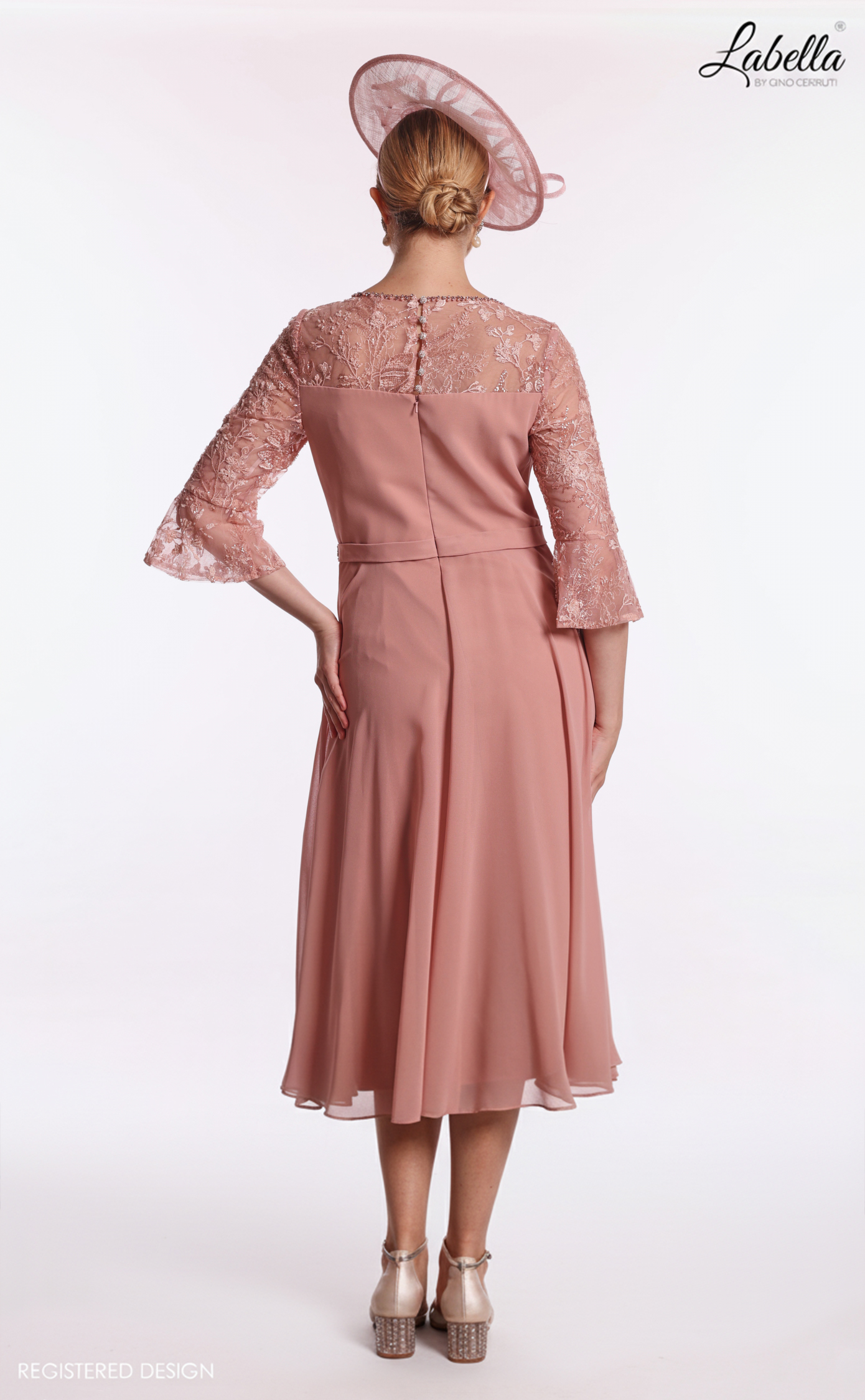 This stunning dress featuring lace sleeves and a flattering knee-length skirt. The design is beautifully enhanced by delicate inserts of chiffon fabric that flow gracefully from a thin belt adorned with exquisite beaded details. This delicate silhouette is perfect for any special occasion, ensuring you look sophisticated and stylish. * Illusion lace * Round neck with beading * Lace sleeves * Statement beaded belt * Flowing chiffon inserts