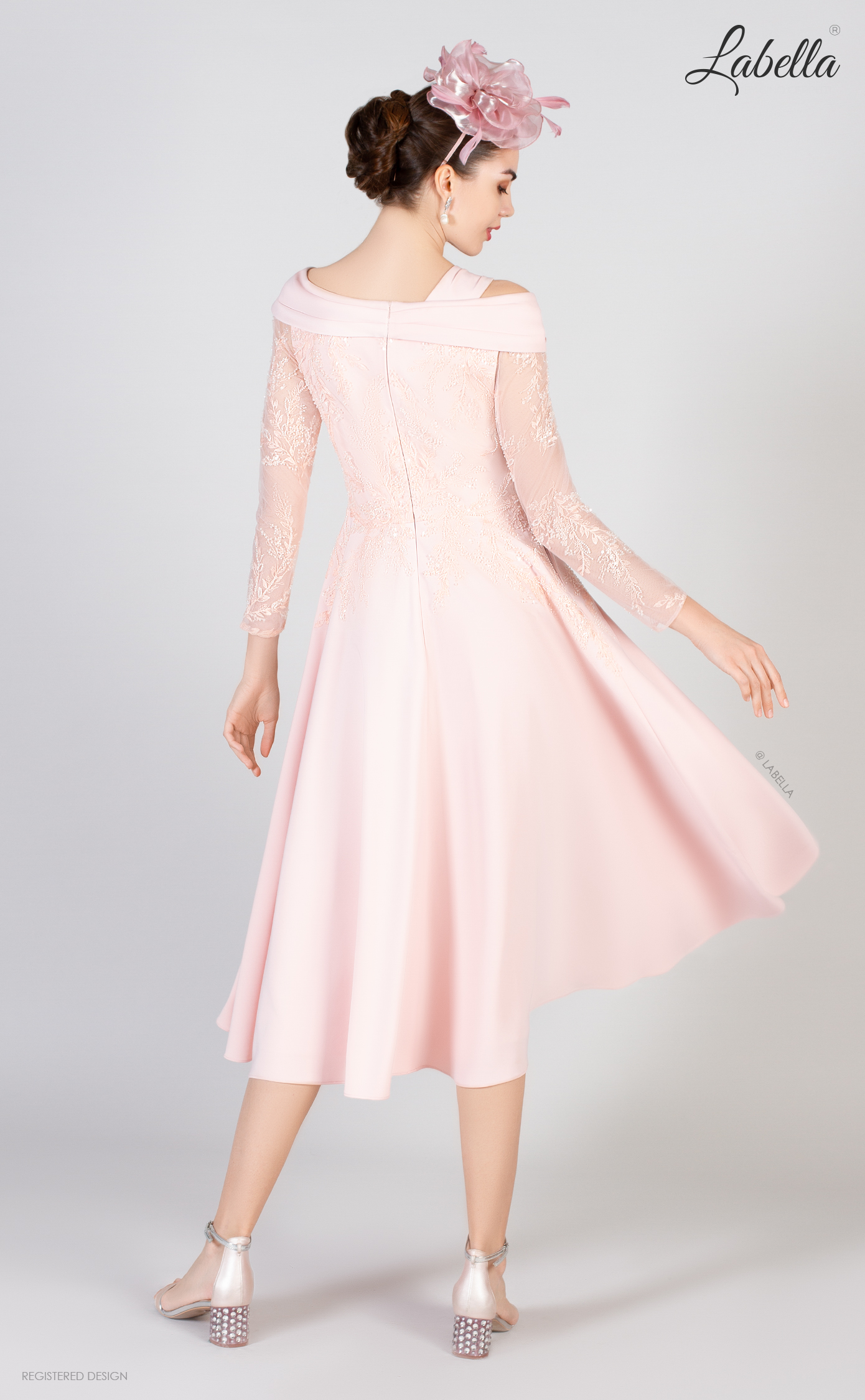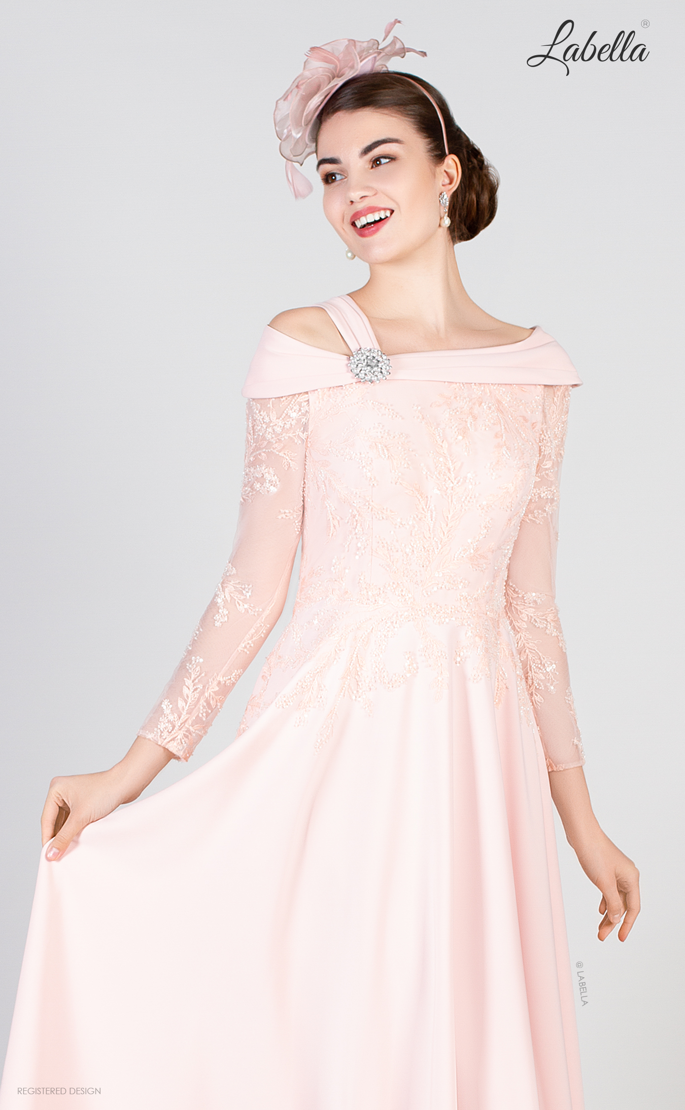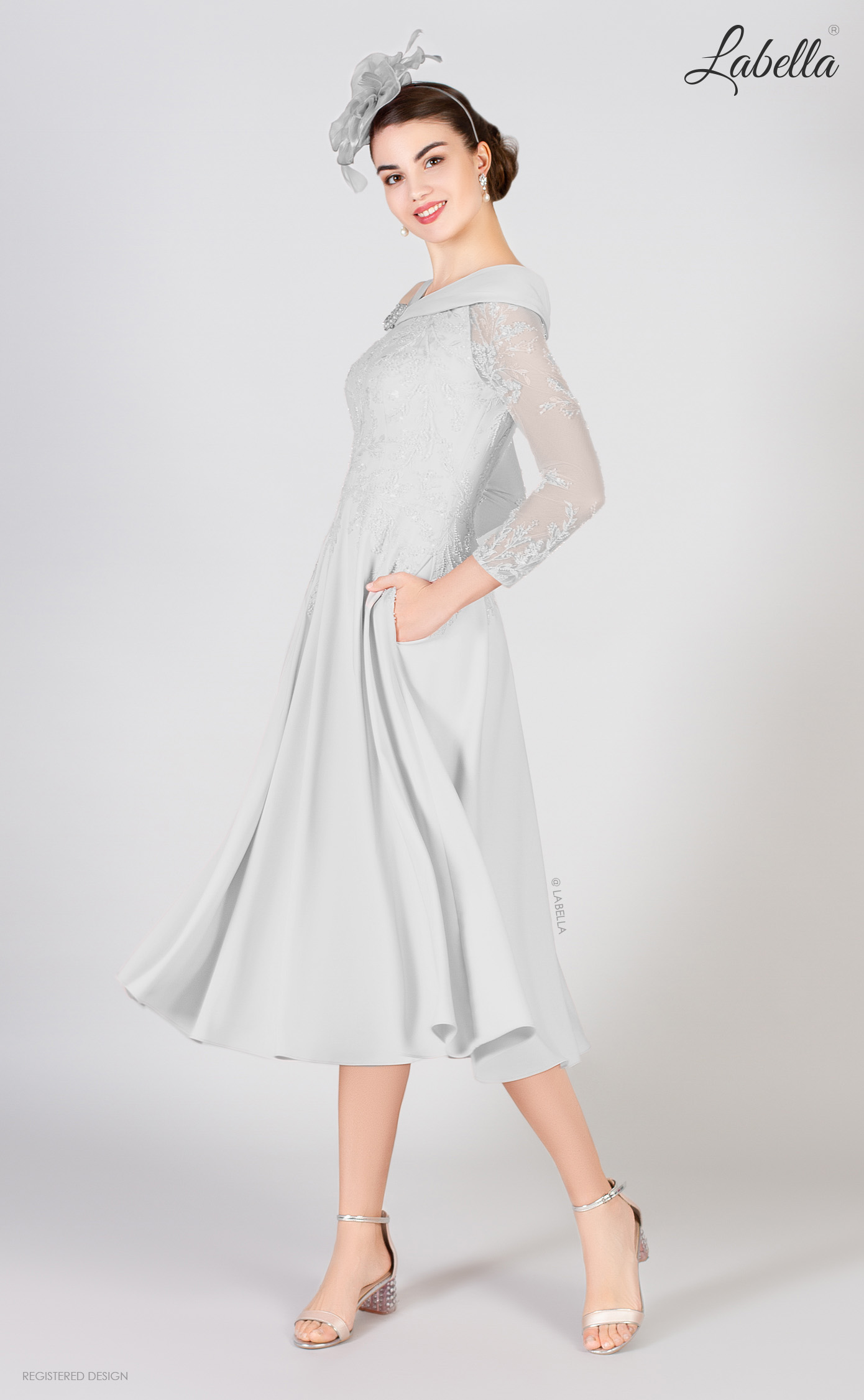 Be the most gentle! A lovely dress for a special occasion. Stunning lace top paired with an A-line satin skirt. Statement shoulder strap and incredible brooch complete this elegant dress. * 3/4 sleeves * Lace top * A-line skirt * Brooch