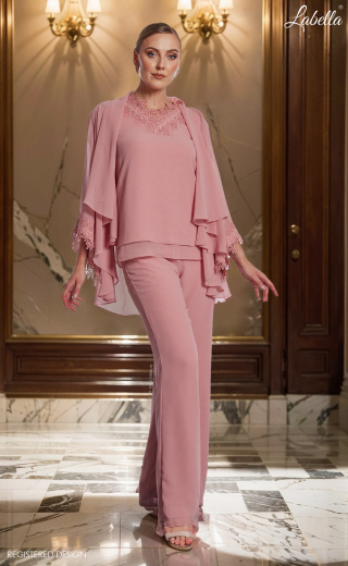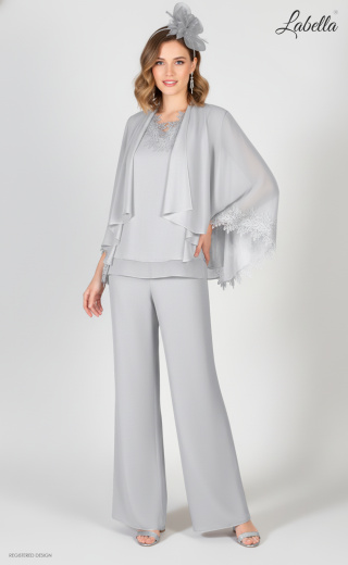Experience luxury with this stunning outfit! The trendy culottes harmonize beautifully with the light lace-trimmed cape, while the matching top completes the chic modern look. * Lace trimmed neckline * Culotte pants * Matching jacket with lace trim