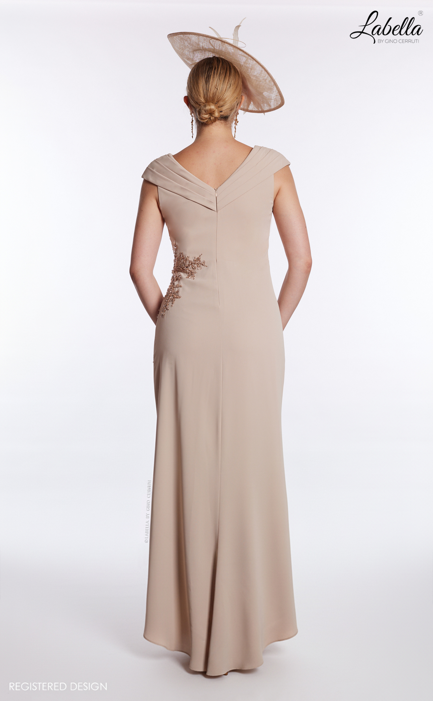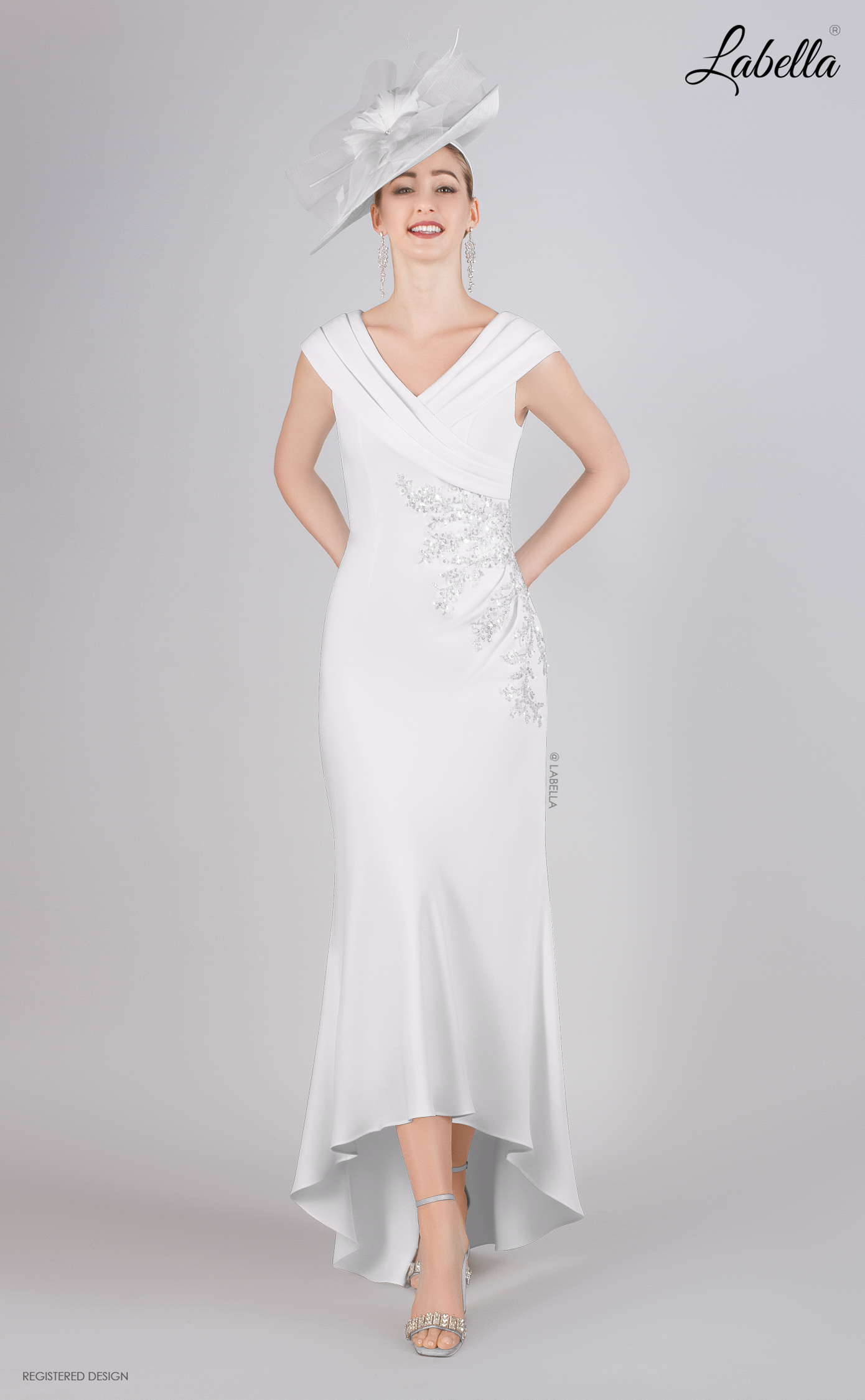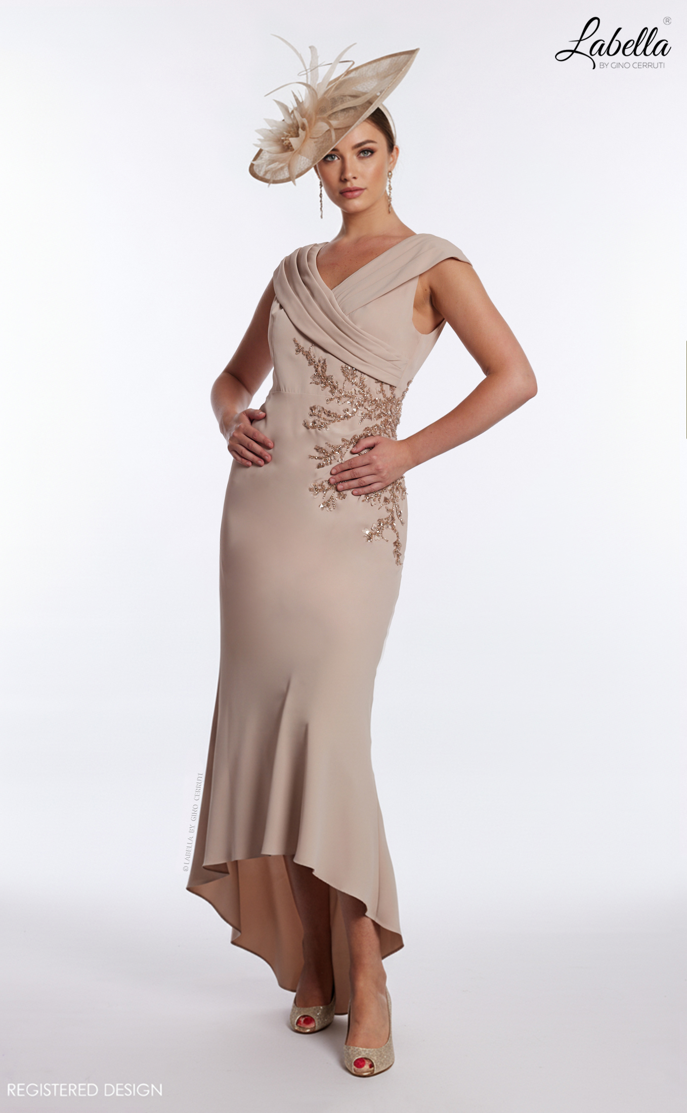 This exquisitely fitted dress features a flattering V-neckline and a silhouette that hugs the body, cascading to the floor in an asymmetric style adorned with beautiful appliqué. Any woman wearing this elegant number will surely turn heads! * V-Neckline * Cross-over bodice * Sequin applique feature * High-low * Form-fitted silhouette