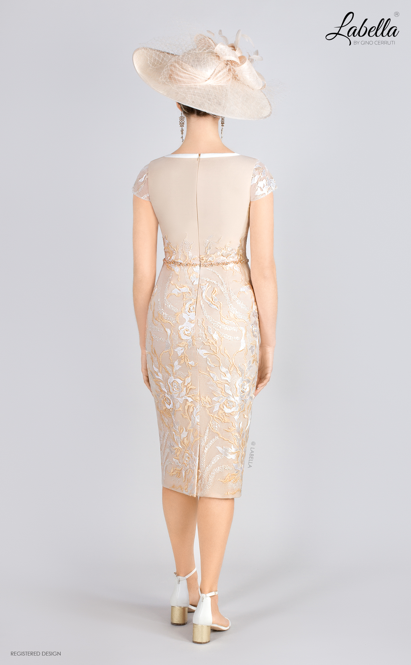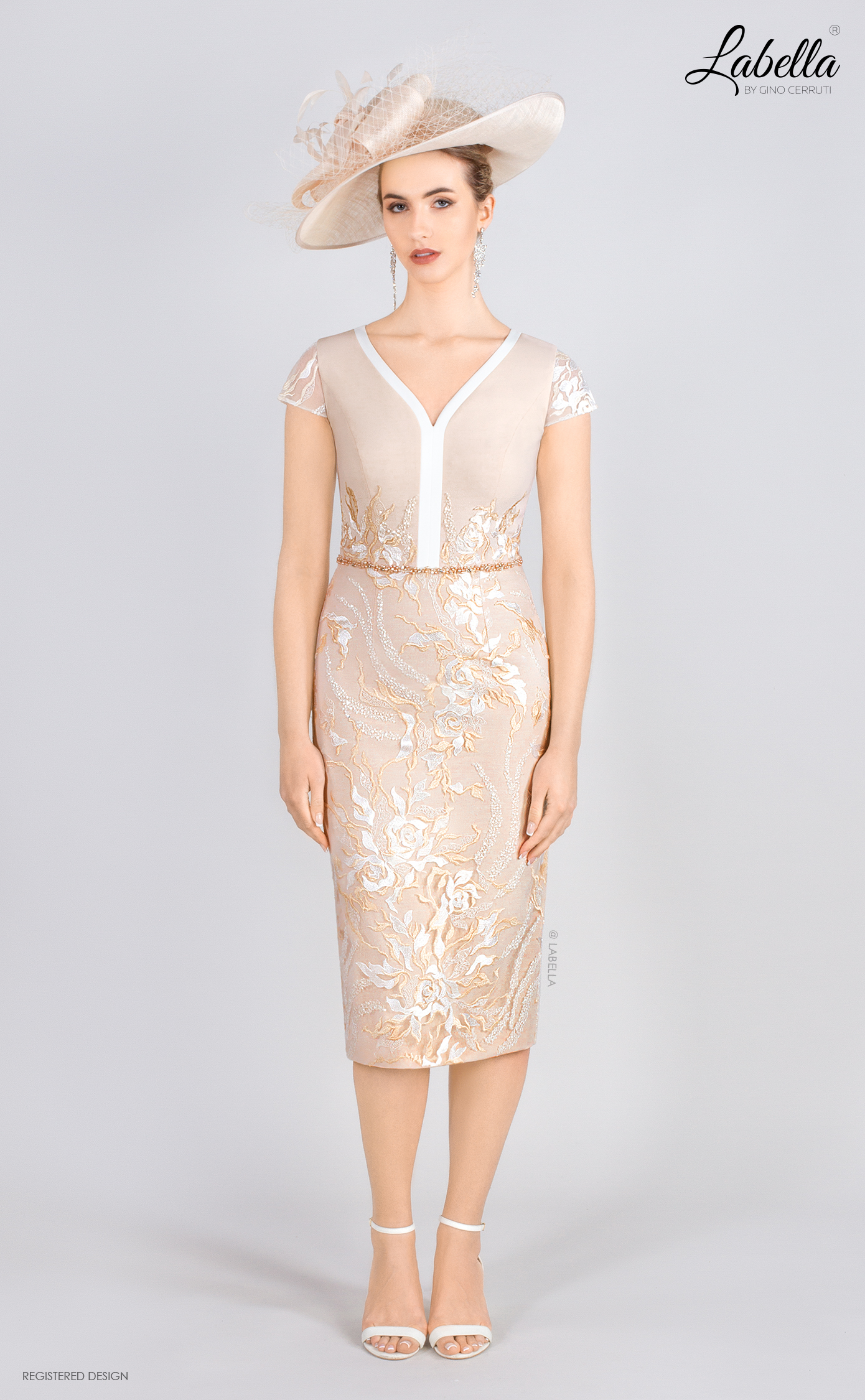 This unique two-piece dress and jacket set is adorned with beautiful floral appliqué and features a contrasting neck panel on both the dress and jacket. The knee-length dress fits like a glove and boasts a short sleeve style, making it perfect for a summer wedding. * V-Neck with contrast panel * Floral applique * Short sleeve * Fitted jacket * Knee-length * Fitted silhouette * Two-tone