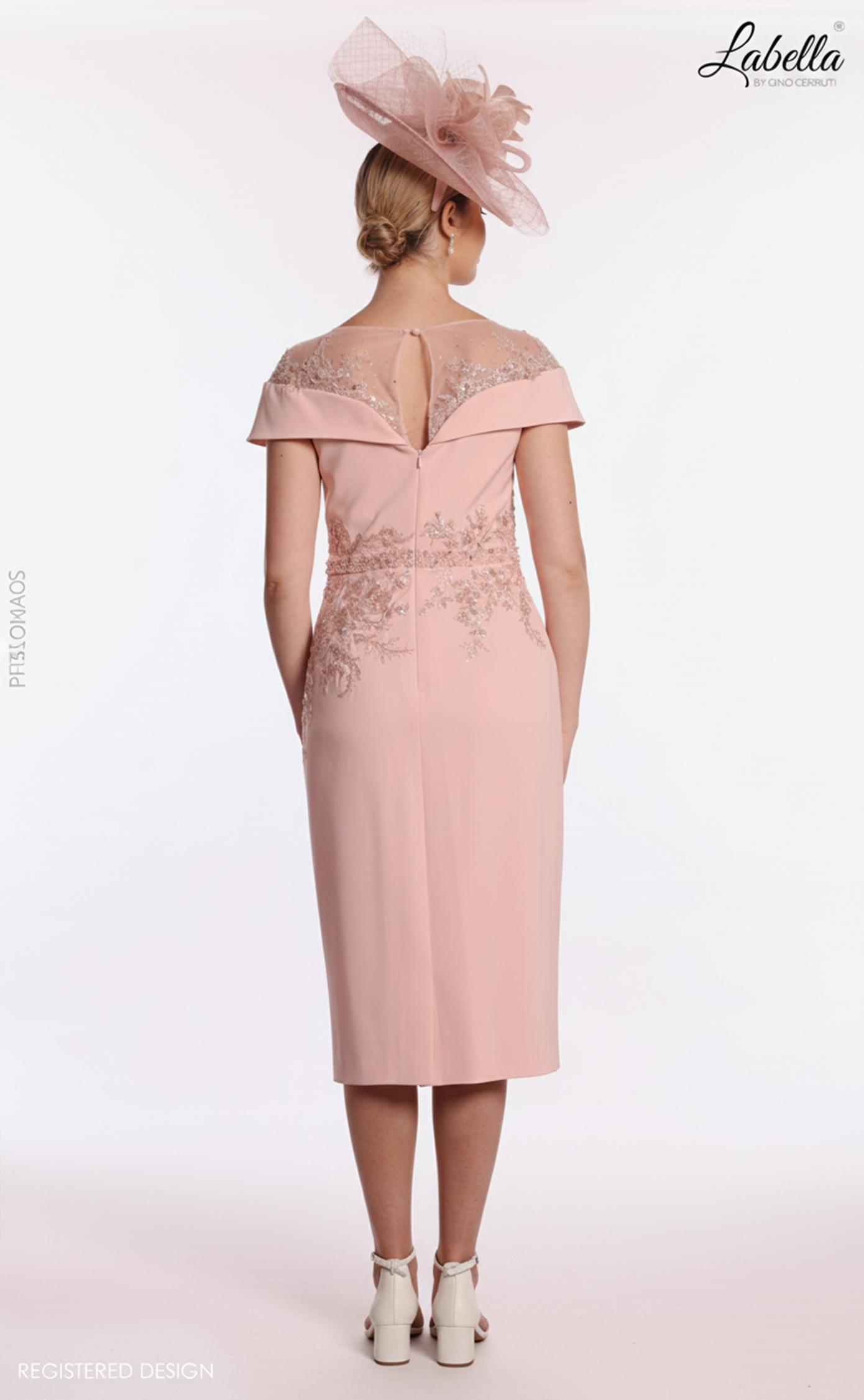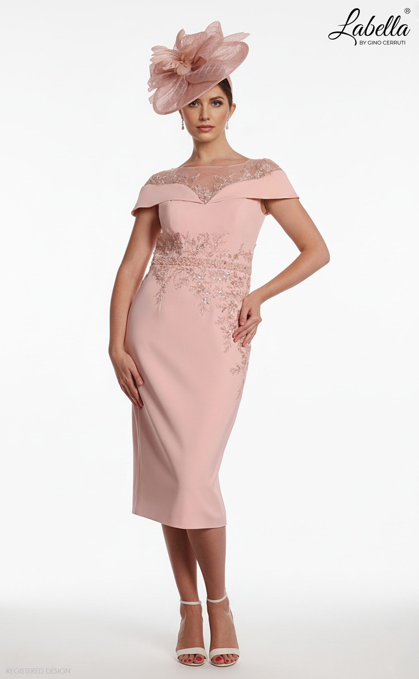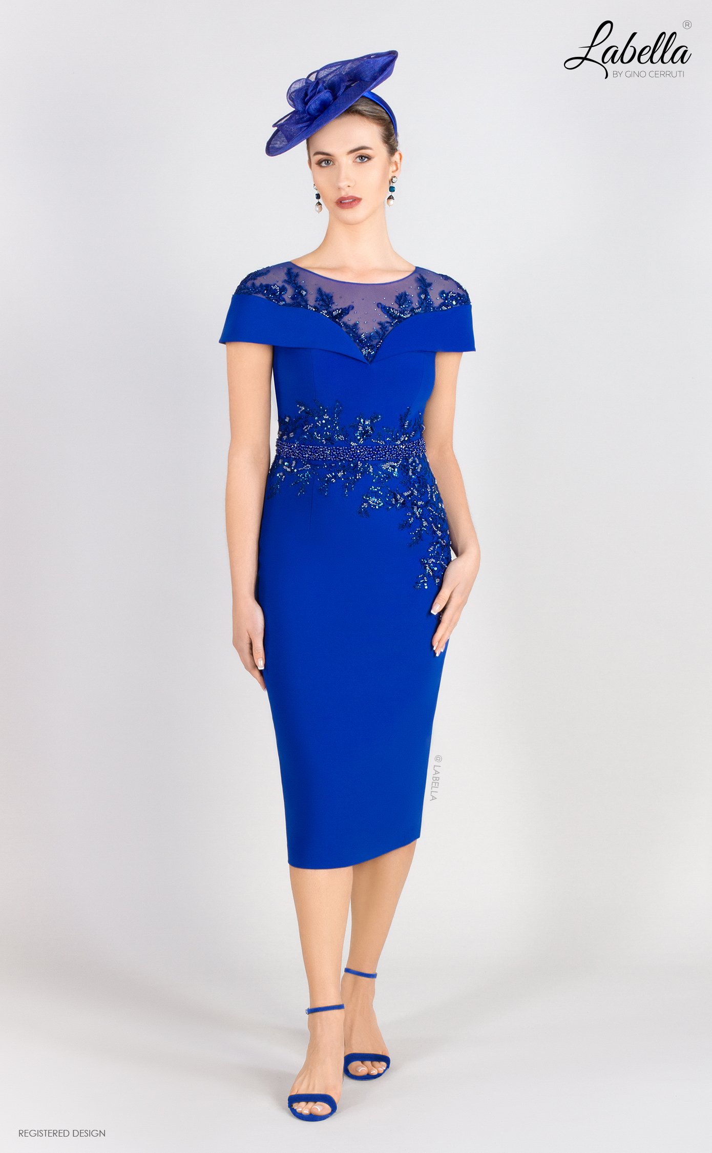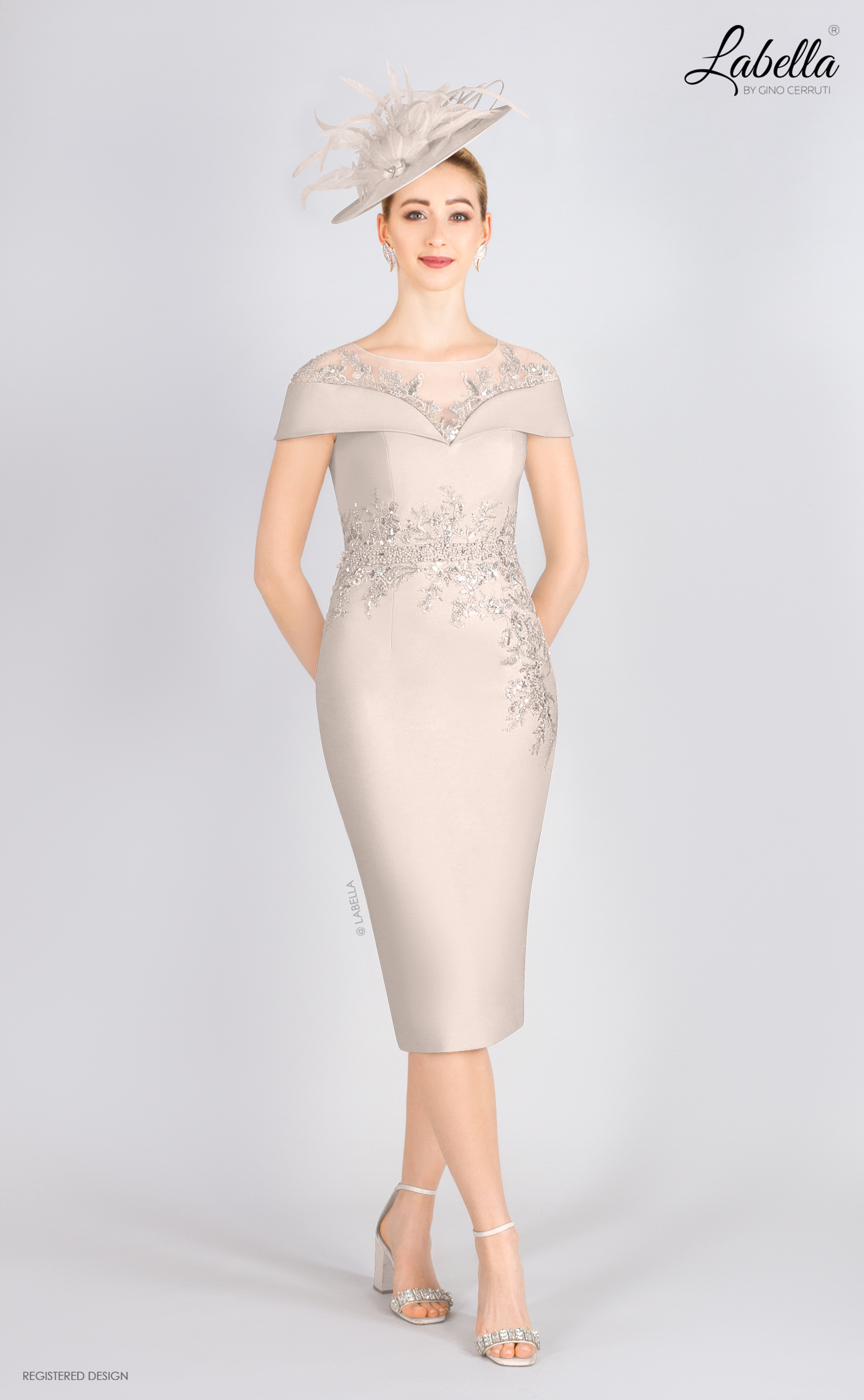 This splendid knee-length dress features an illusion neckline adorned with beautiful appliqué for a flattering off-shoulder look. Fitted to perfection, it includes a delicate beaded belt, making it an ideal choice for glamorous mothers of the bride or groom. * Illusion neckline * Applique feature * Knee-length * Form-fitting silhouette