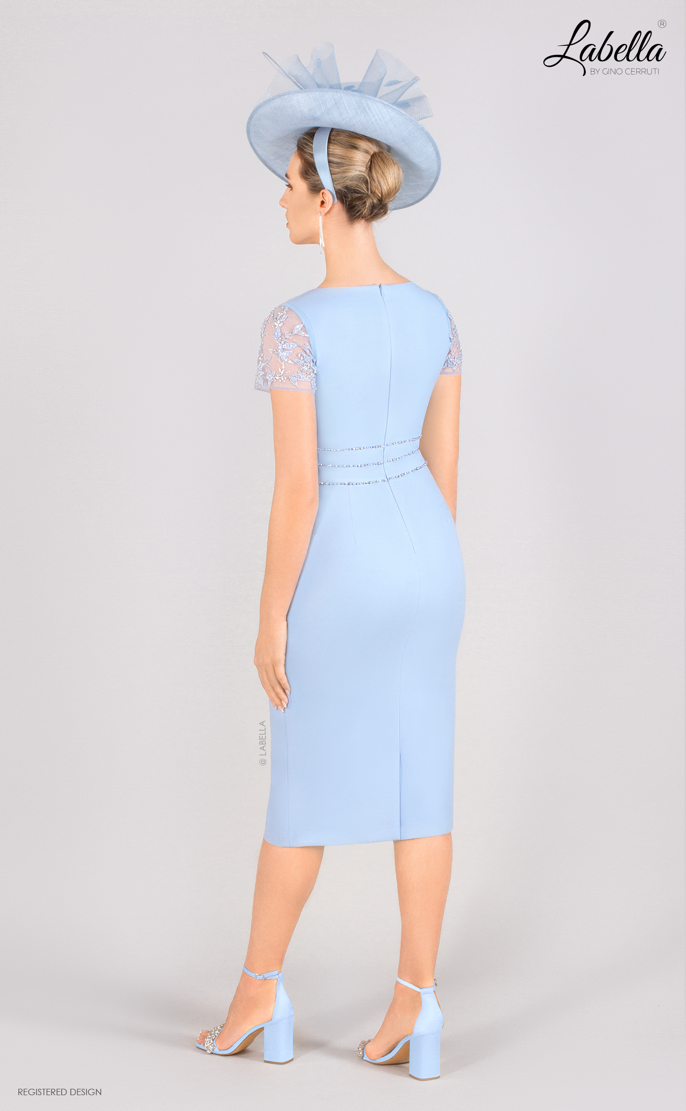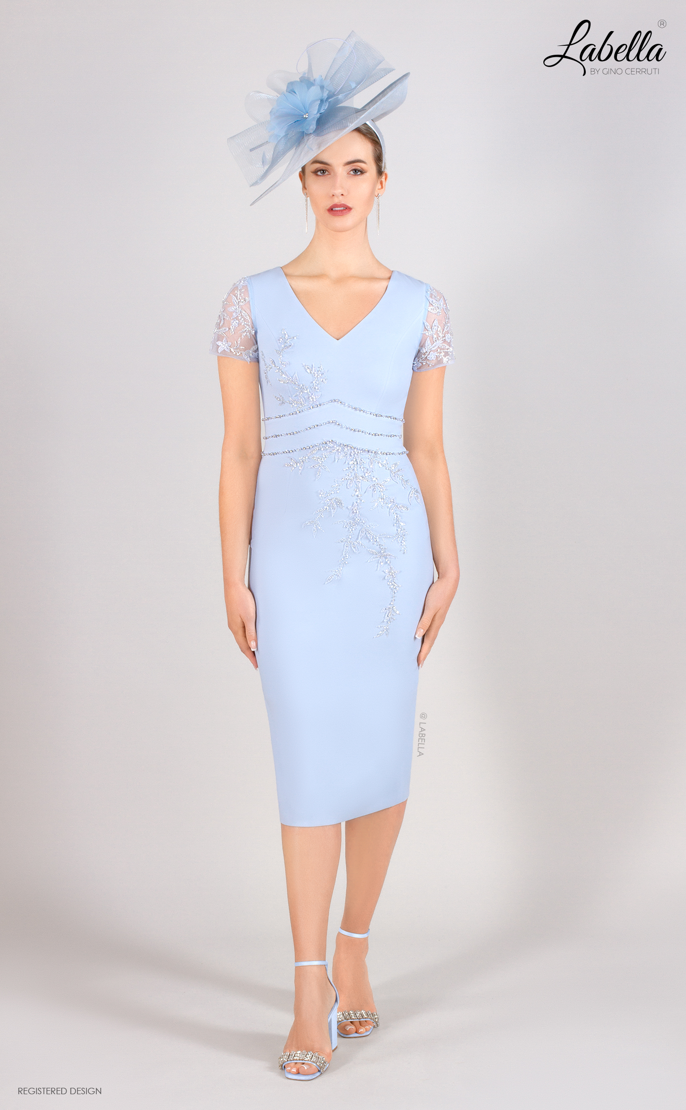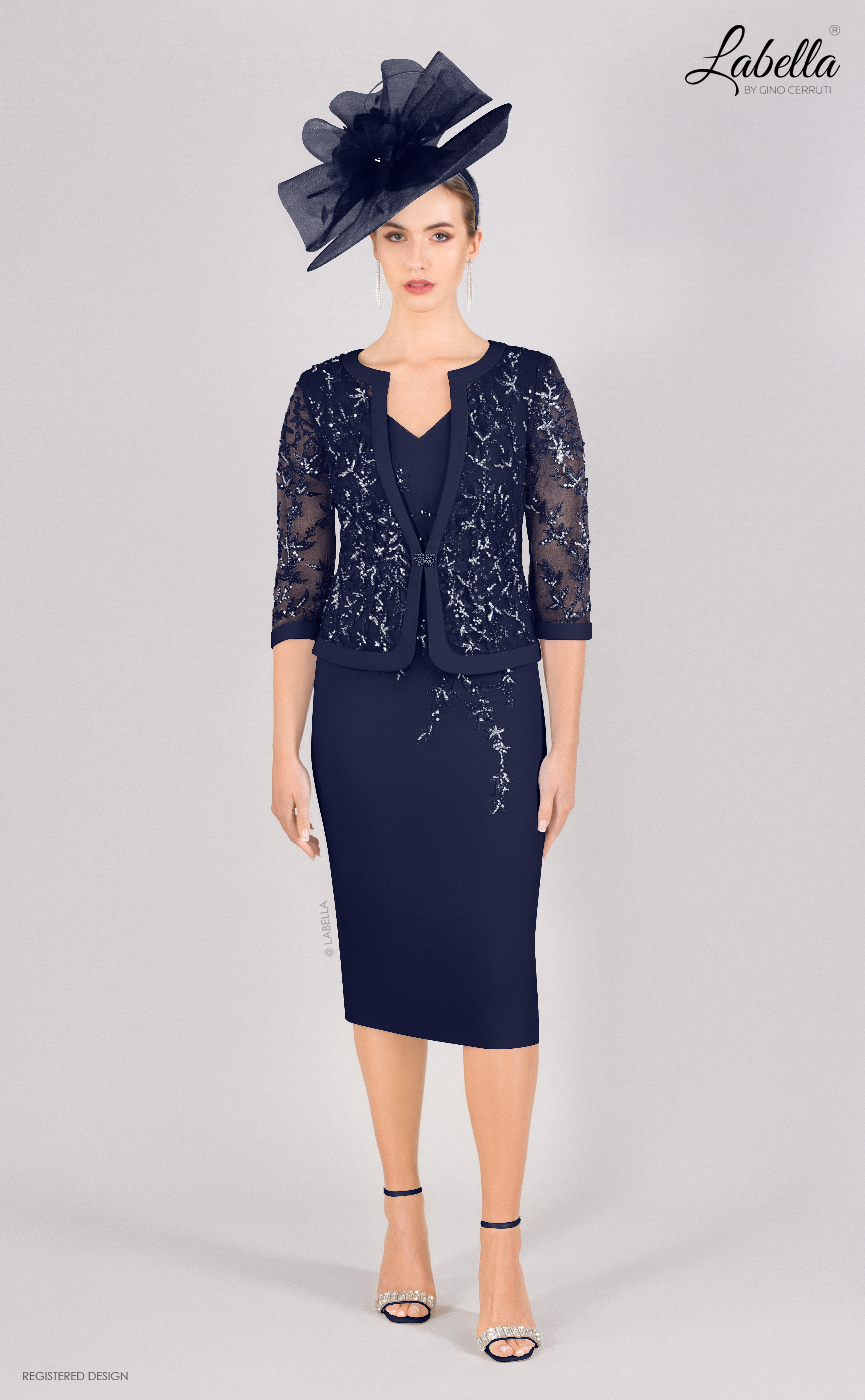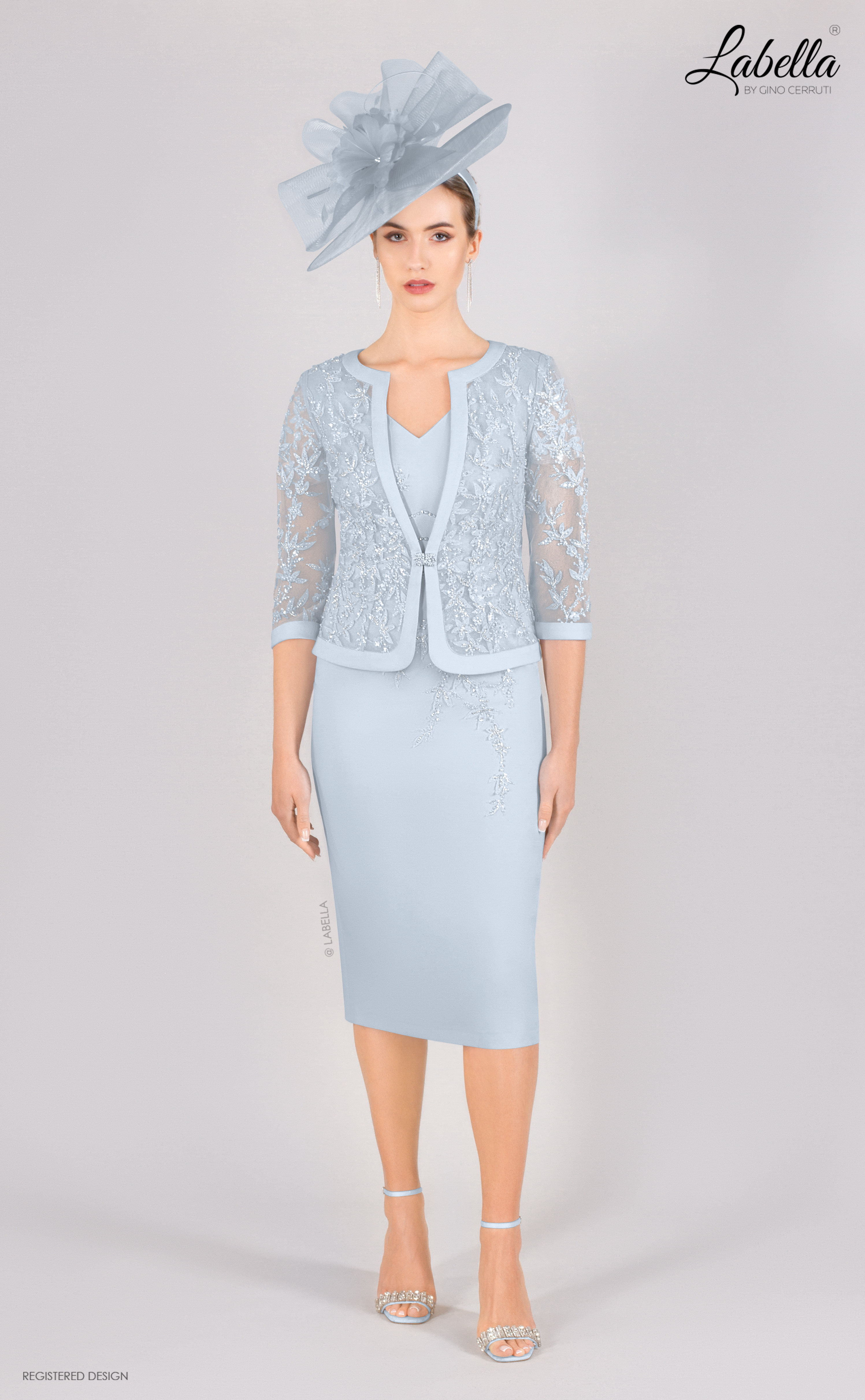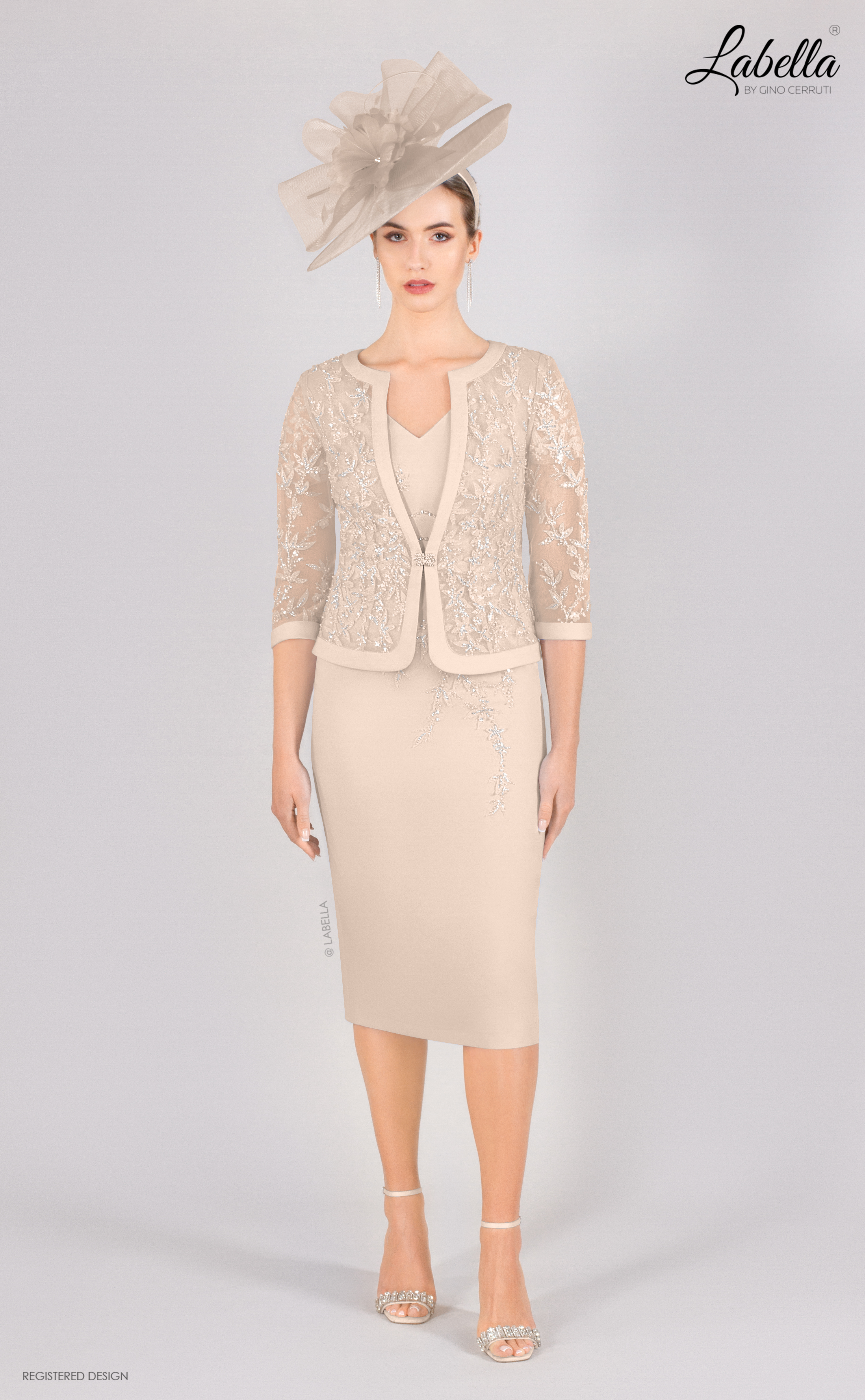 A stunning two-piece ensemble for a summer wedding! This knee-length dress features a flattering V-neckline, delicate sleeves, and exquisite appliqué detailing. Adorned with beading around the waist, the dress is beautifully complemented by a sheer jacket with matching glimmering appliqué. • V-neckline • Short sleeve • Floral applique • Beaded deatail • Knee-length • Fitted silhouette • Matching applique jacket with small brooch fastening