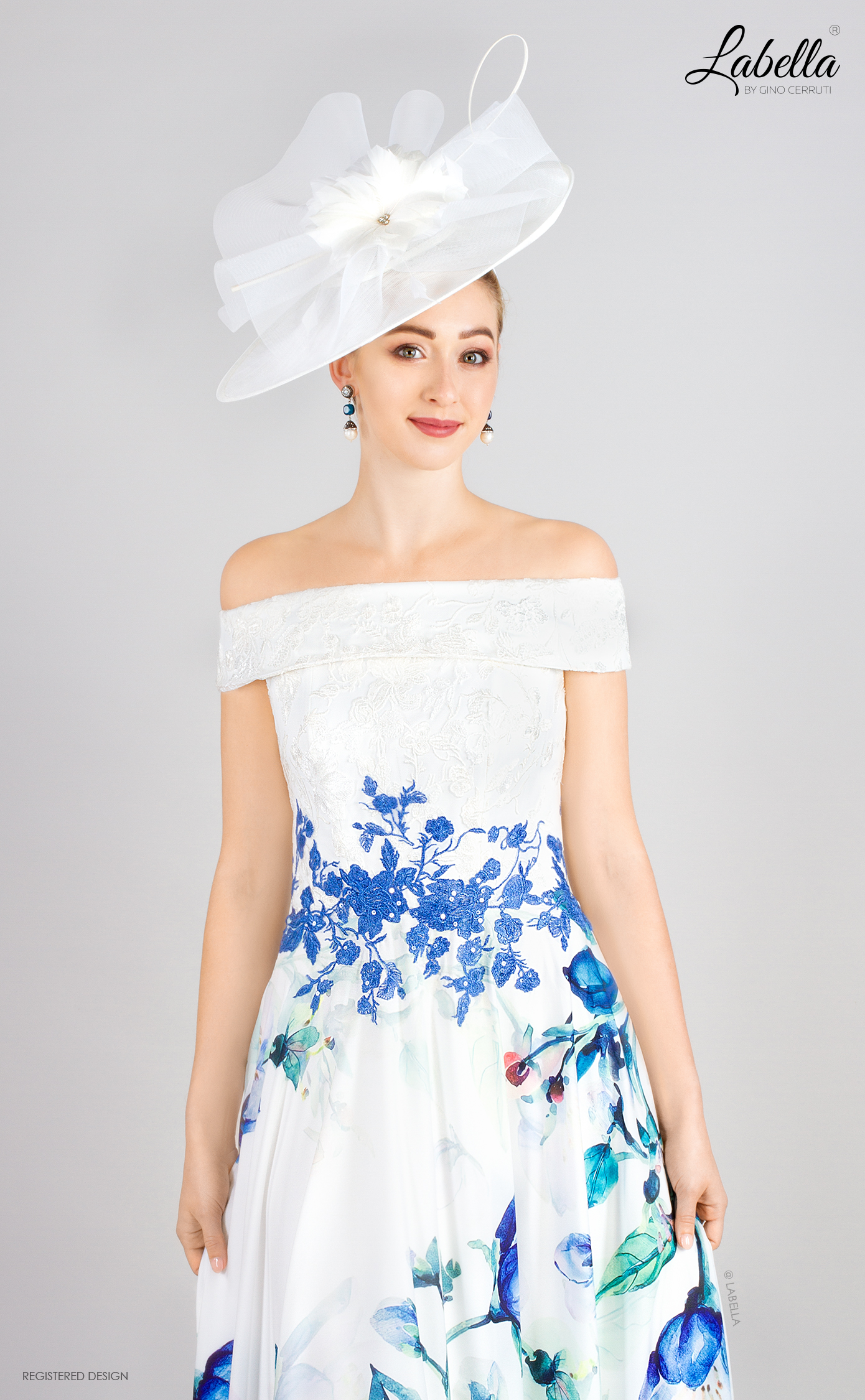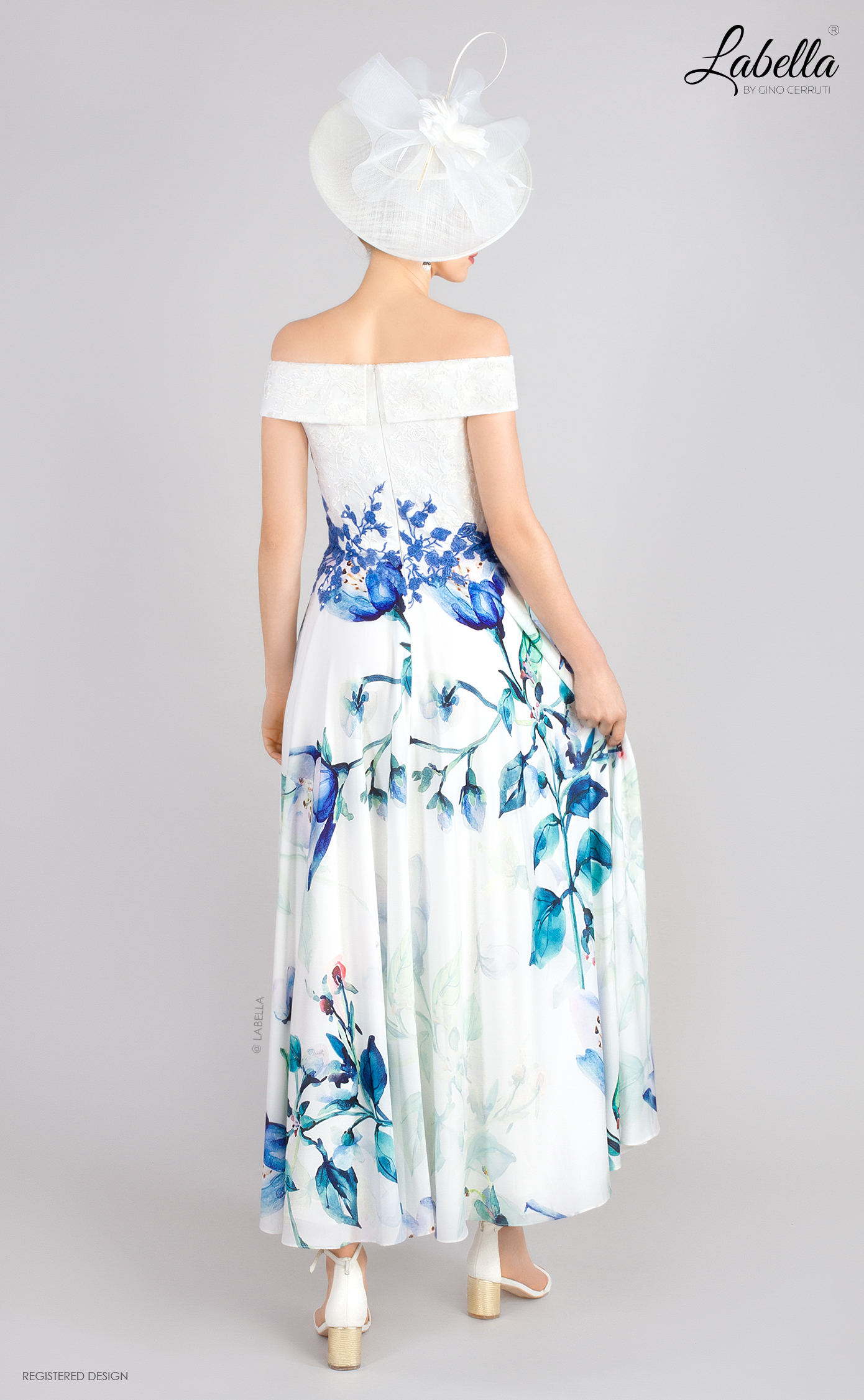 This stunning A-line dress will turn heads as you float into any room! The off-shoulder design beautifully accentuates the shoulders, adorned with delicate lace detail and a bold print skirt that falls to the ankle. This ultra-feminine style is perfect for a vibrant young woman or a stylish mother of the bride. * Off-shoulder * Lace detail bodice * Printed skirt * A-line * Ankle-length