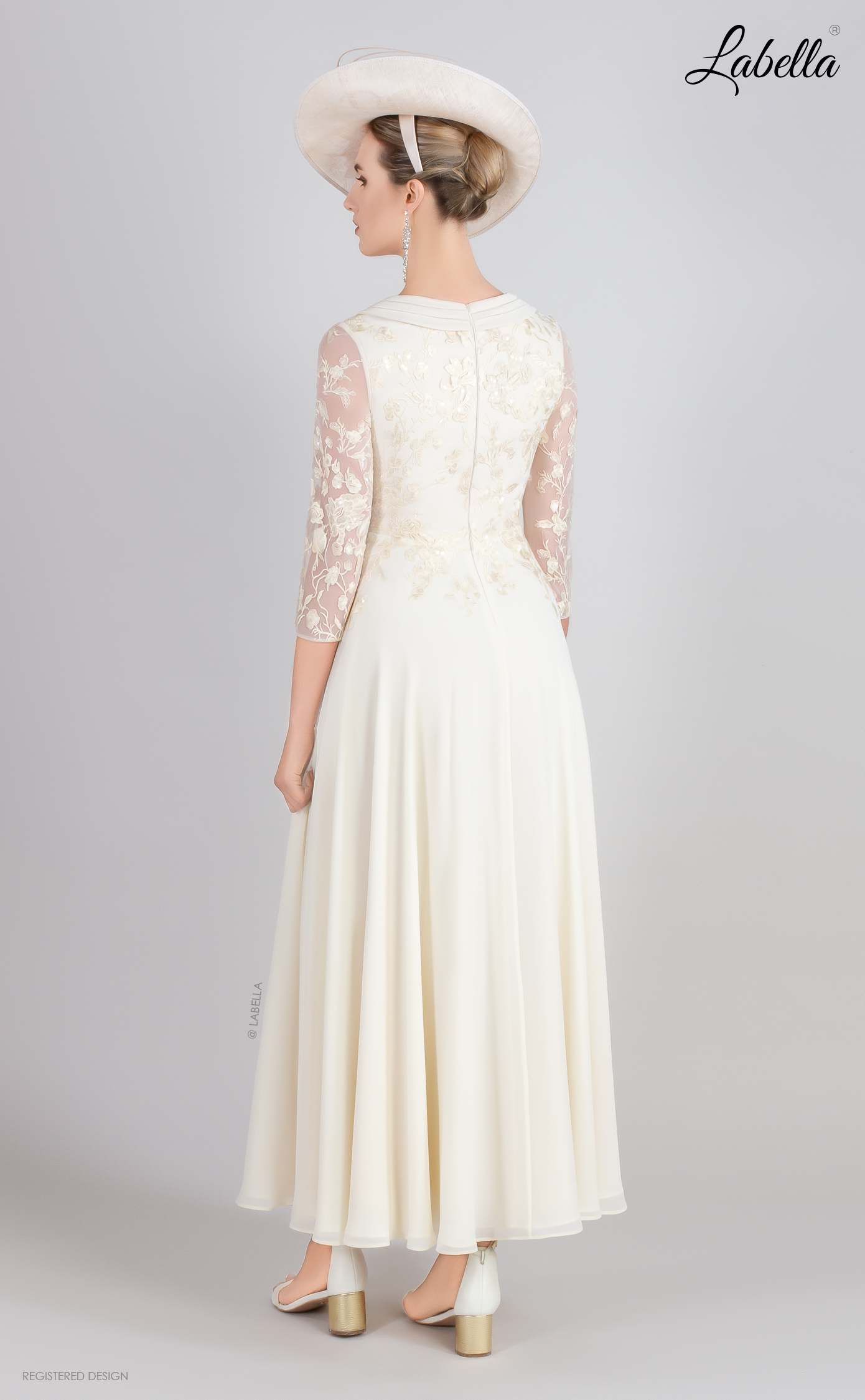 A dress for the big day! Classic, modern, and sophisticated, this gown features a crossover V-neckline adorned with delicate sheer lace. The ankle-length chiffon dress boasts an A-line silhouette, complemented by a stunning sparkling fastening at the waist. * V-neck * Cross-over style * Lace bodice * Beaded brooch feature * 3/4 sleeves * Ankle length * A-Line pleated skirt