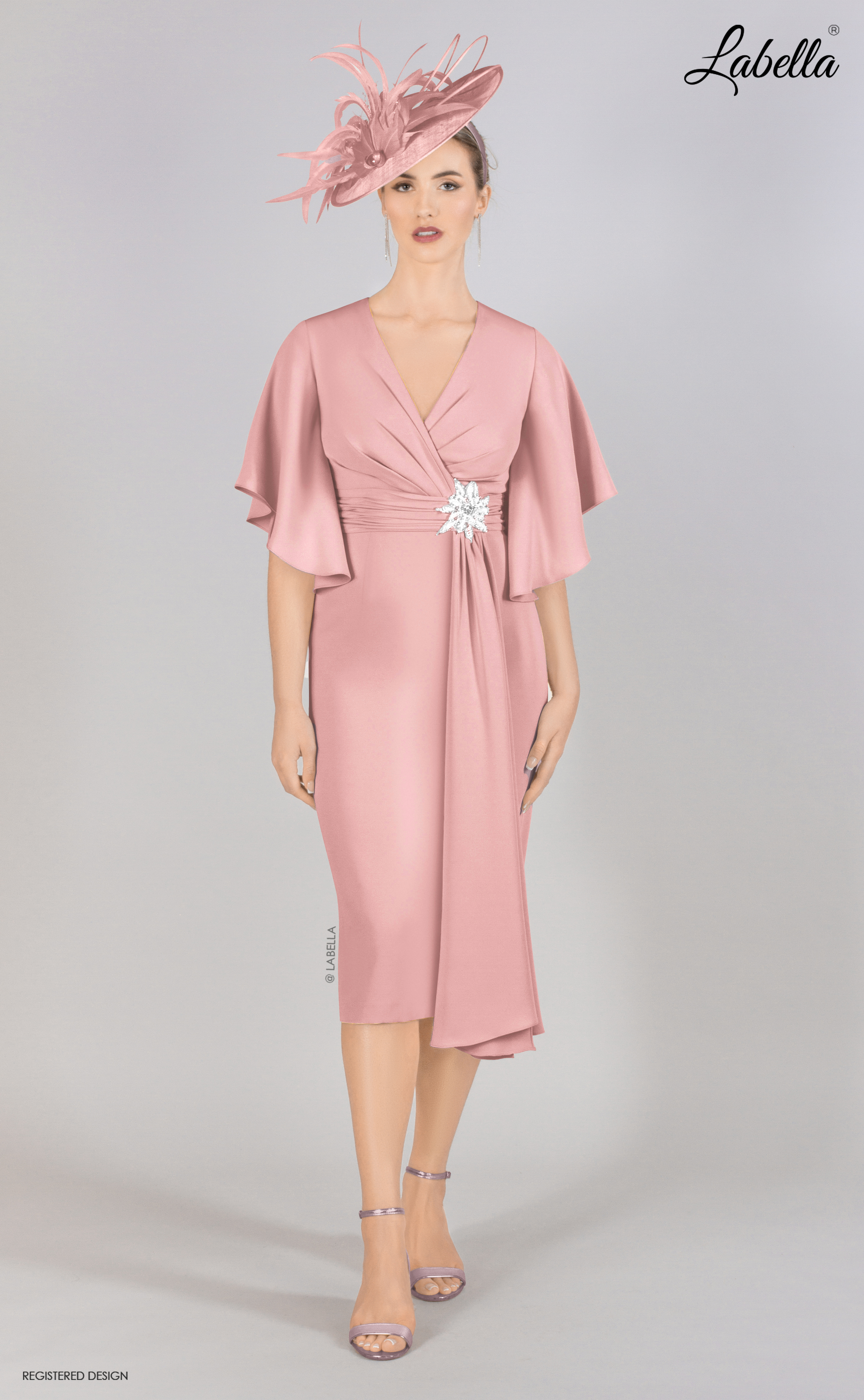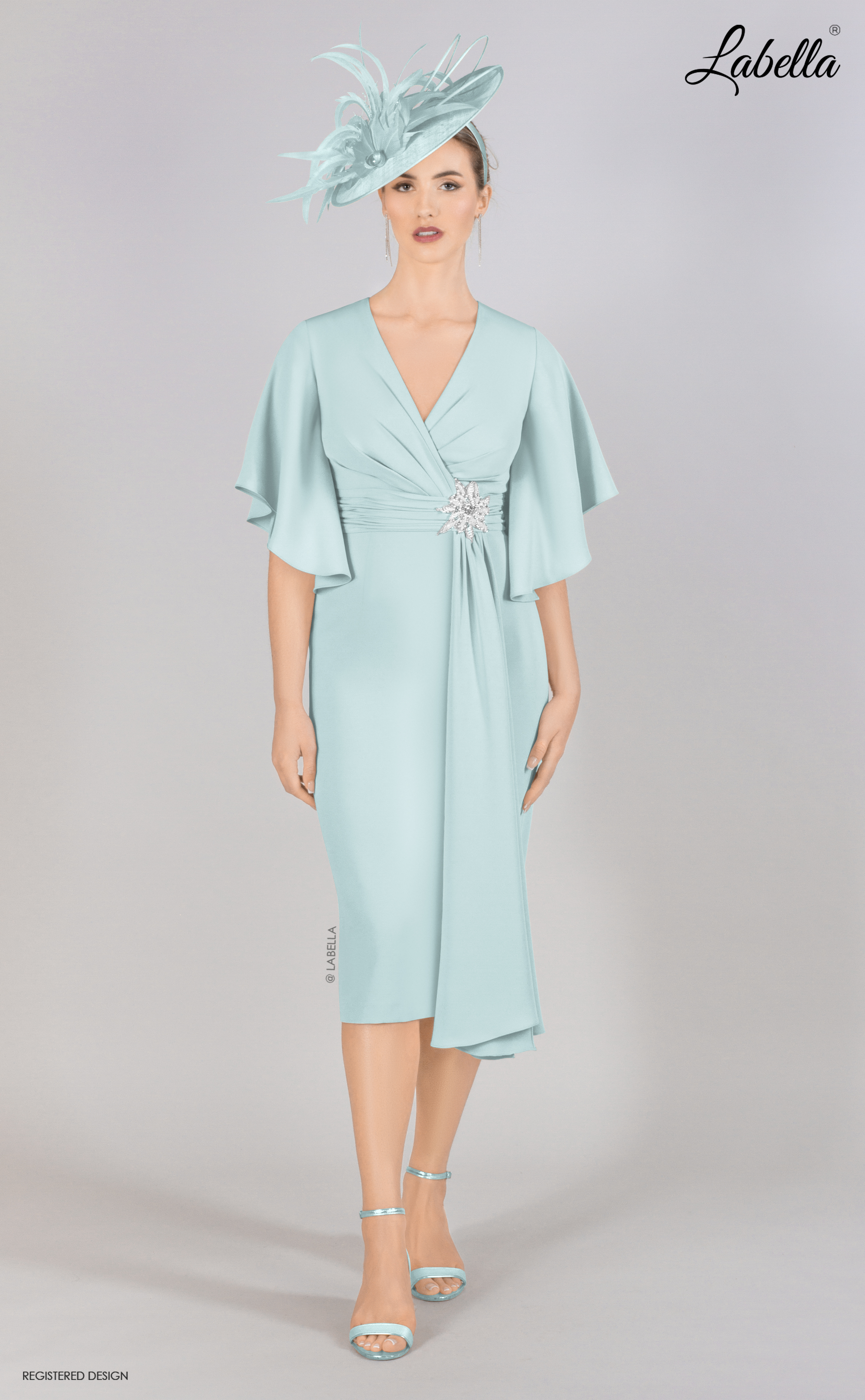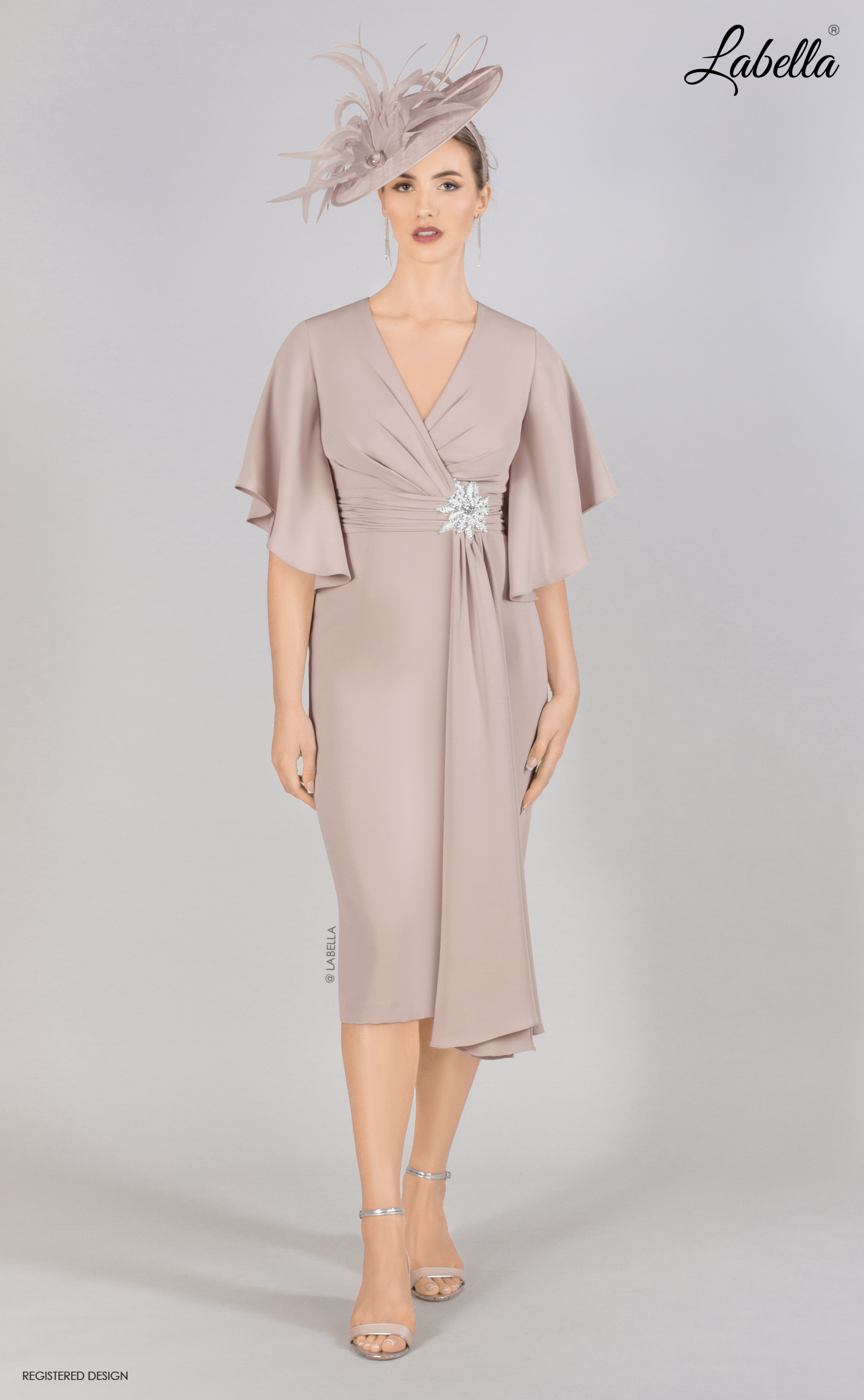 This knee-length dress is both floaty and fitted, featuring a classic cross-body style with a belt jewel detail that cinches at the waist. The added fabric falls elegantly down the front of the skirt, while beautiful bell sleeves cascade over the shoulders, creating a chic yet sophisticated look. • V-neck • Cross-over top • Beaded jewel feature • Ruffle sleeves • Form-fitting silhouette • Knee length