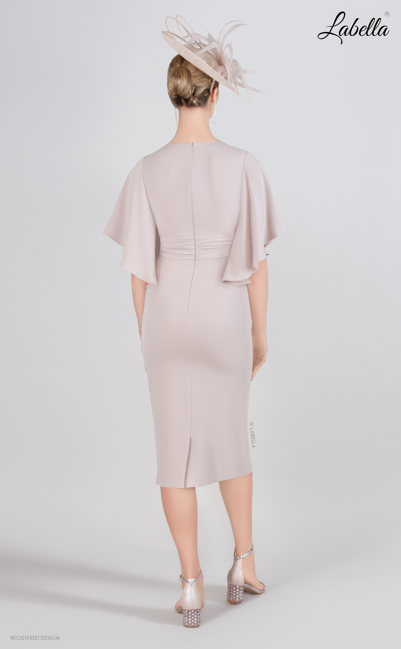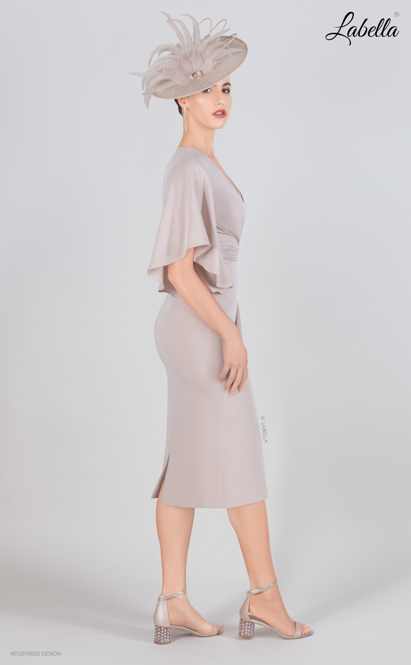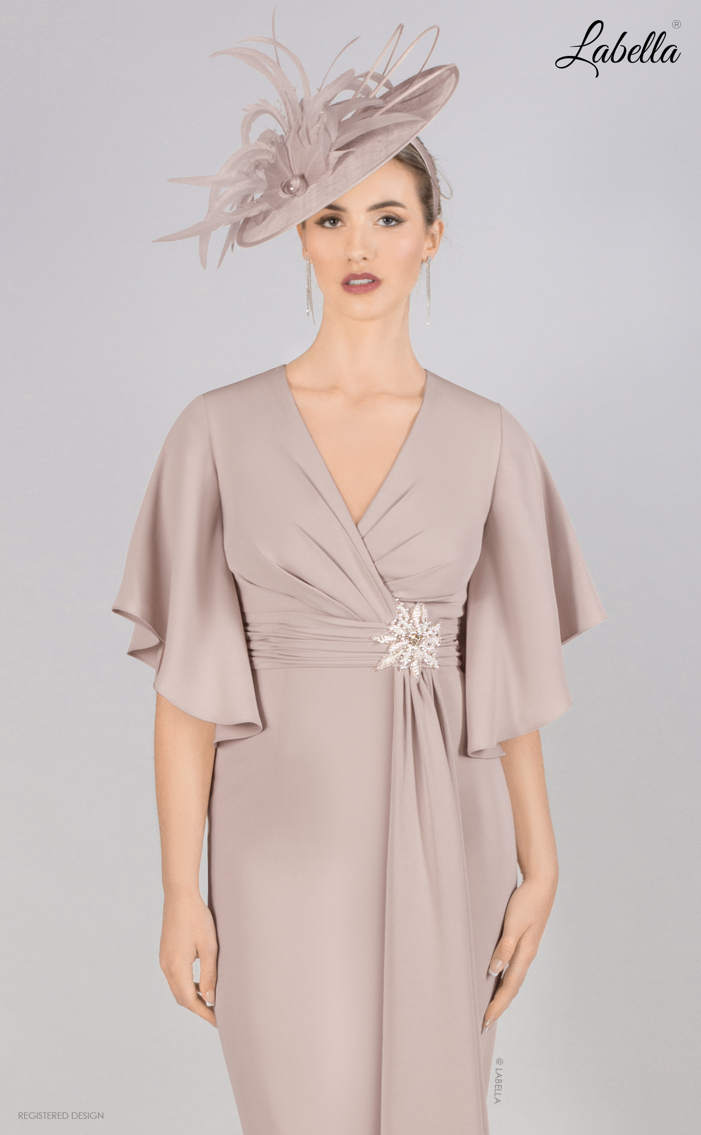 This knee-length dress is both floaty and fitted, featuring a classic cross-body style with a belt jewel detail that cinches at the waist. The added fabric falls elegantly down the front of the skirt, while beautiful bell sleeves cascade over the shoulders, creating a chic yet sophisticated look. • V-neck • Cross-over top • Beaded jewel feature • Ruffle sleeves • Form-fitting silhouette • Knee length