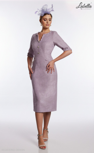 The Liberty dress exudes elegance and sophistication, crafted from sumptuous tweed in a delicate lilac hue. Its fitted silhouette is accentuated by stylish seam detailing and chic gold buttons, creating a refined look perfect for any mother of the bride or groom. The subtle texture of the fabric adds depth while offering comfort and ease of movement, ensuring you feel as good as you look. Available in lilac.