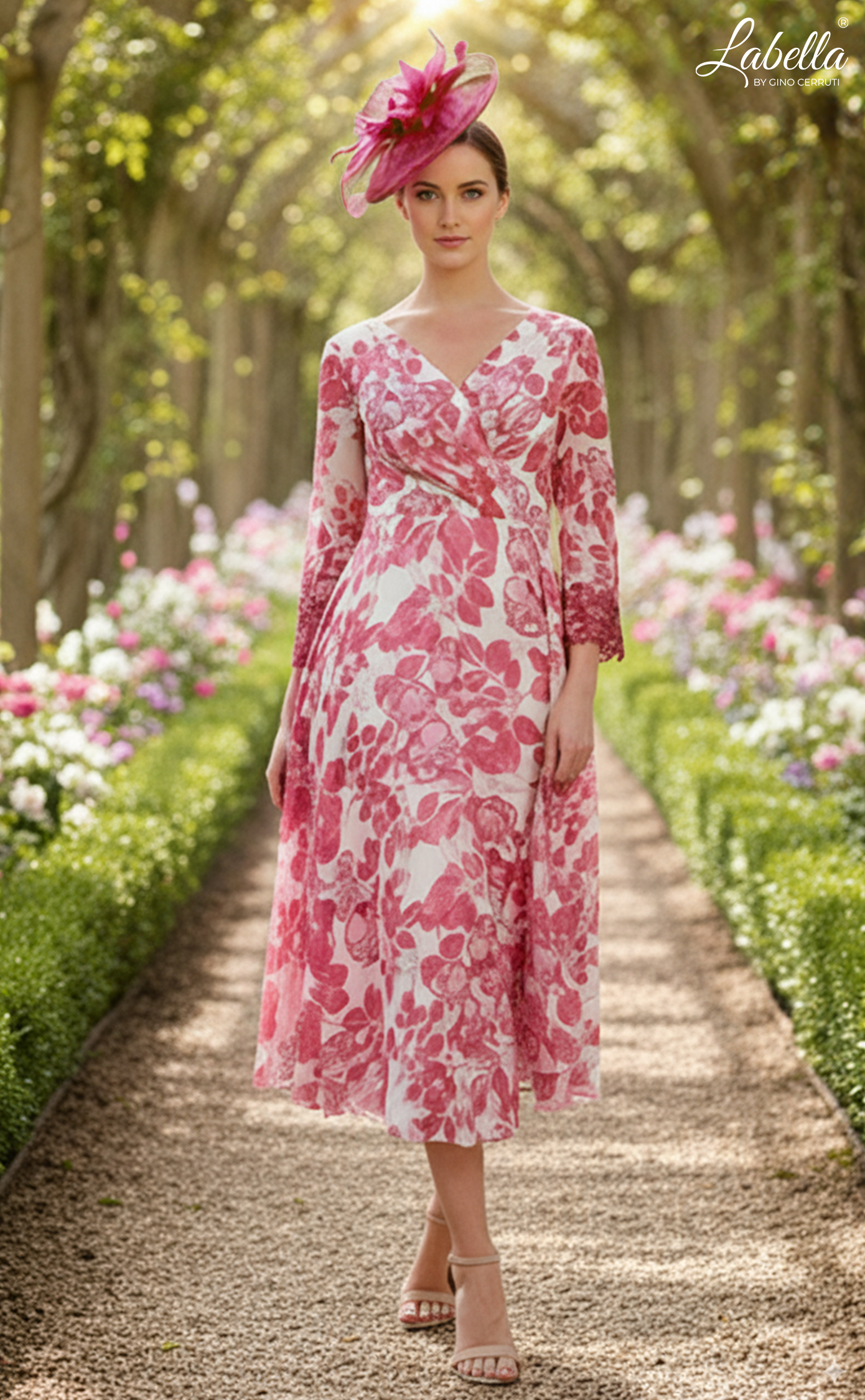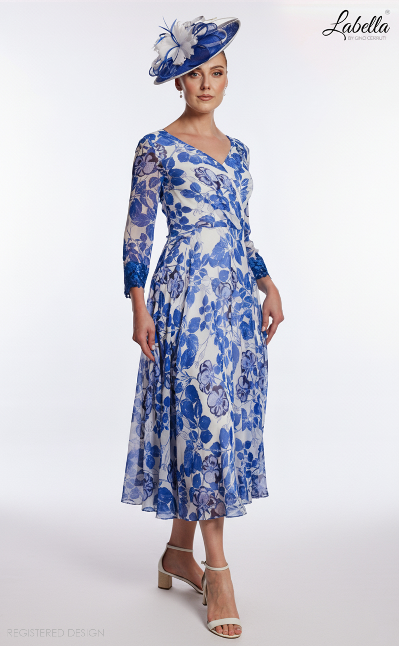 Experience the charm of our exquisite V-neck printed chiffon dress, designed to elevate your wardrobe. This tea-length beauty features 3/4 sleeves adorned with delicate lace trim, adding a touch of elegance. The ruched bodice beautifully shapes your figure, while the pleated A-line skirt flows gracefully with every step. * V-neck * Ruched bodice * 3/4 lace trim sleeves * Pleated A-line skirt * Tea-length Matching hat available to purchase