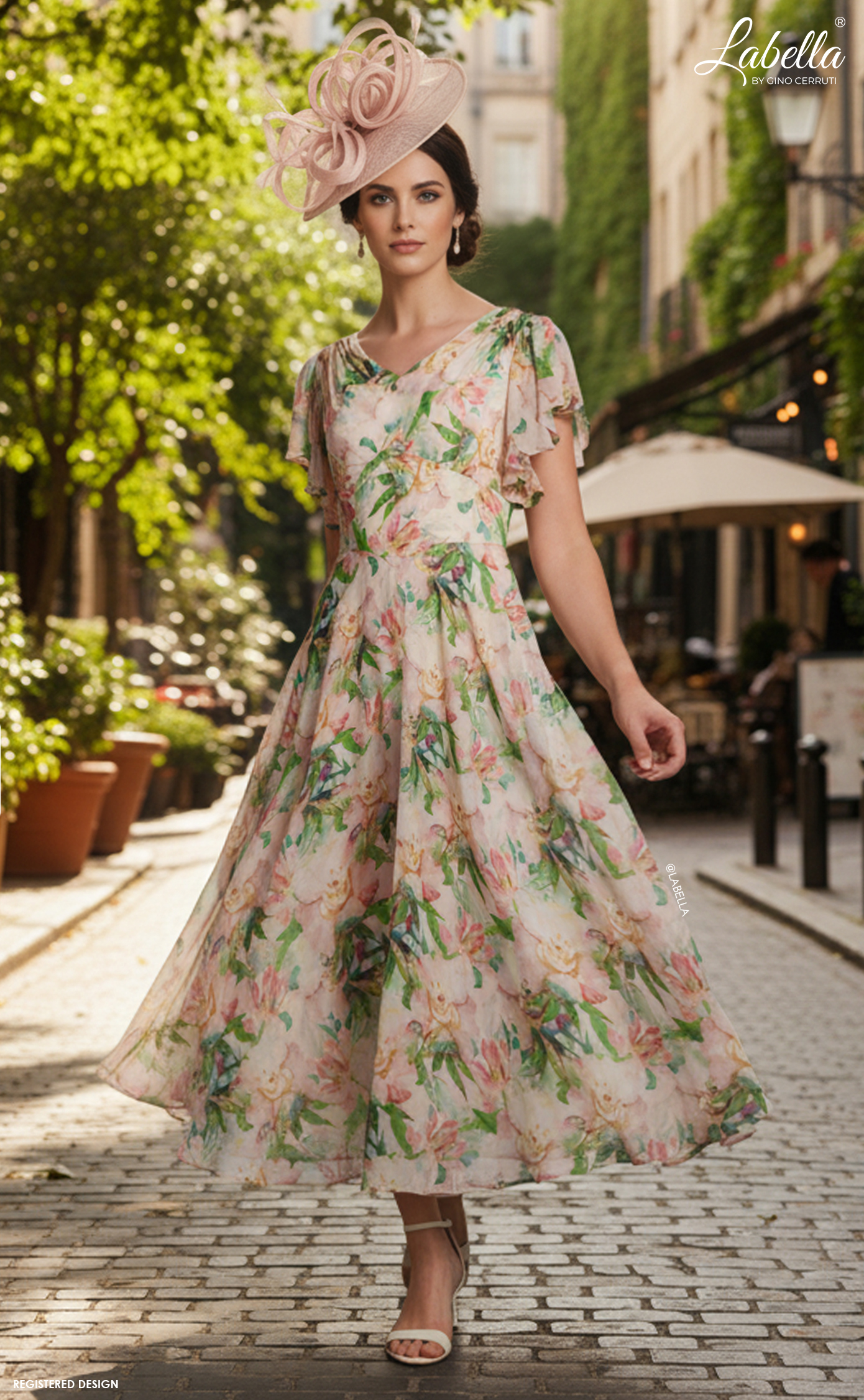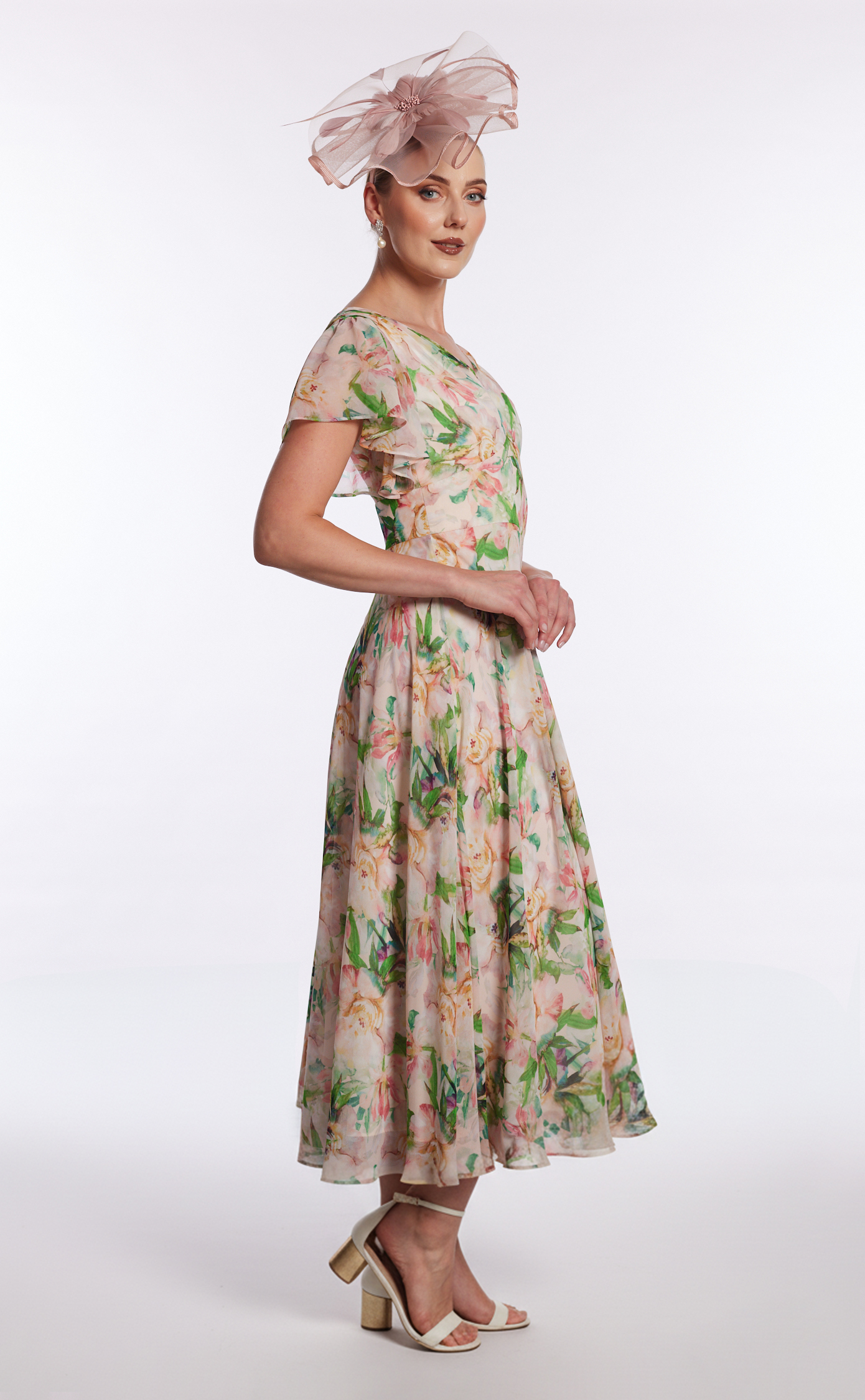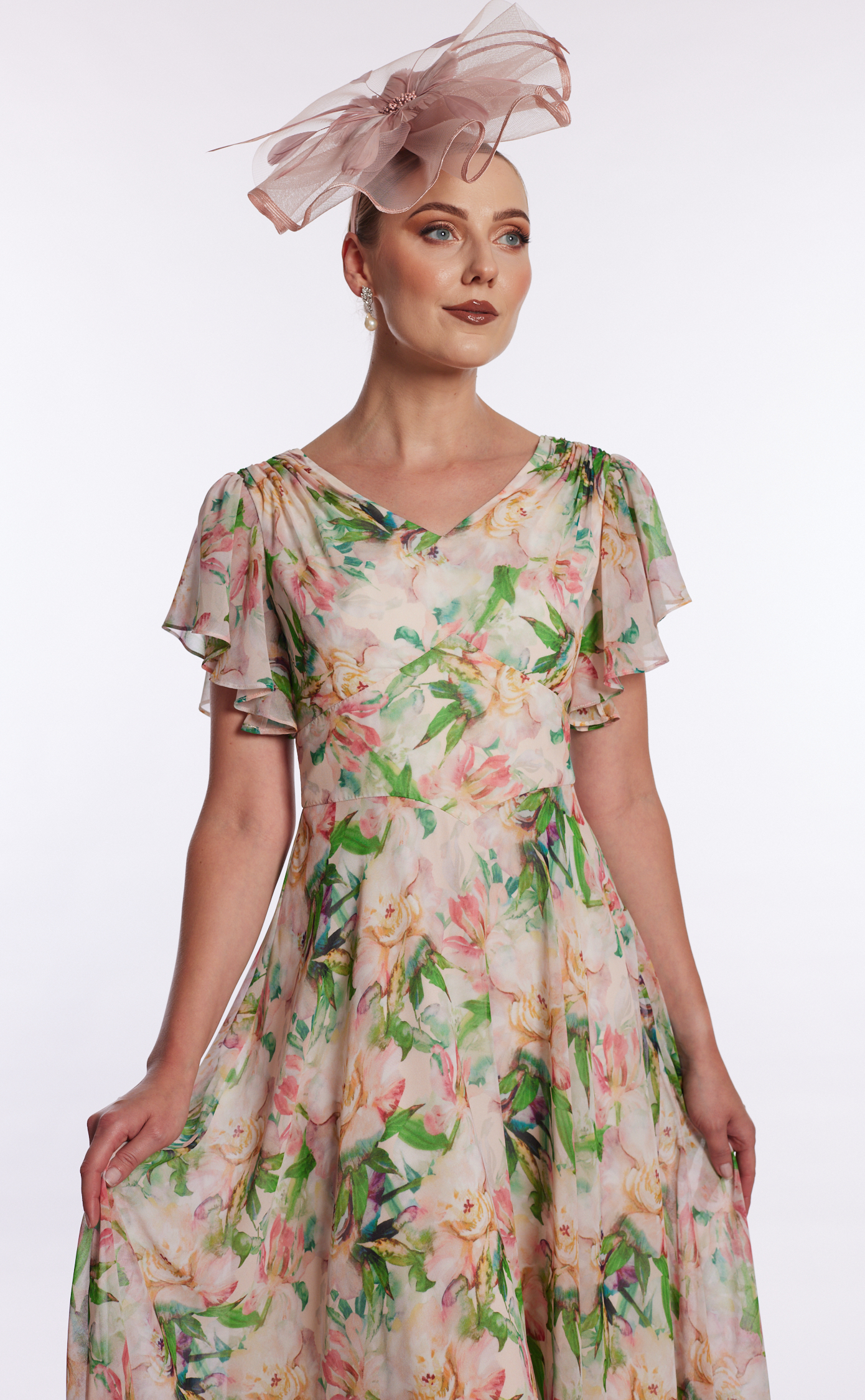 Embrace effortless elegance with our floral printed chiffon dress. This enchanting tea-length design features a flowy A-line pleated skirt that moves beautifully with every step. The V-neckline adds a touch of sophistication, while the flowy short semi-sheer sleeves provide a romantic flair. Perfect for weddings, garden parties, or any special occasion, this dress combines comfort and style, making it a must-have for your 2025 wardrobe. * V-neck * Floral print * Flowy semi-sheer sleeves * Pleated A-line skirt * Tea-length Matching hat available to purchase