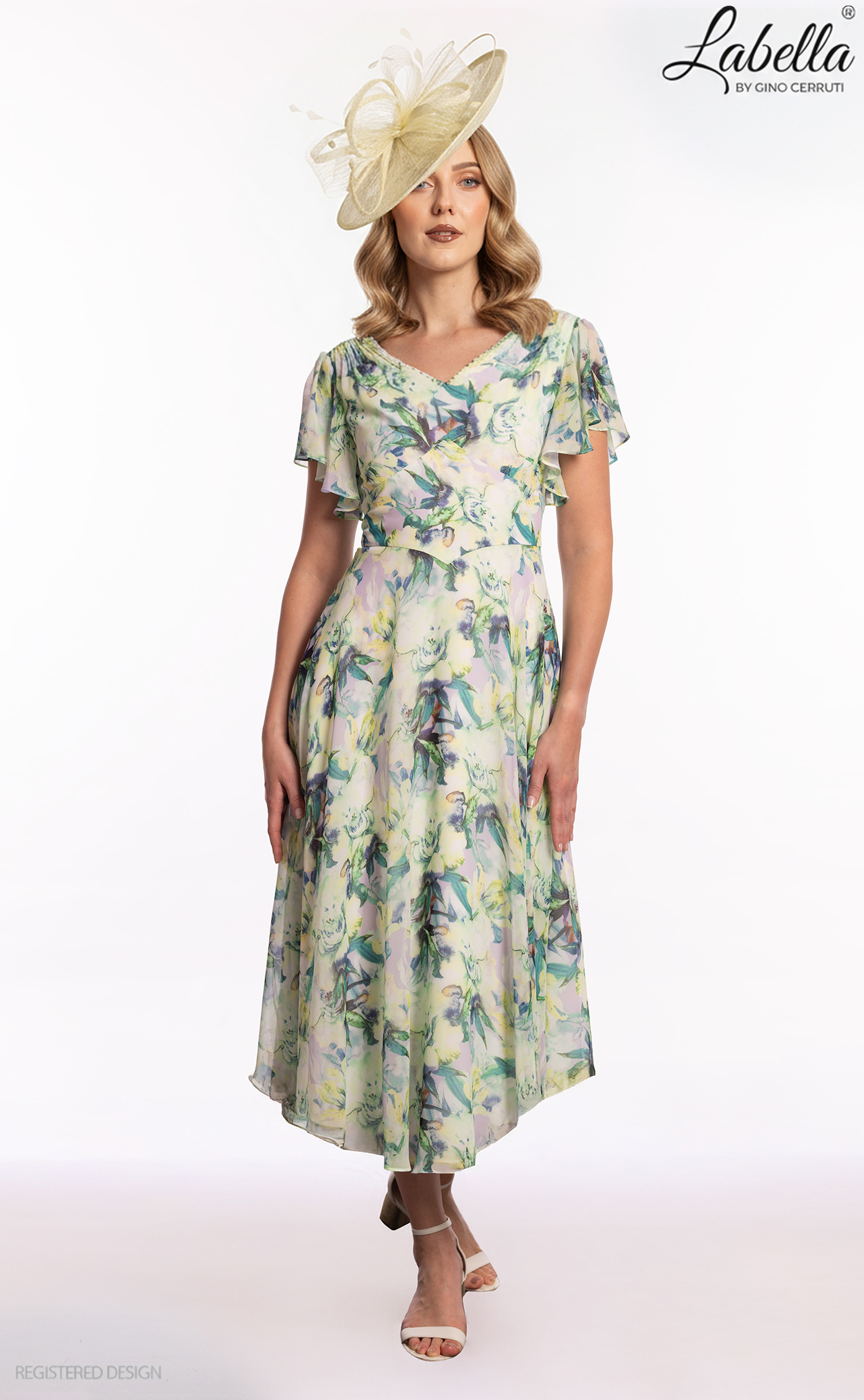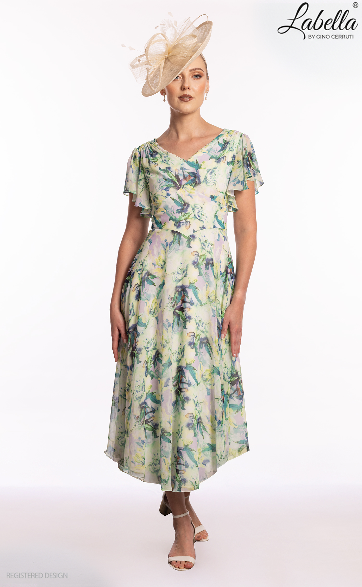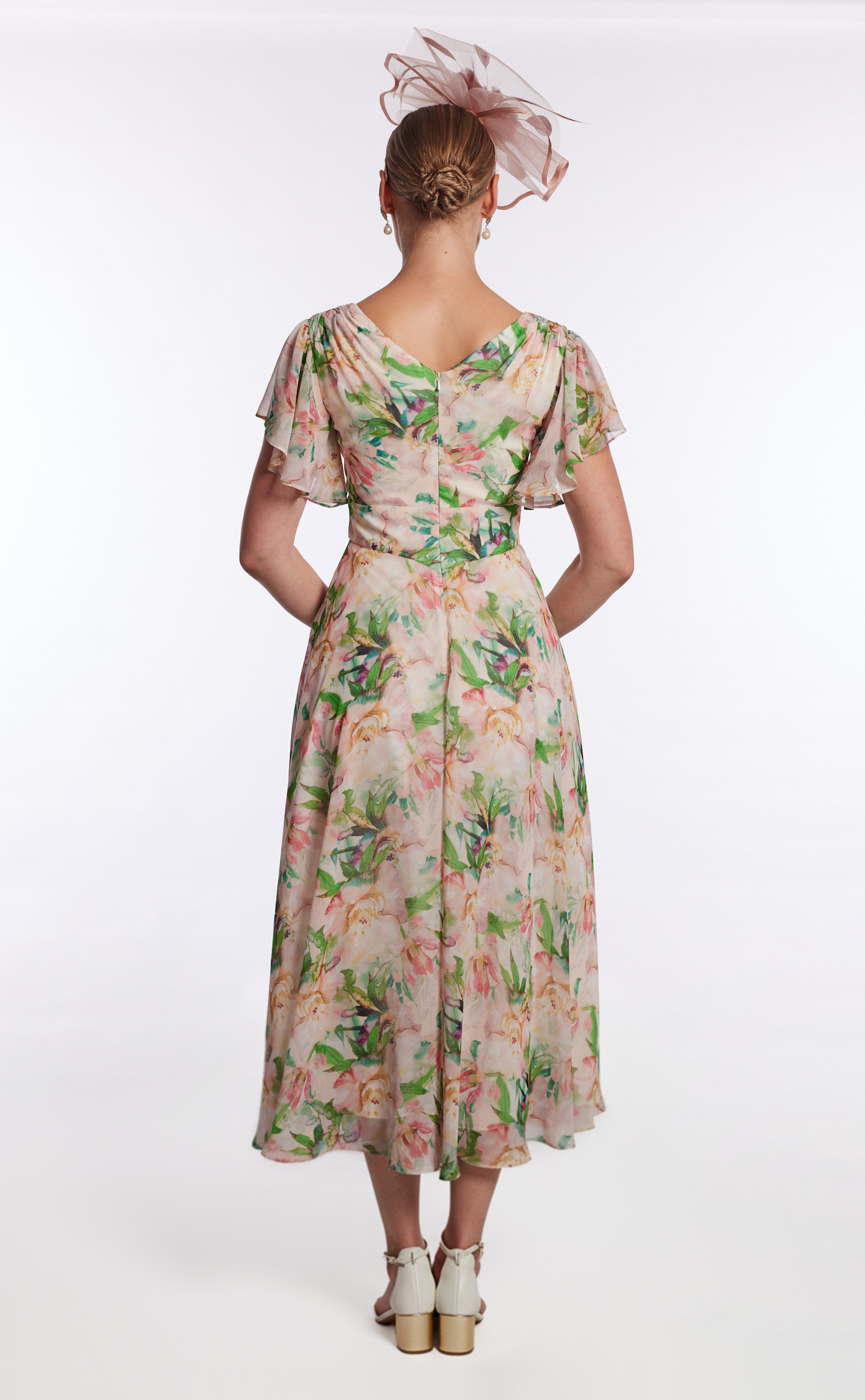 Embrace effortless elegance with our floral printed chiffon dress. This enchanting tea-length design features a flowy A-line pleated skirt that moves beautifully with every step. The V-neckline adds a touch of sophistication, while the flowy short semi-sheer sleeves provide a romantic flair. Perfect for weddings, garden parties, or any special occasion, this dress combines comfort and style, making it a must-have for your 2025 wardrobe. * V-neck * Floral print * Flowy semi-sheer sleeves * Pleated A-line skirt * Tea-length Matching hat available to purchase