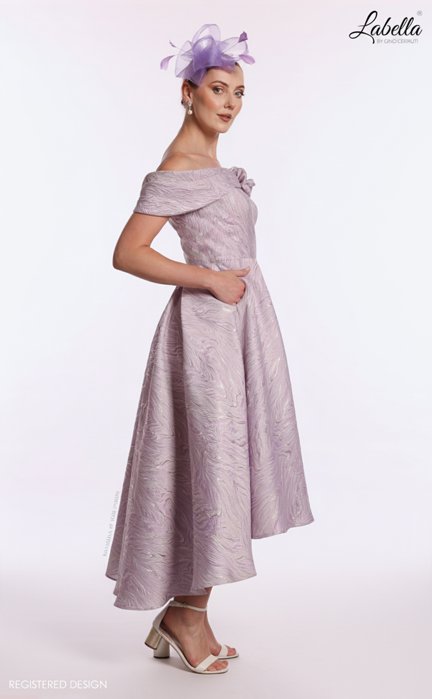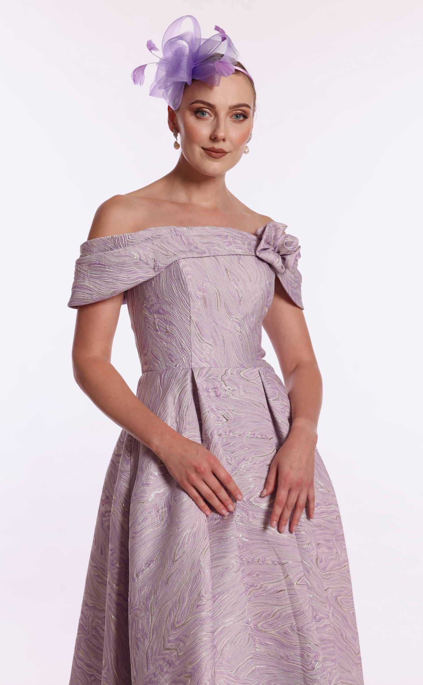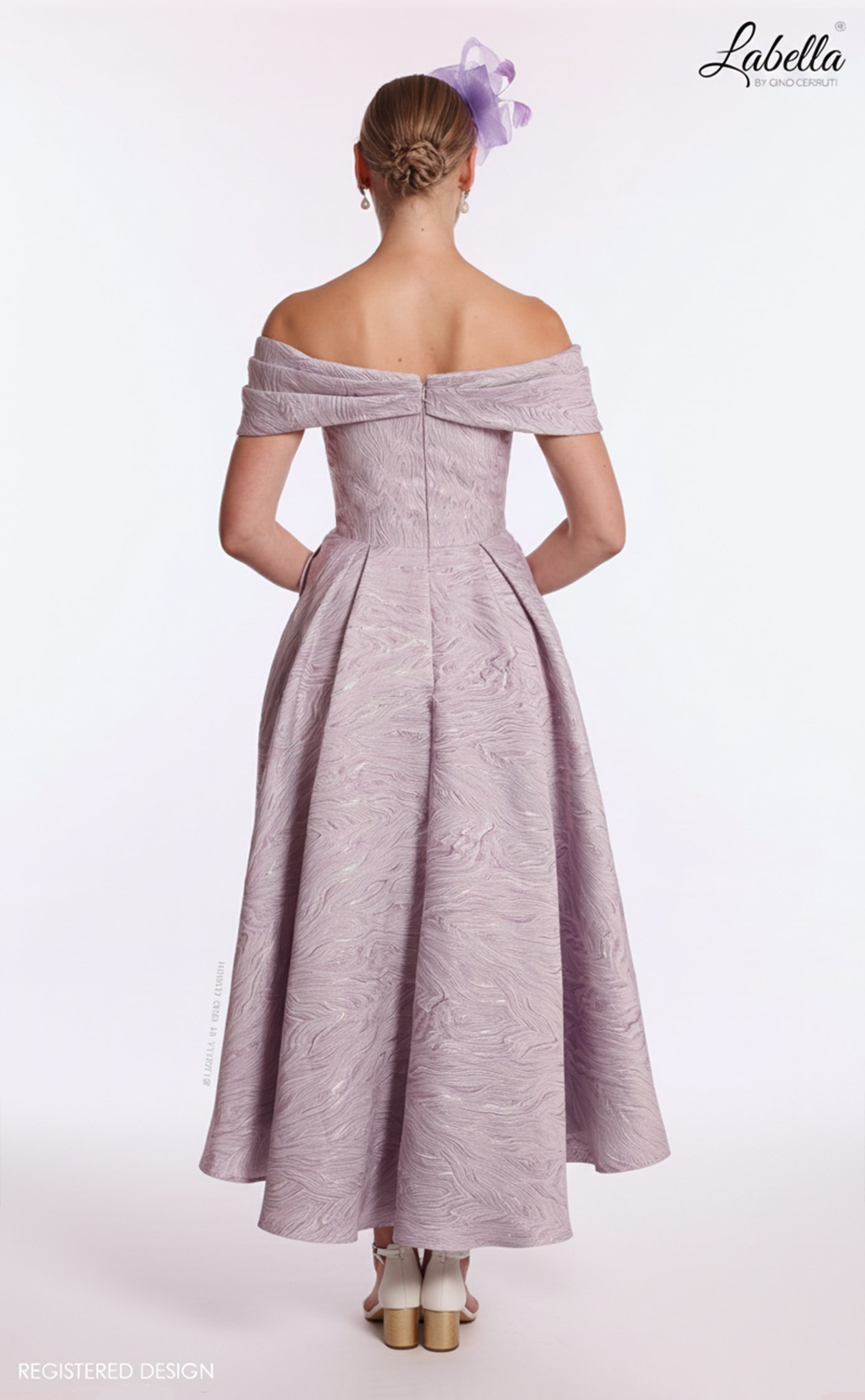 Step into elegance with our off-shoulder jacquard A-line dress, designed to make you stand out at any occasion. This beautiful tea-length dress features delicate pleating on the sleeves, adding a touch of sophistication. The pleated skirt flows gracefully, while the intricate flower details enhance the overall feminine charm of the gown. * Off-shoulder * Pleated sleeves * Flower detail * A-line skirt