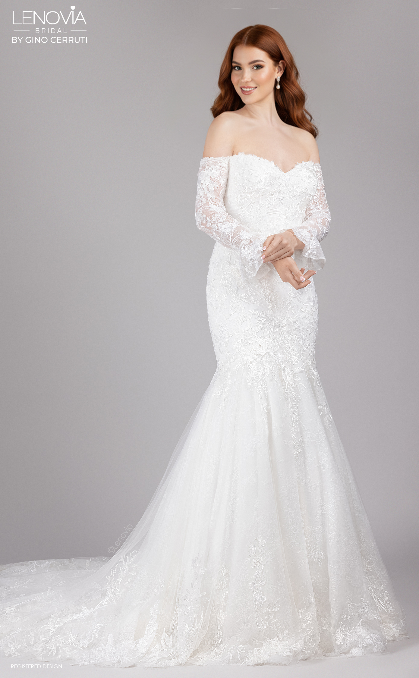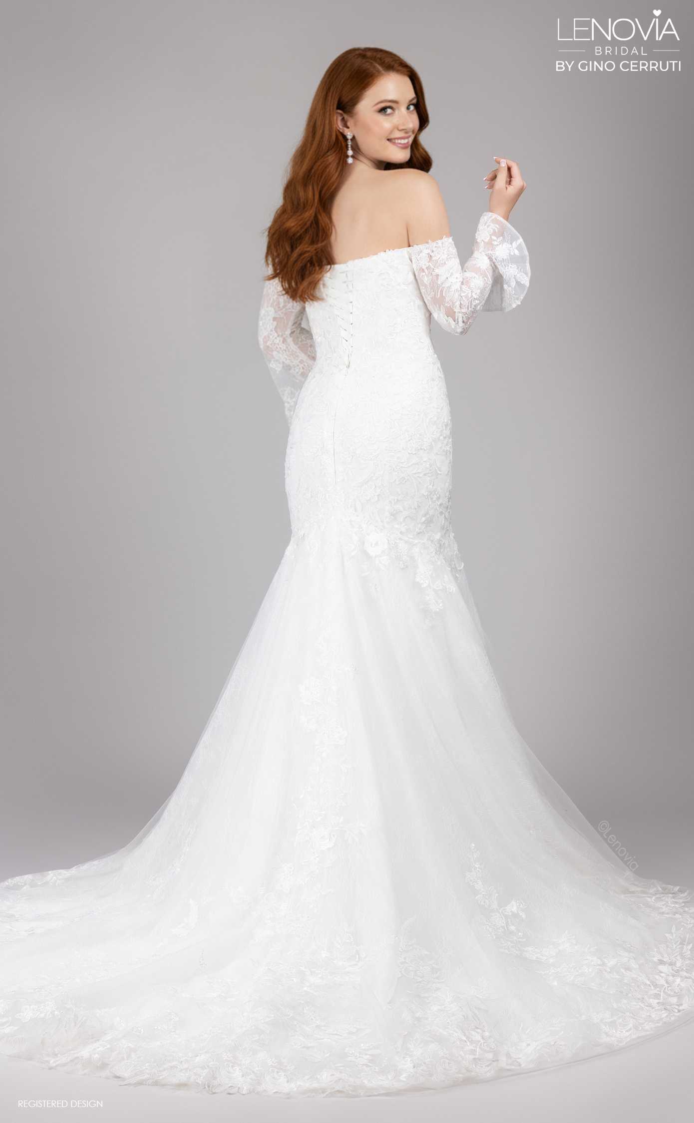 Incredible glamorous dress! This stunning fishtail is beautifully embellished with illusion lace sleeves with wavy piping at the bottom and an all lace silhouette. Bardot neck adds a touch of sexuality, and corset lacing will be the epitome of beauty during the march to the altar. * Illusion flared sleeves * Fishtail silhouette * lace train 70cm * Bardot neckline