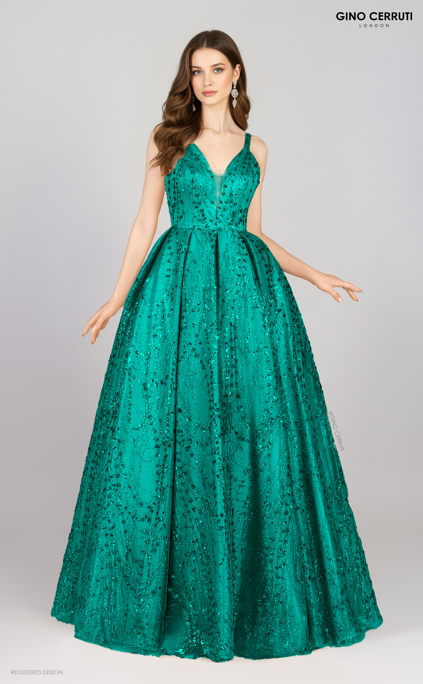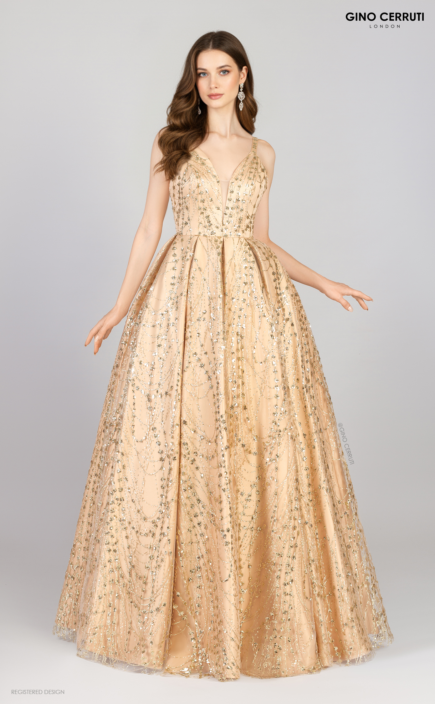 This gorgeous ball gown dress will capture your heart at first sight! Featuring a sparkling bodice and skirt, an open V-neck décolleté, and a V-shaped back, this dress exudes femininity and makes a bold statement for any special occasion. * V neck with mesh panel * Glitter and beading details * Matching beaded straps * A-line skirt with box pleats