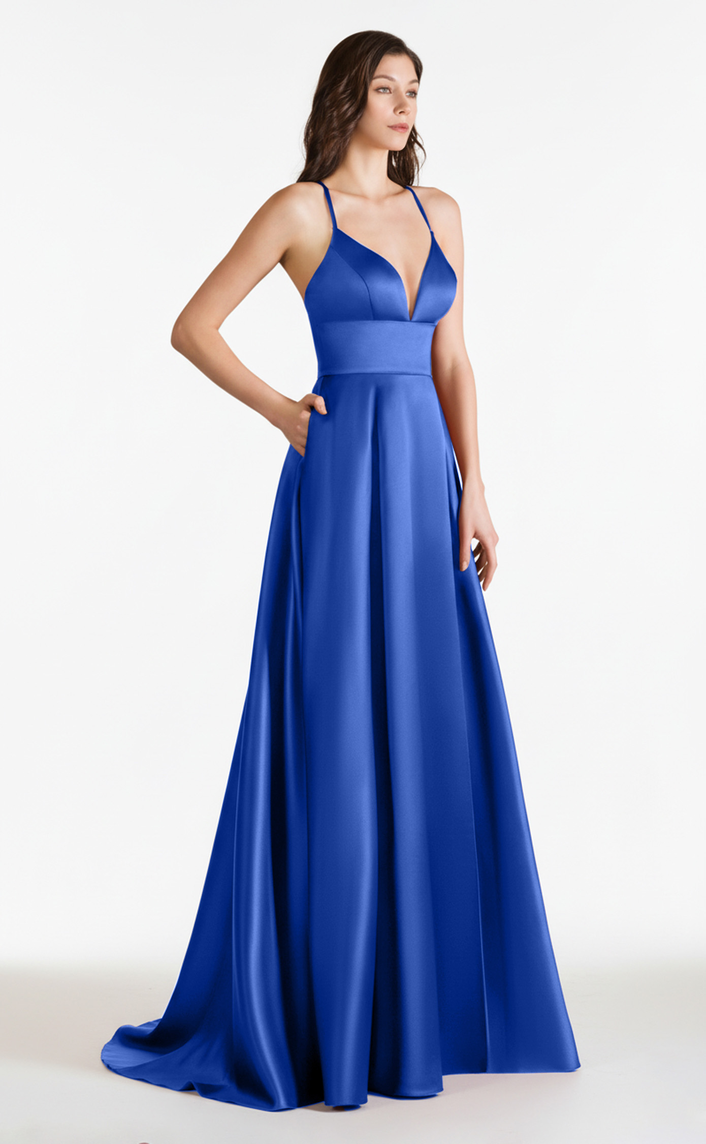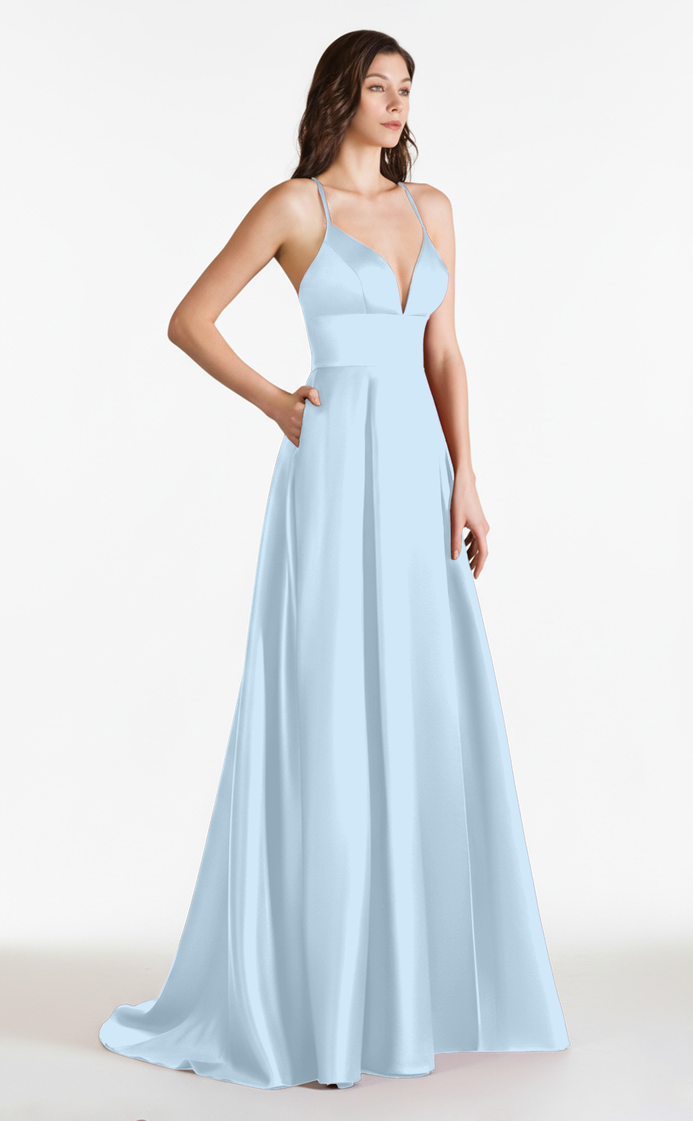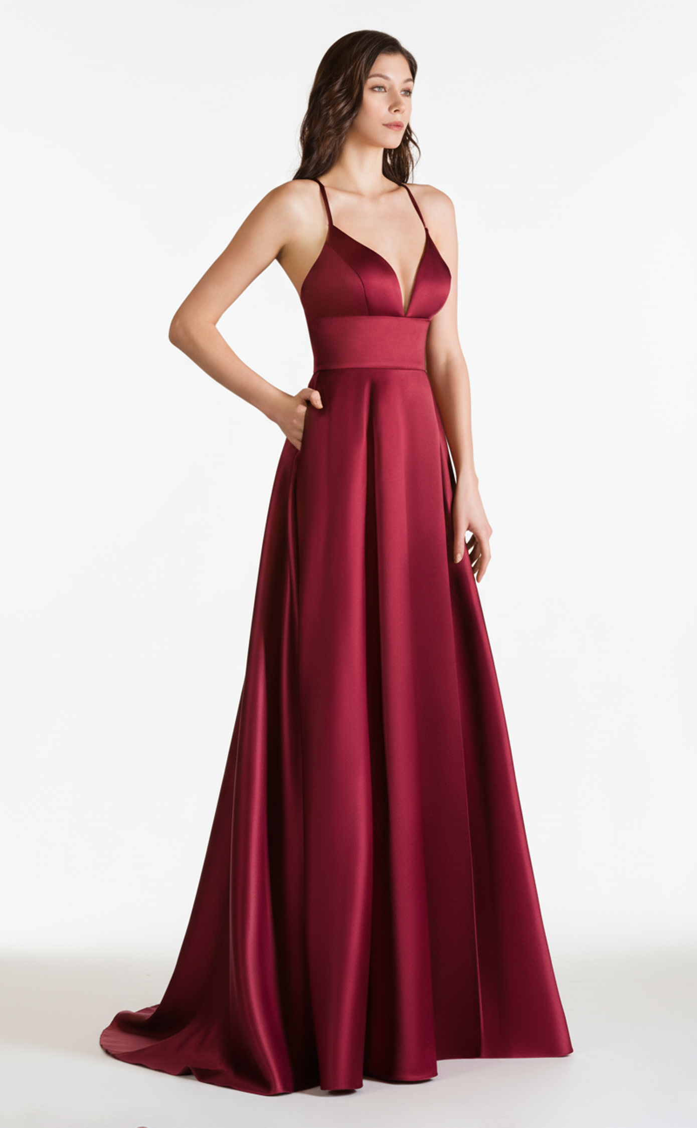 Simply spectacular, this dress combines romance, a touch of sexiness, and sophistication. The accentuated waistline and V-neck bodice with delicate spaghetti straps that cross at the back create a charming silhouette. A deep waistband enhances your figure, complemented by a beautiful A-line skirt that makes you feel like a real princess. * Plunge V neck * Accentuated waistband * A-line skirt * Pockets * Leg slit