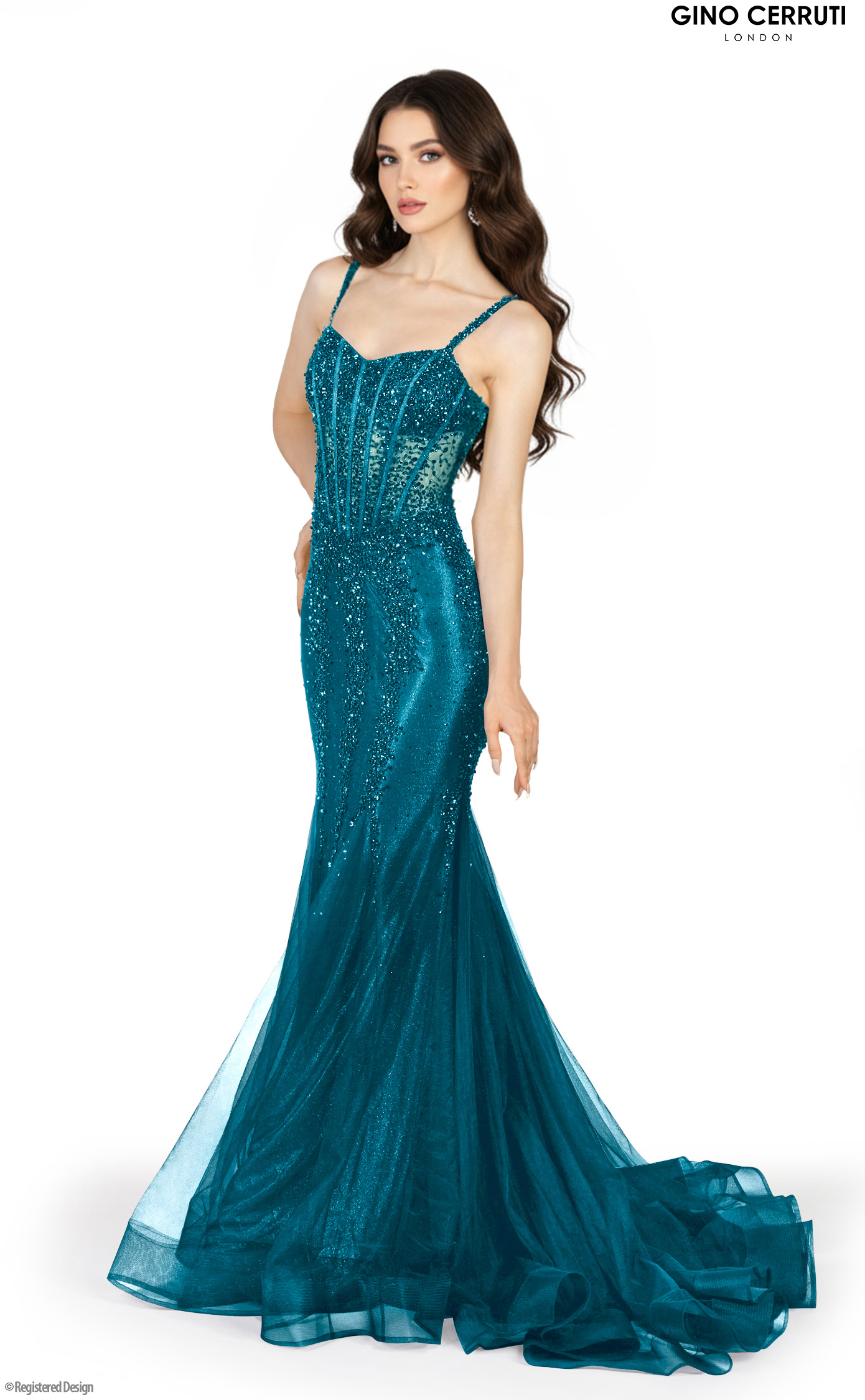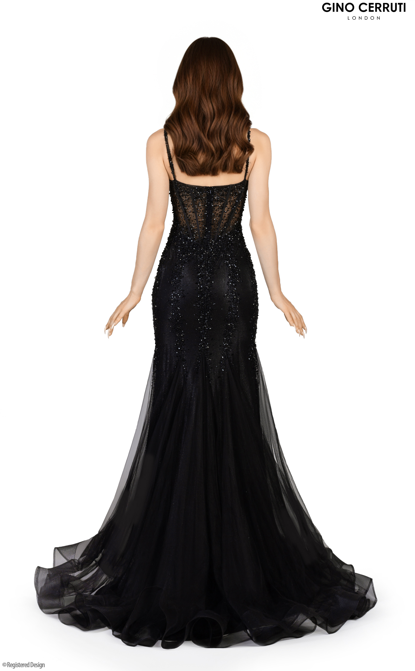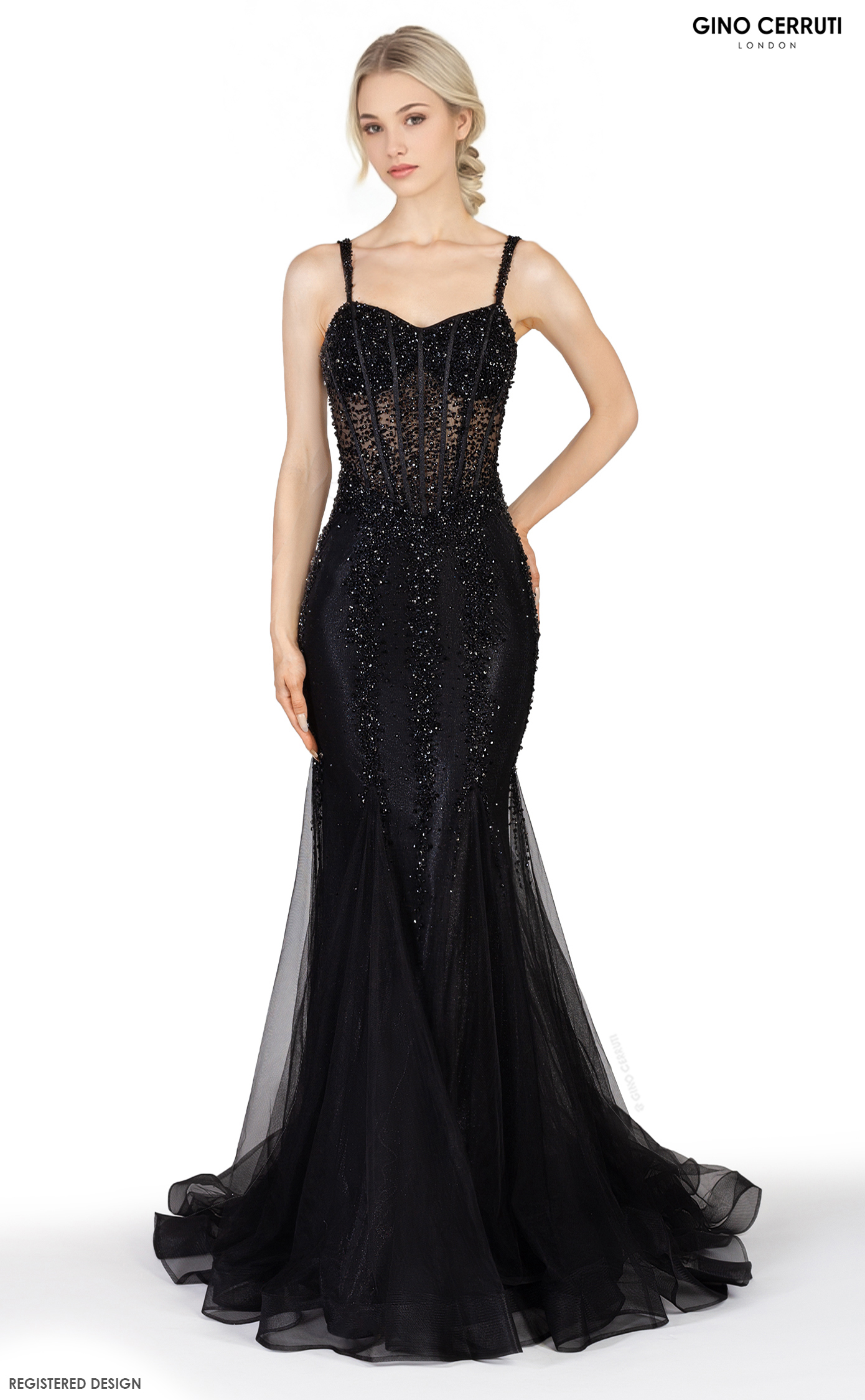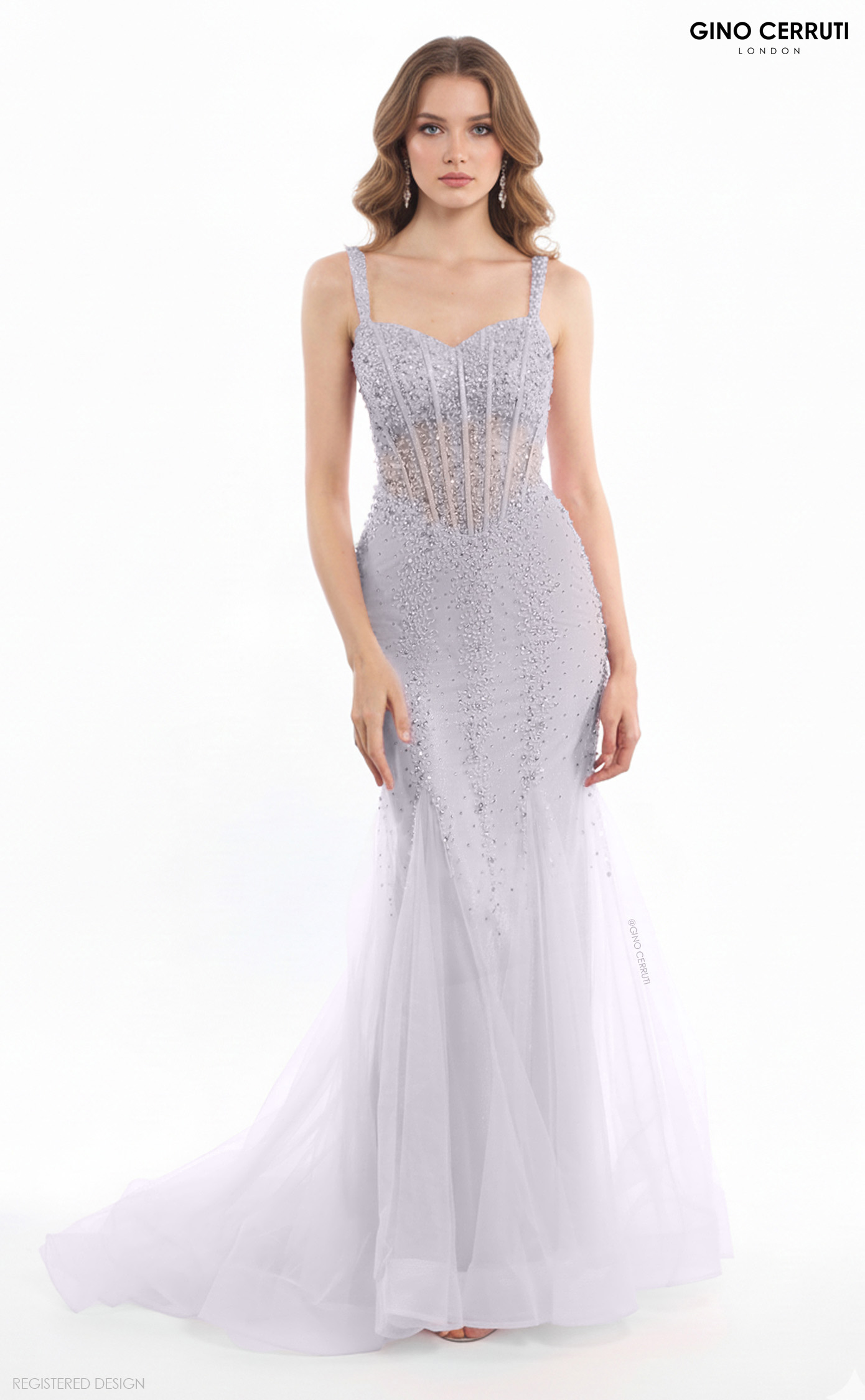This form-fitting mermaid dress features a sweetheart neckline on thin embellished straps. The stunning beading and sequin gradient create a sparkling showstopper, while the sheer corseted bodice adds a touch of sexiness to the elegant silhouette. * Beaded straps * Corset top * Beaded bodice * Flowing fishtail skirt * Small train.