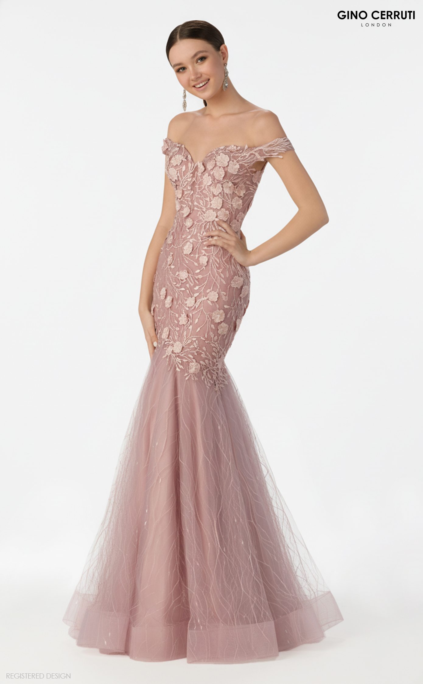 Floral lace appliques bloom in the faintest shade of pink on this romantic ball gown, with a flowing fishtail skirt. An off-shoulder fitted bodice creates a soft outline and highlights the delicate aspects of anyone's personality. * Lace applique * Mermaid silhiuette * Form-fitting corset * Off-the-schoulder neckline