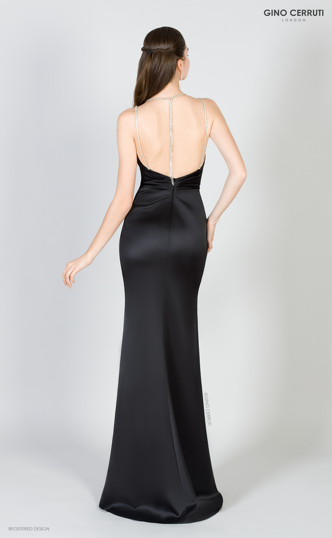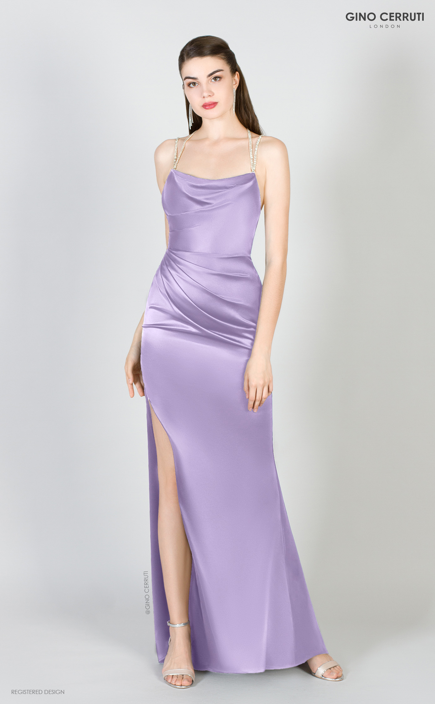 Soft satin for days! This stunning dress features a cowl neckline draping from beaded straps, with side pleating and a thigh-high slit for a sexy touch. The flattering back pleating and delicate hanging beads ensure all eyes are on you as you walk away. * Cowl neck * Side pleating * Beaded strap detailing * Thigh high slit