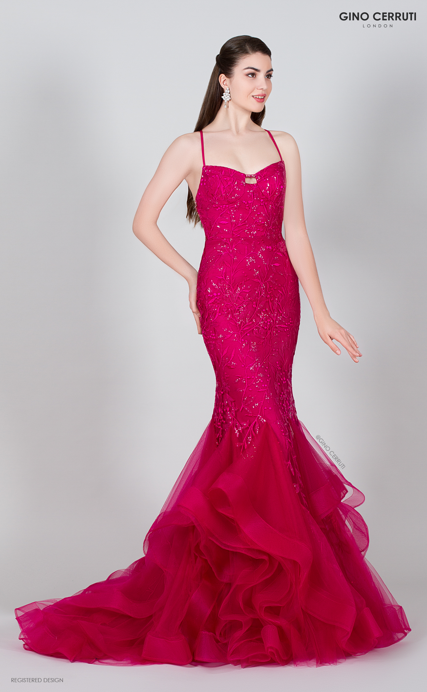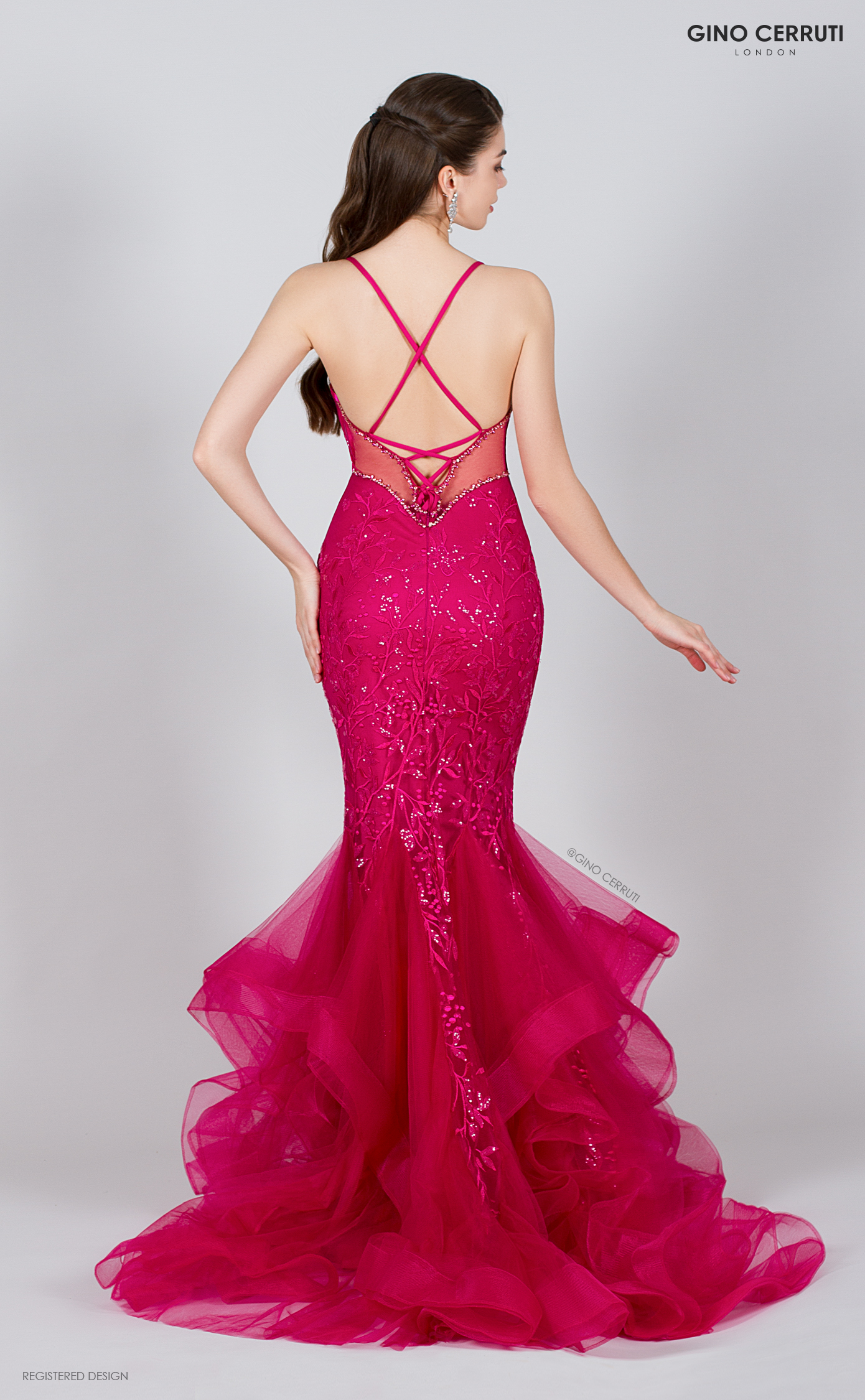 This dress is truly worthy of a prom queen with its stunning mermaid silhouette! Crafted from tulle fabric adorned with shimmering elements and intricate beading, it features a fitted bodice and voluminous ruffles on the skirt, complete with a small train for the perfect dramatic effect. * Keyhold cutout neckline * Layered tulle skirt * Small train * Lace up back
