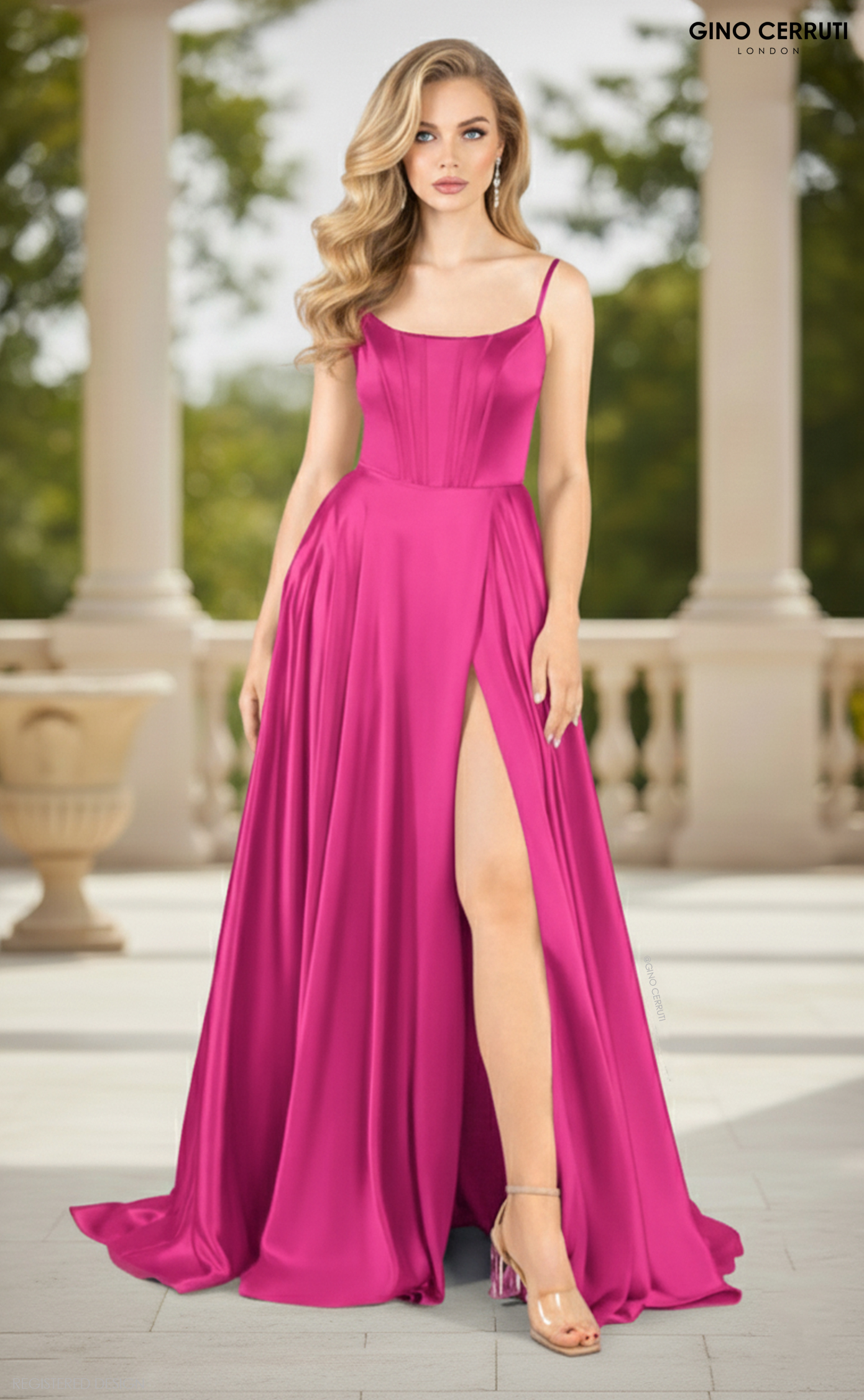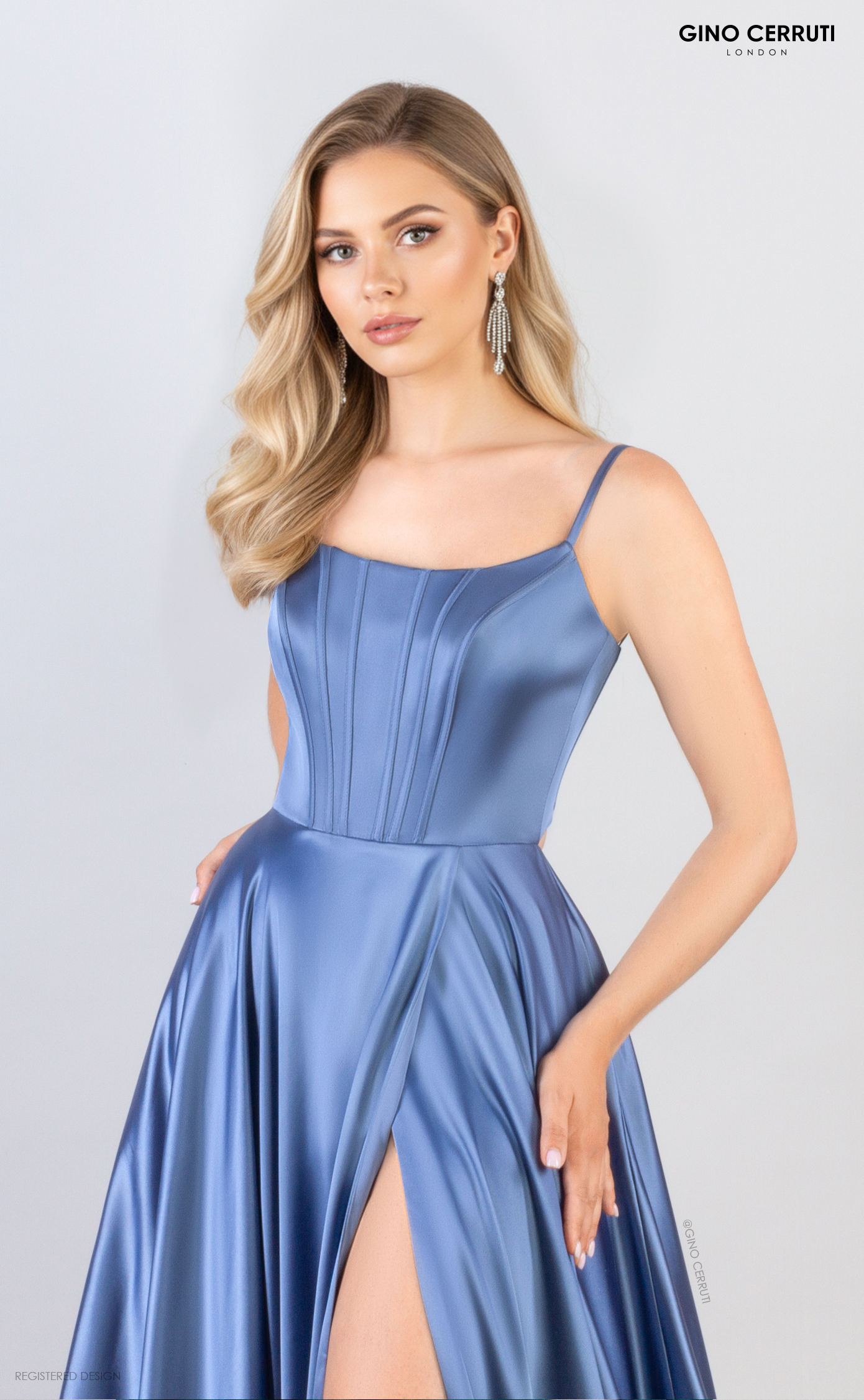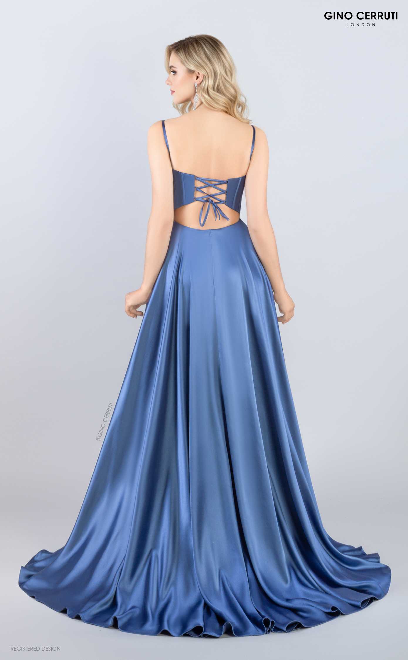 This beautiful satin gown features vintage detailing, including a corset-style bodice and a tie-up cut-out back that pulls in the waist. The spaghetti straps and leg slit add a trendy touch, while the glamorous train skirt pools elegantly to the floor. Versatile, simple, and chic! • Scoop neckline • Corset top • Leg slit • Floor length with train • Lace up back
