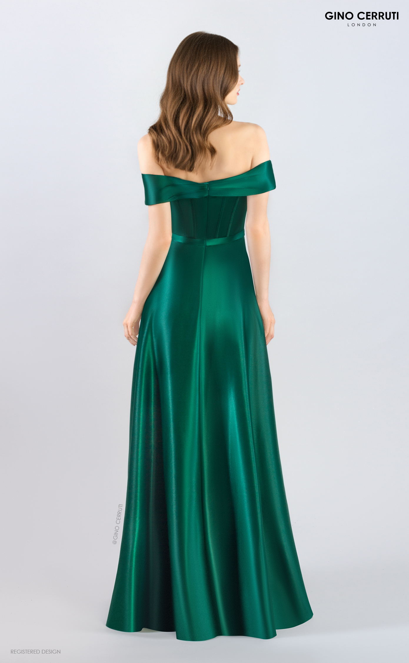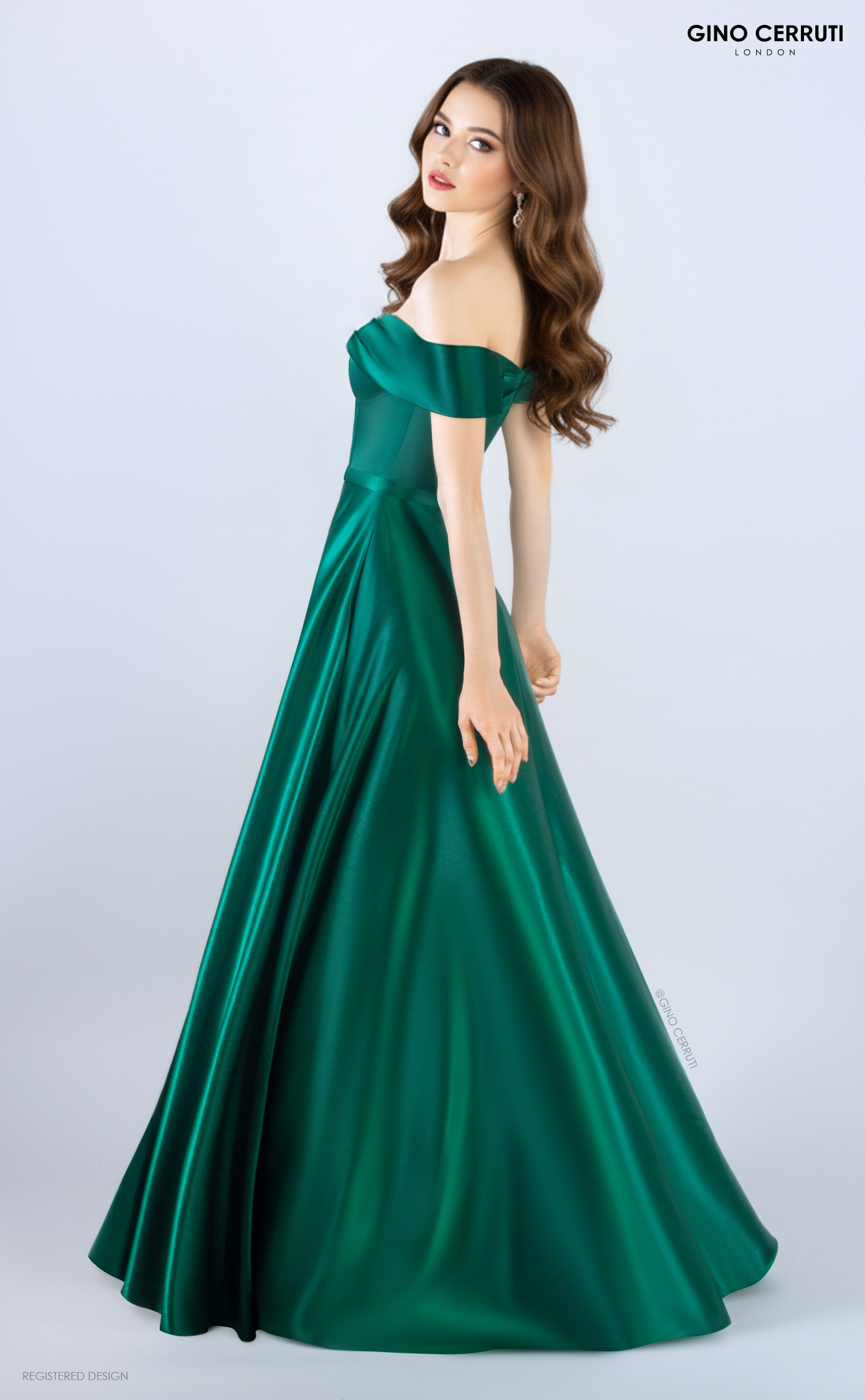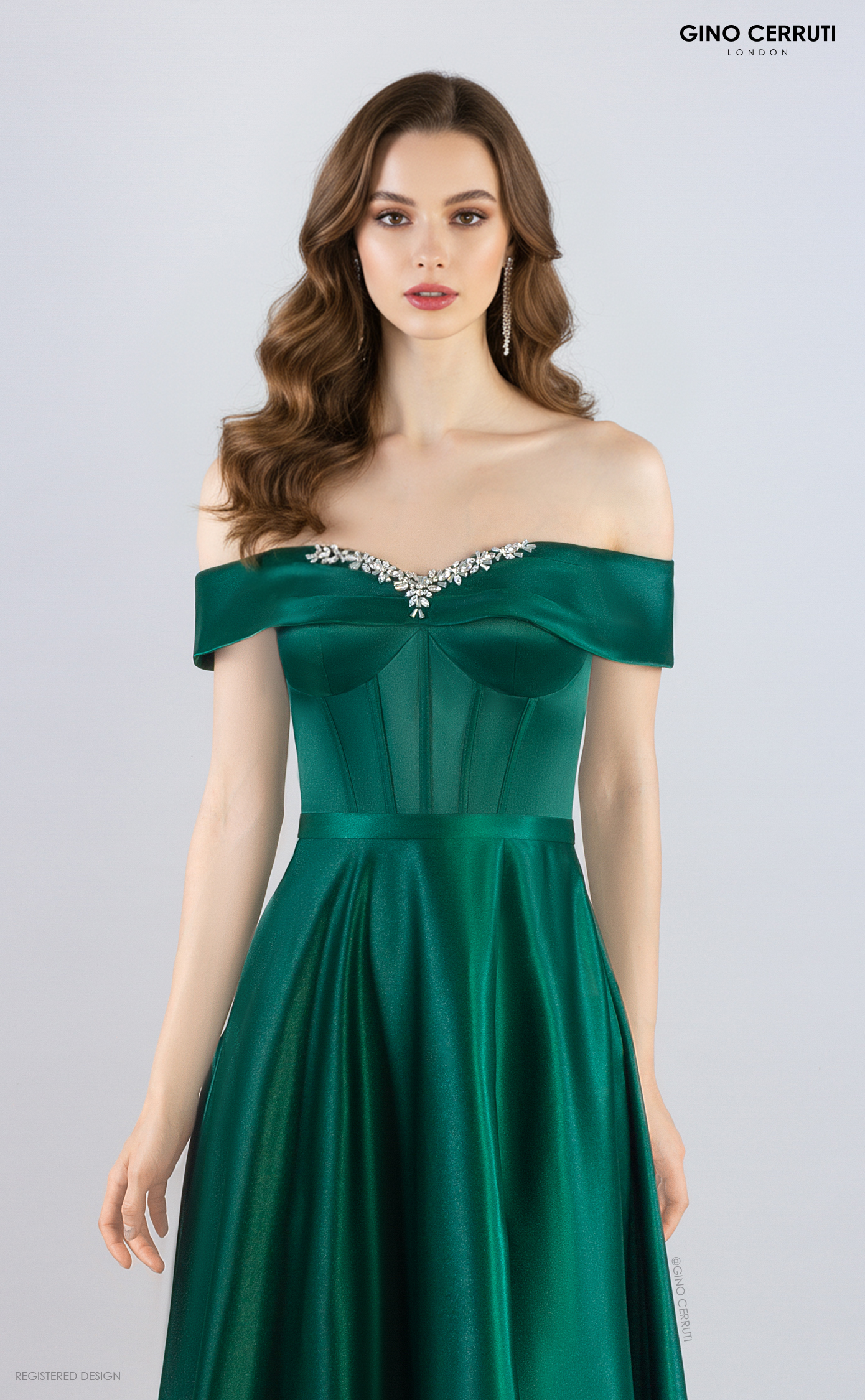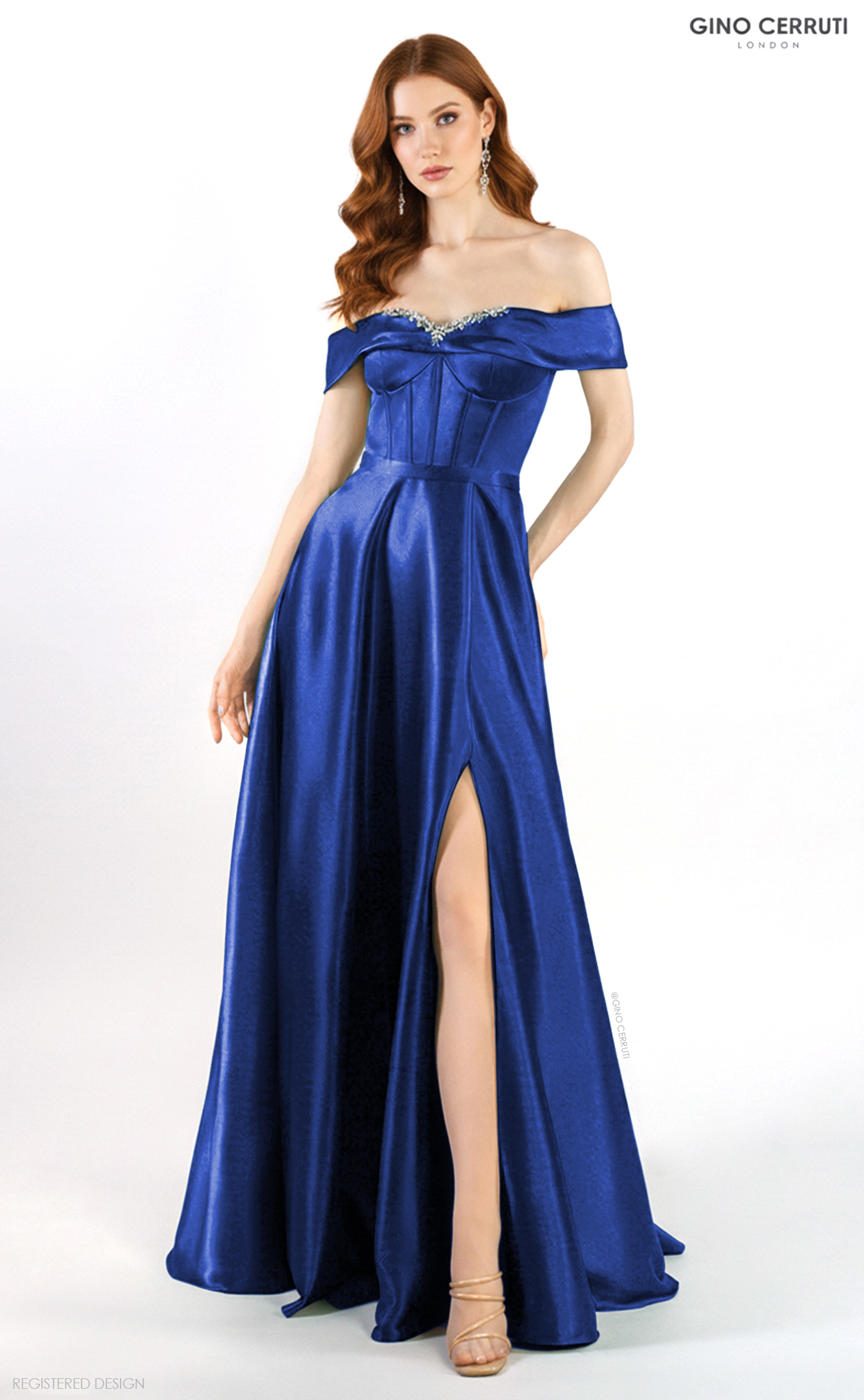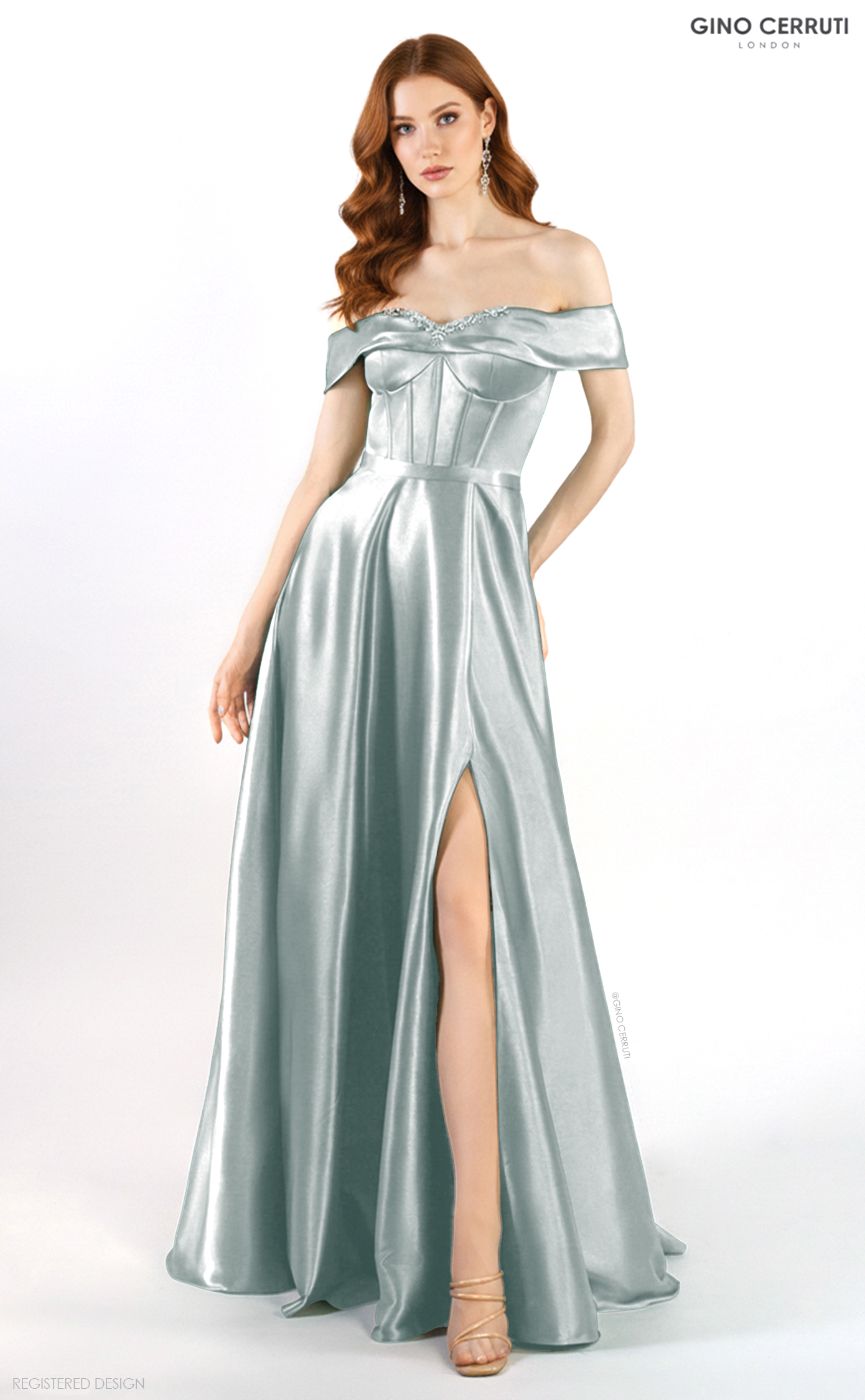 This is THE most elegant dress! The voluminous skirt is perfectly complemented by a stylish corset that pulls in the waist. Crafted from glimmering Duchess Satin, it cascades effortlessly down the body. The unique off-shoulder neckline enhances the shoulders, finished with a touch of sparkle from the sequined bust detail. * Off-shoulder with beading * Corset bodice * Belt * A-Line pleated skirt * Leg slit