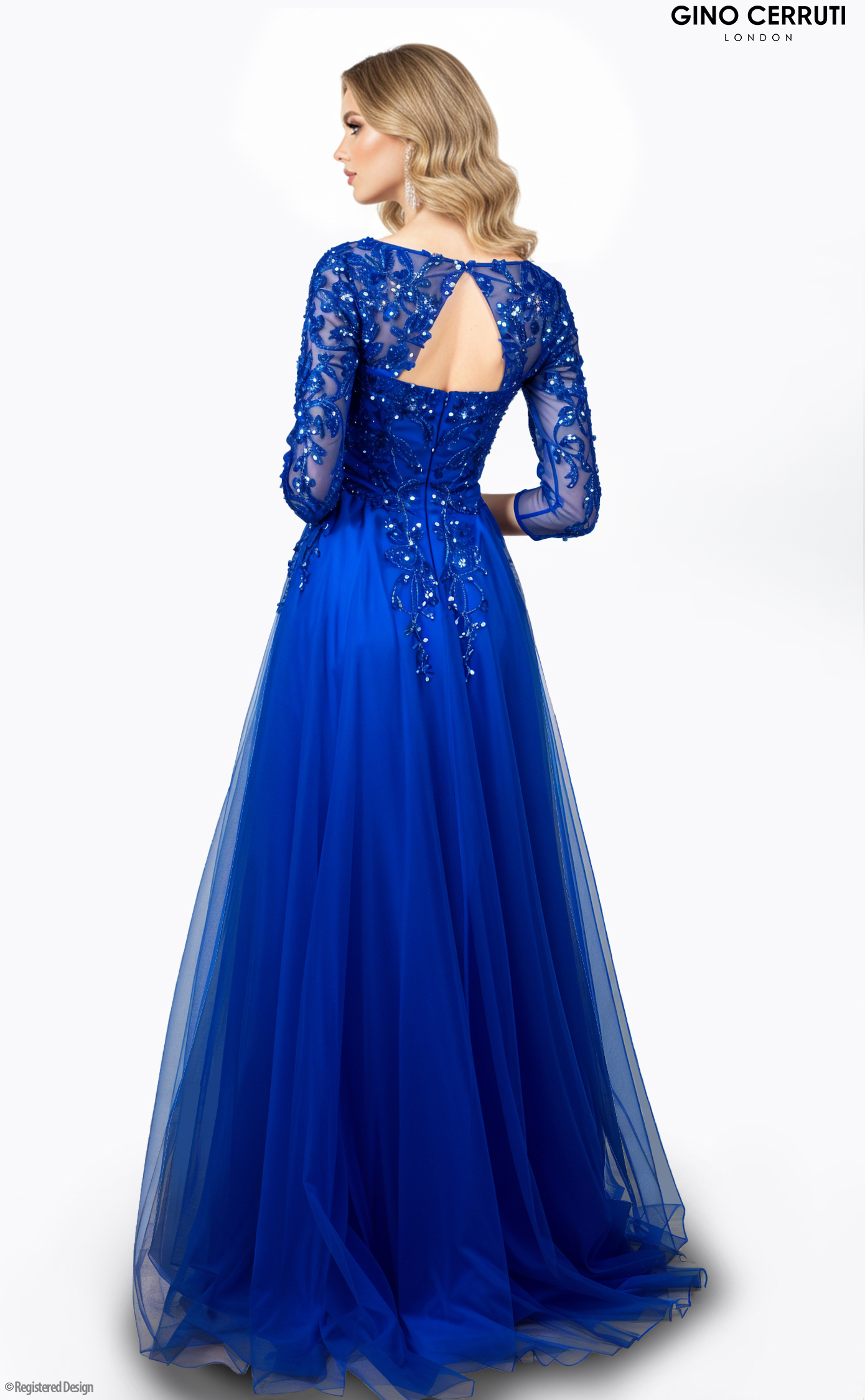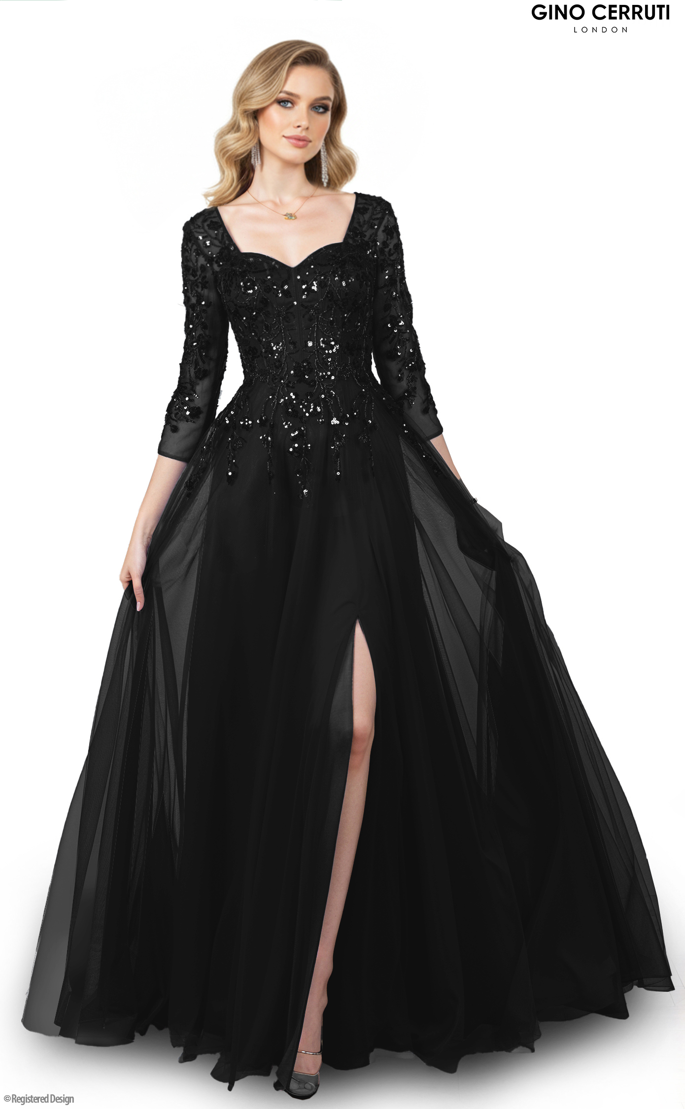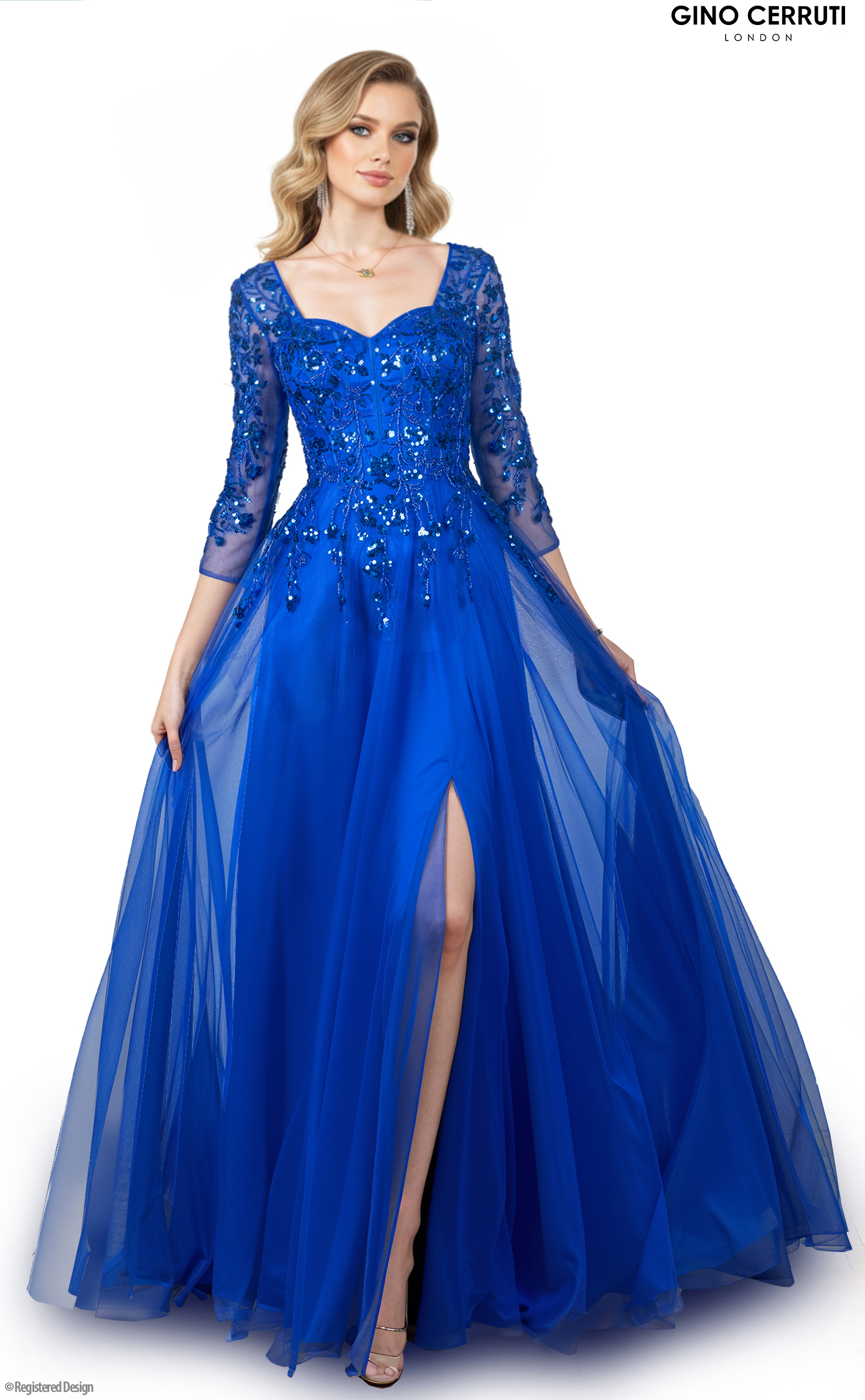 Step into sophistication with this stunning gown featuring a sweetheart neck and elegant 3/4 lace sleeves that add a touch of romance. The sparkling appliqué bodice catches the light beautifully, while the leg slit offers a daring edge. With a chic cutout back, this dress is perfect for making a memorable impression at any formal event! * Sweetheart neck * 3/4 lace sleeves * Sparkling applique bodice * Leg slit * Cutout back