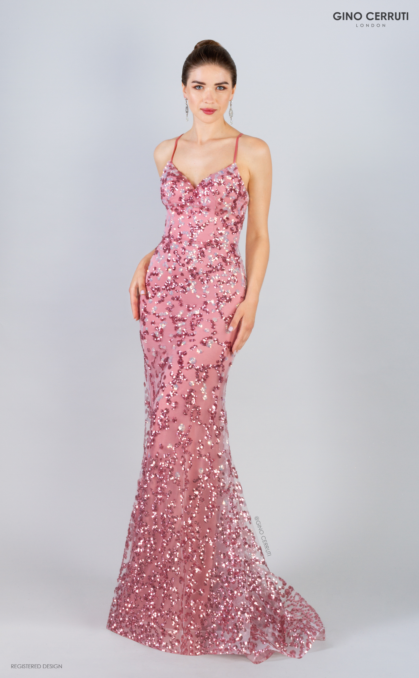 A real showstopper! This fully gown is dripping head to toe with glamour, featuring two-tone sequins and a delicate neckline . A dress that is made to fit your body perfectly, with delicate spaghetti straps that connect to a tie up back, adjusting to fit your unique shape. the trumpet skirt and train make this the perfect outfit for a big event- available in shades of gold and pink. • Spaghetti strap • Lace-up back • Full trumpet skirt • Train • Floor length • Sweetheart neckline