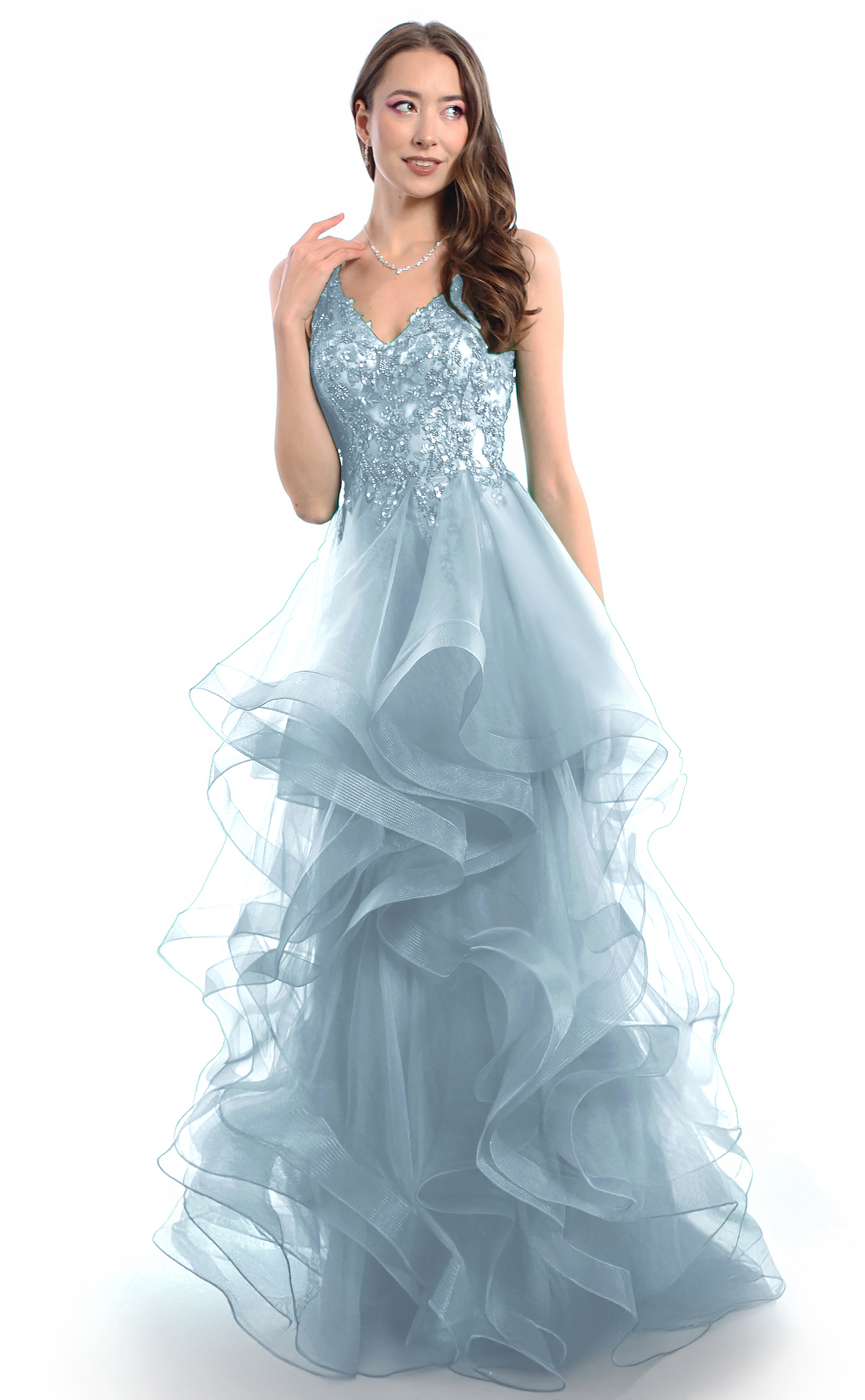 Step into a world of enchantment with our Floral-Embellished Tulle Prom & Evening Dress. The exquisite bodice features intricate floral embellishments, capturing the essence of elegance and grace. Delicate blooms flow onto the layered sparkling skirt, creating a captivating silhouette that gracefully floats with every step. * V-Neck * Floral beaded bodice * Tulle Layered Skirt * Zip up back