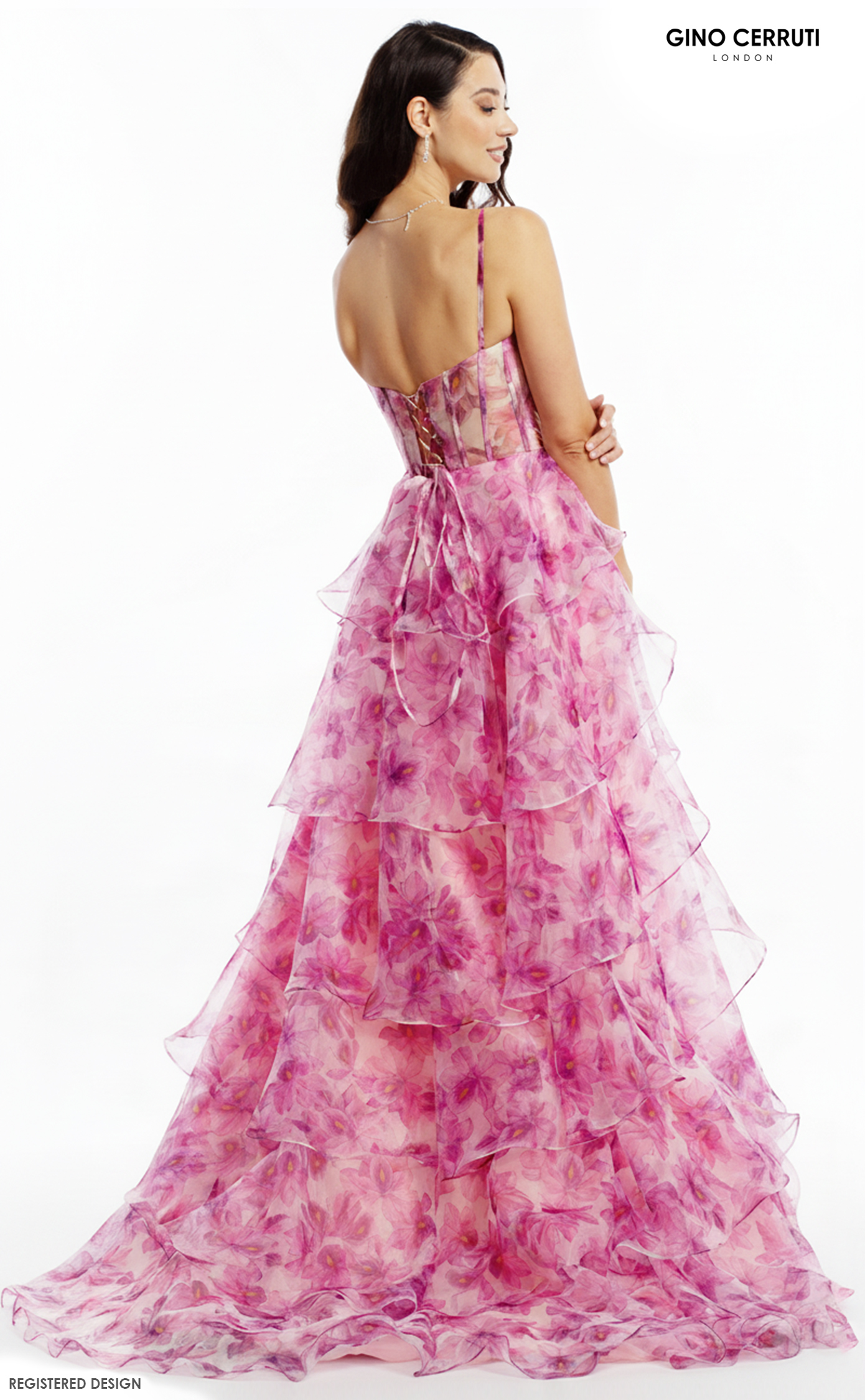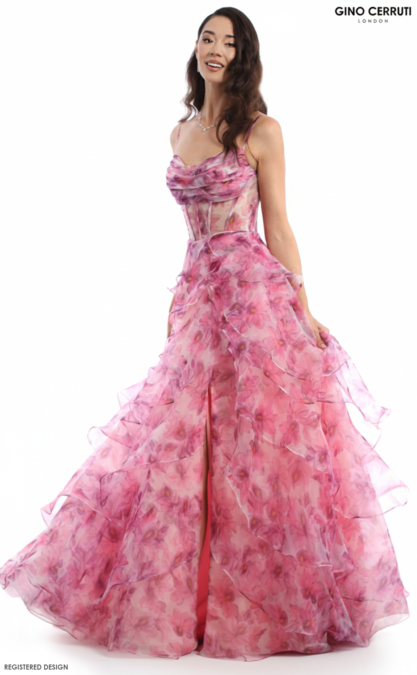 Step into a garden of elegance with this enchanting gown featuring a delicate floral print and a stylish cowl neck. The pleated bust adds texture, while the layered skirt flows gracefully with a daring leg slit. Complete with a chic lace-up back, this dress is perfect for making a stunning impression! * Floral print * Cowl neck * Pleated bust * Layered skirt * Leg slit * Lace up back