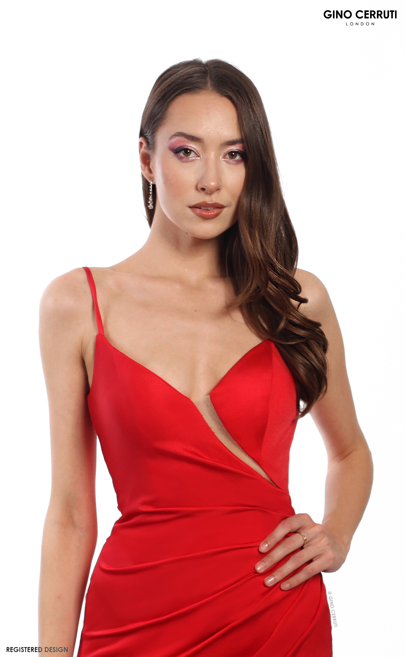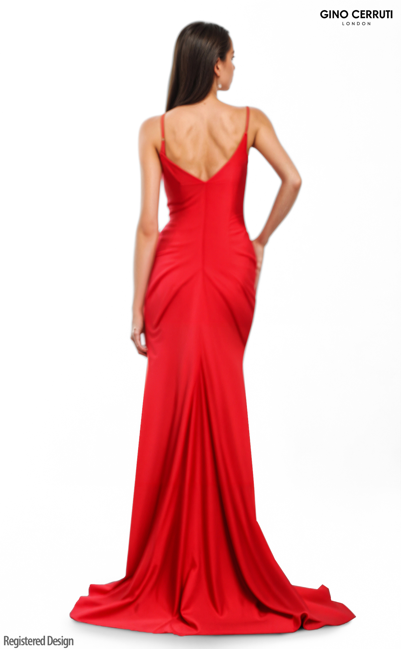 Step into elegance with this stunning gown featuring a deep V neck and illusion cutout that adds a modern twist. The gathered waist beautifully defines your silhouette, while the leg slit and long train create a dramatic effect. Perfect for making a memorable entrance at any formal event! * V neck * Illusion cutout * Gathered waist * Leg slit * Long train