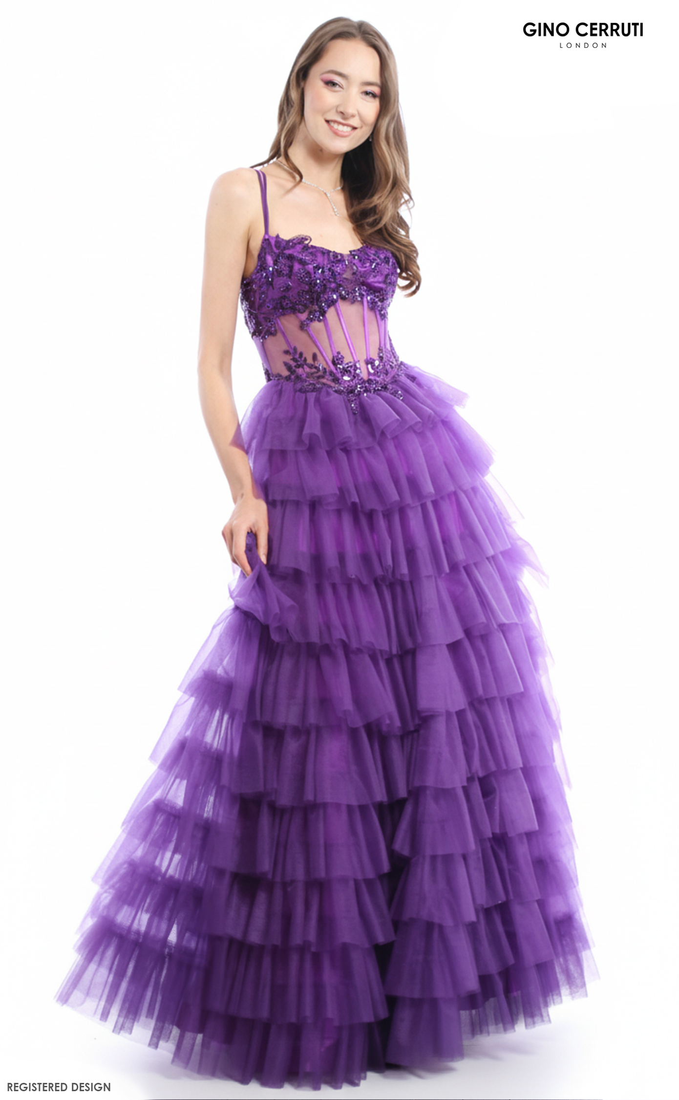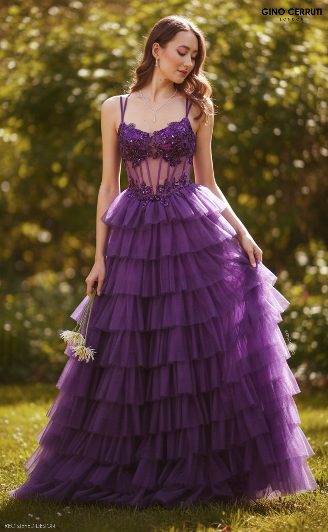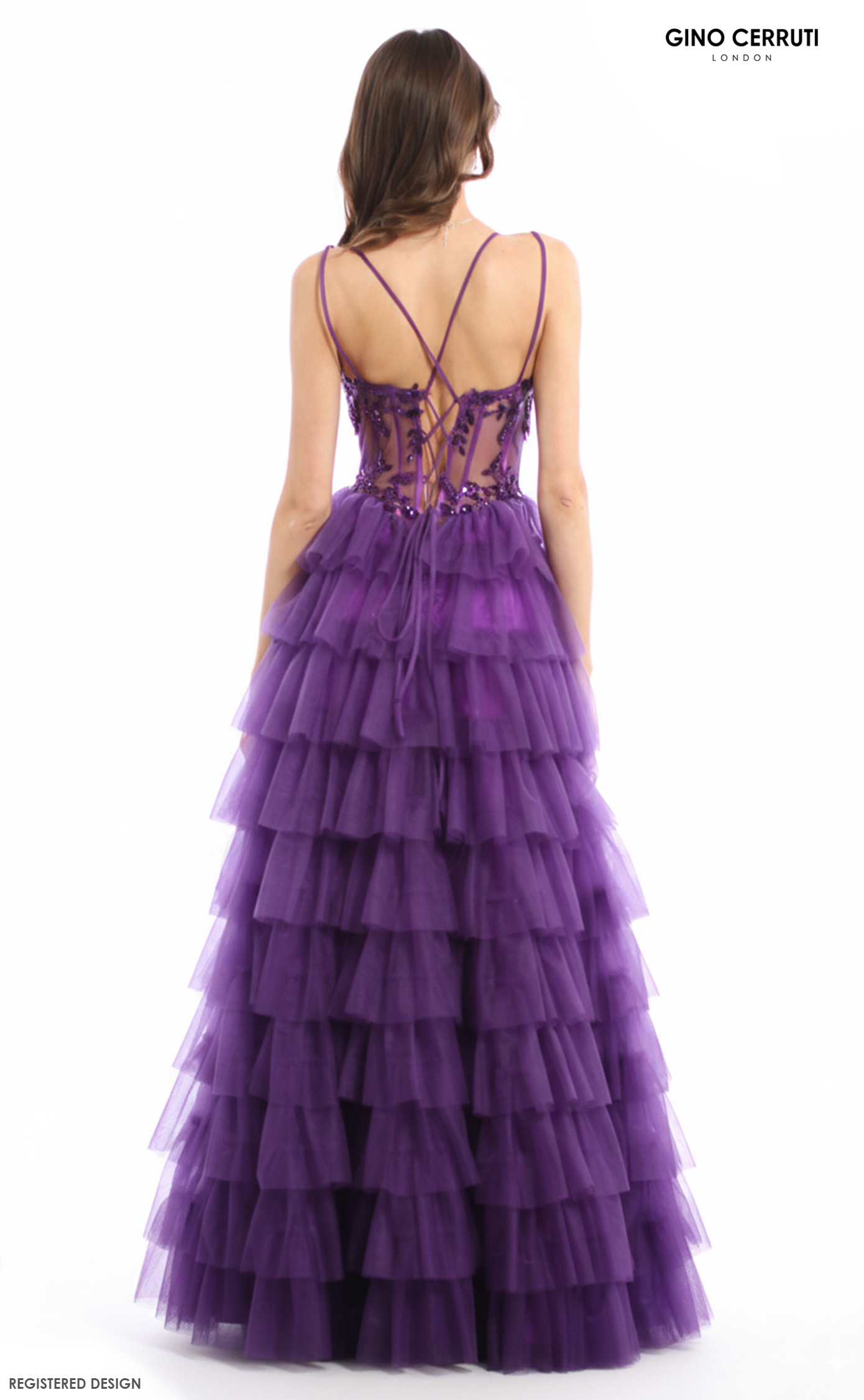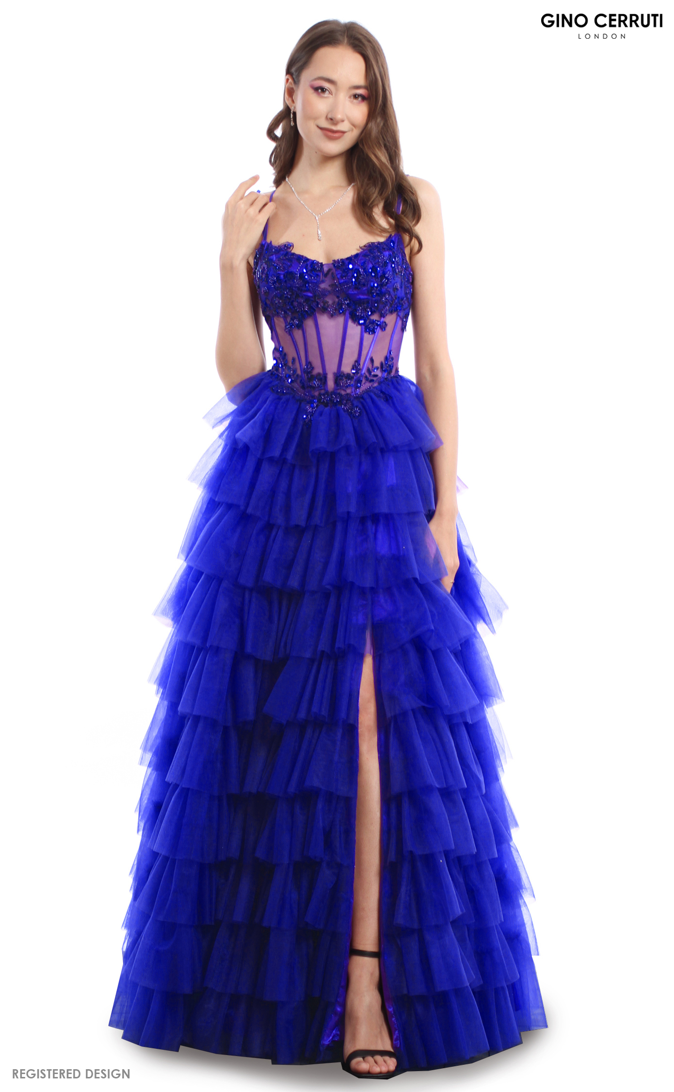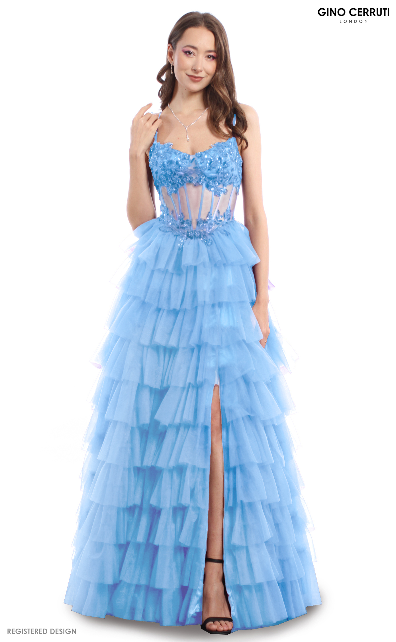 This enchanting ballgown features a corset top with intricate appliqué detailing on the bust and waistline, complemented by double straps. The layered tulle skirt adds volume and elegance, while a stylish leg slit enhances movement, making it perfect for prom or formal events. * Corset top * Double straps * Applique bust and waistline * Layered tulle skirt * Leg slit * Lace up back