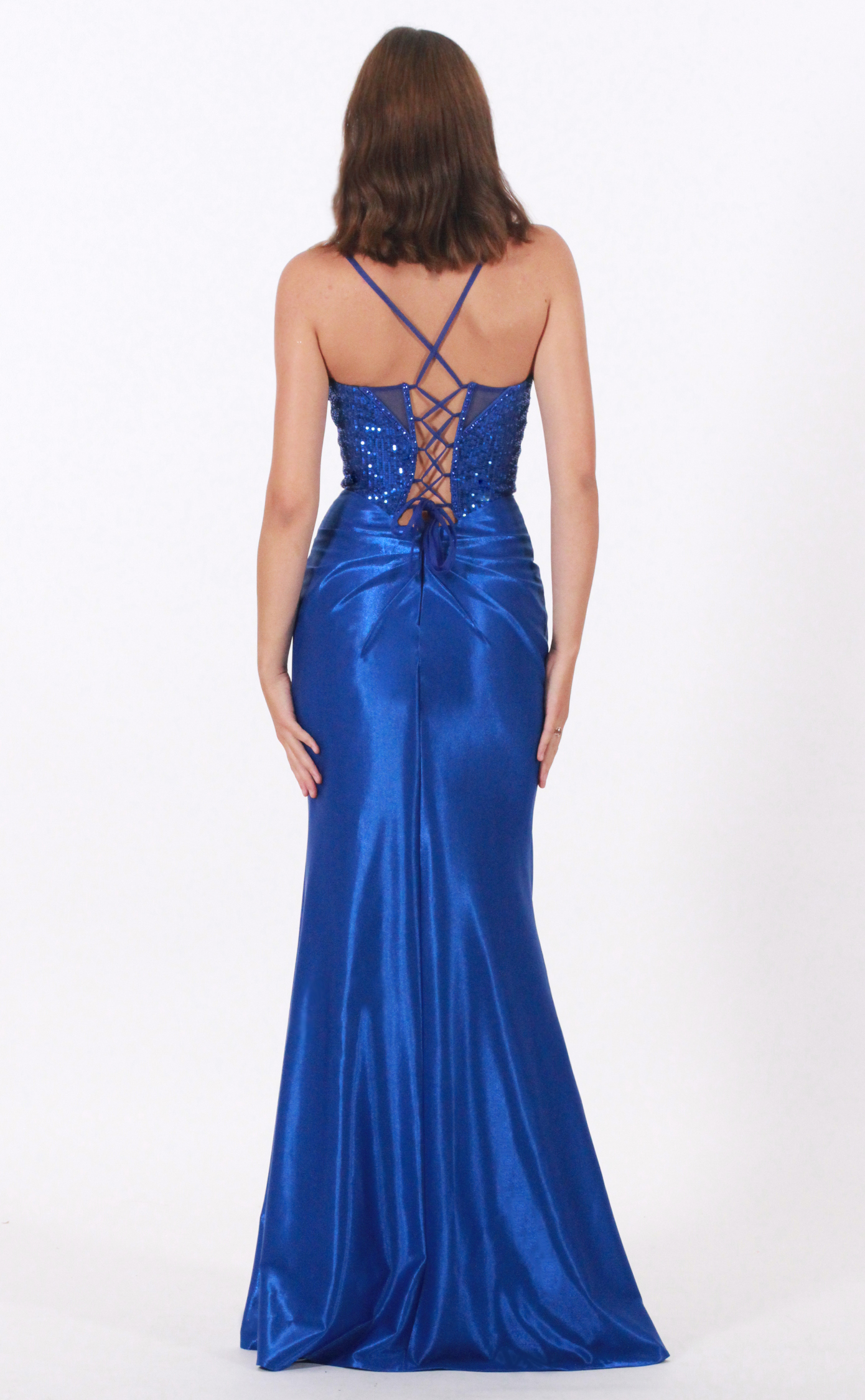 This captivating gown features a chic V-neckline adorned with sparkling bust details, ensuring a stunning visual impact. The sheer corset bodice provides a flattering fit, while the elegant leg slit adds a touch of allure. Finished with a lace-up back for adjustable comfort, this dress is perfect for making a statement at any formal occasion. * V neck * Sparkling bust * Corset top * Accented waist * Leg slit * Lace up back