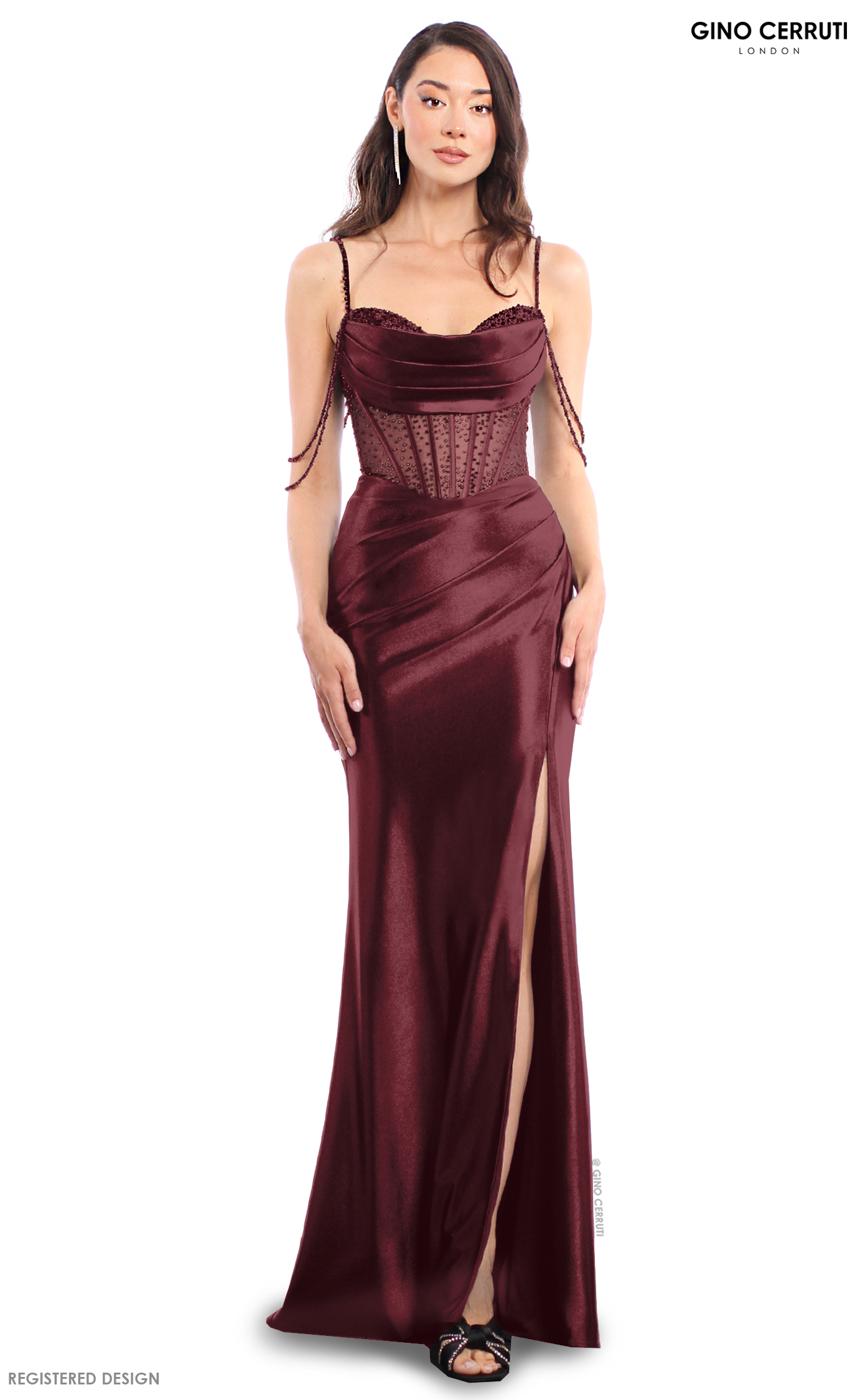 This exquisite dress features draped beaded straps and stunning beading detail on the cowl neck pleated bust, complemented by a fitted beaded corset bodice. The stylish leg slit adds allure, making this gown perfect for prom or any formal event where you want to feel glamorous and confident. * Draped beaded straps * Cowl neck * Pleated bust * Beaded corset top * Leg slit * Lace up back
