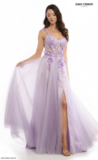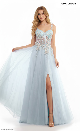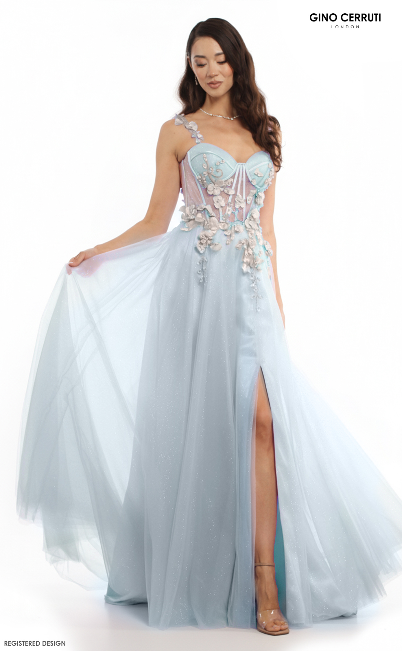 Turn heads in this super unique and feminine gown, designed to make a lasting impression. Featuring a stunning sweetheart corset bodice adorned with delicate 3D flowers for a touch of romance, the matching straps create a seamless look. The soft floor-length tulle skirt flows elegantly, complete with a subtle split for added allure. * Sweetheart neckline * Corset bodice * 3D flowers * Floral straps * Leg split * Small train