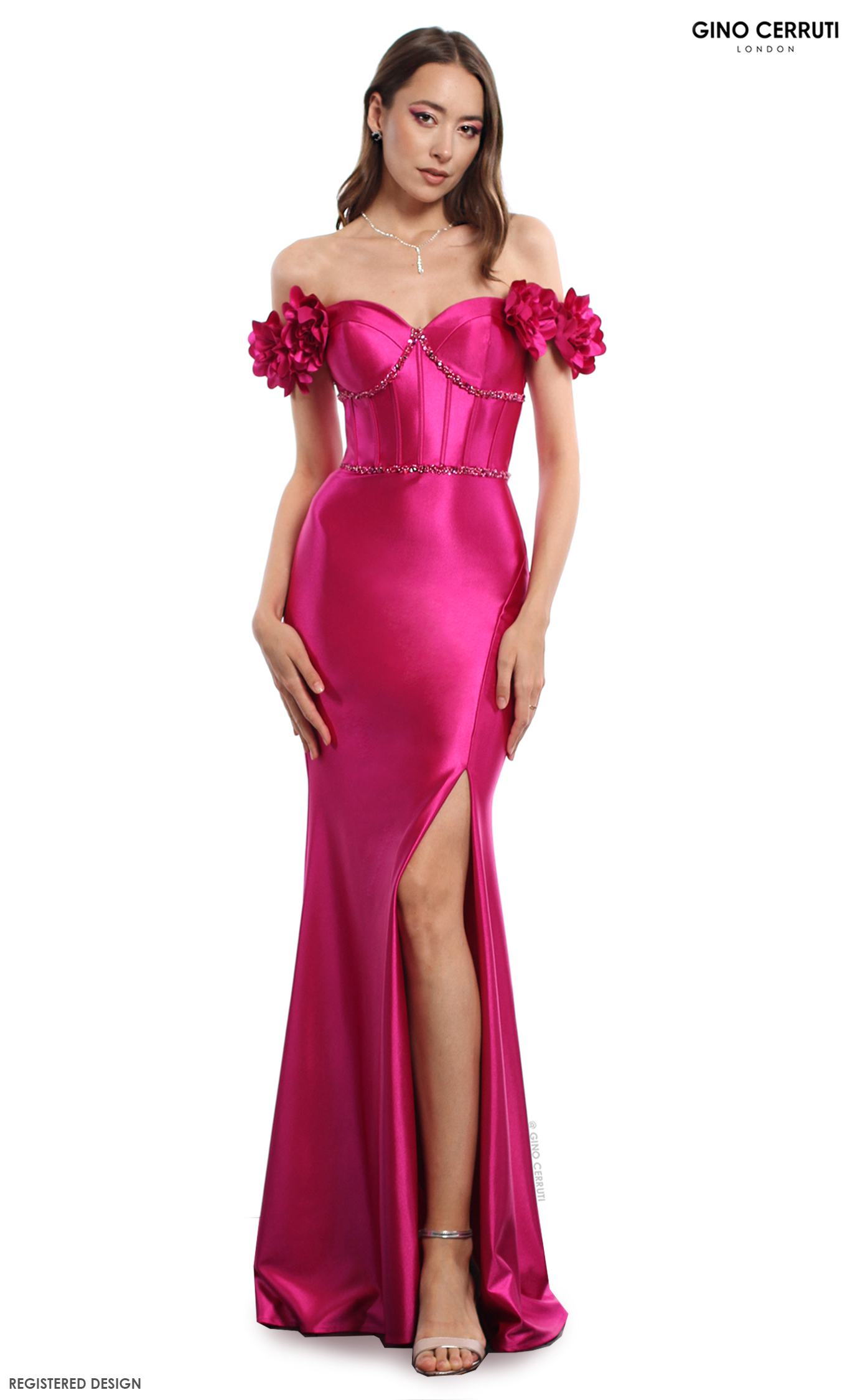 Stunning satin fitted off-shoulder gown, designed to captivate. The dress features a beautifully structured corset top with exquisite beading under the bust and around the waist, enhancing your silhouette. Delicate 3D flower straps add a unique and feminine touch, while the daring leg slit offers a hint of allure. * Off-shoulder * 3D flower straps * Corset top * Beading details * Leg slit * Lace up back